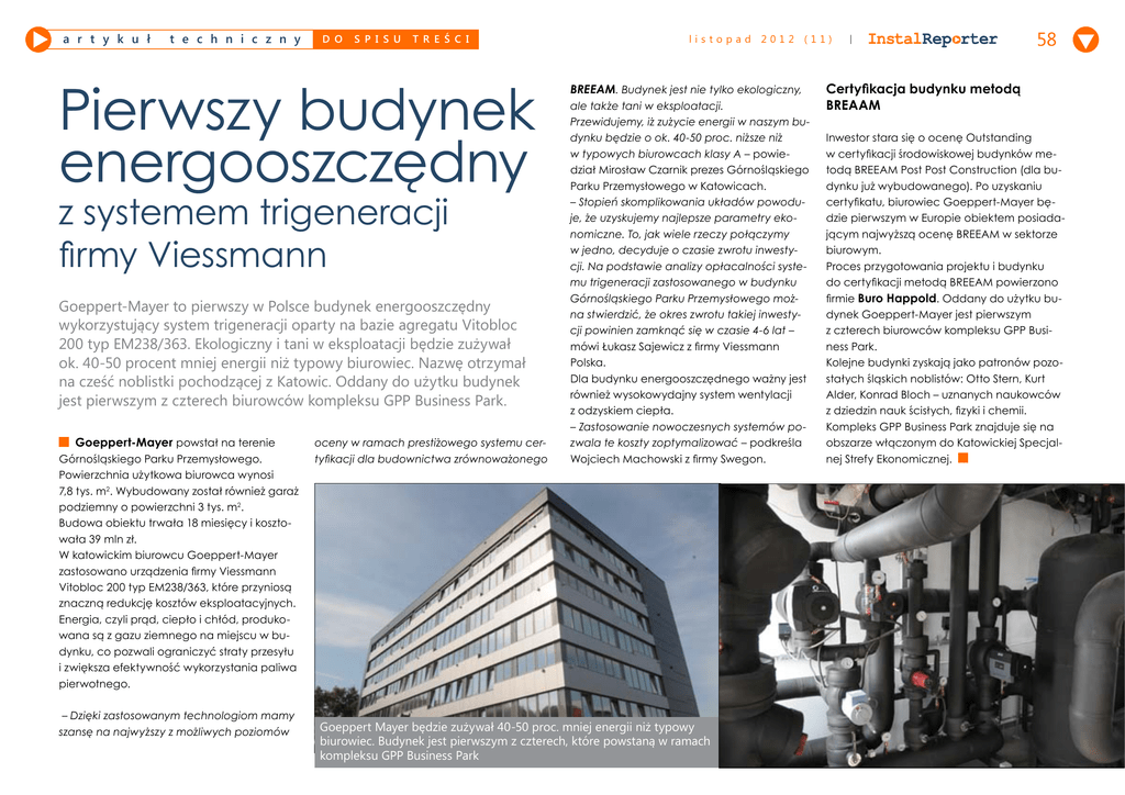 a r t y k u ł t e c h n i c z n y d o s p i s u t r e ś c i Pierwszy budynek energooszczędny z systemem trigeneracji firmy Viessmann Goeppert-Mayer to pierwszy w Polsce budynek energooszczędny wykorzystujący system trigeneracji oparty na bazie agregatu Vitobloc 200 typ EM238/363. Ekologiczny i tani w eksploatacji będzie zużywał ok. 40-50 procent mniej energii niż typowy biurowiec. Nazwę otrzymał na cześć noblistki pochodzącej z Katowic. Oddany do użytku budynek jest pierwszym z czterech biurowców kompleksu GPP Business Park. Goeppert-Mayer powstał na terenie Górnośląskiego Parku Przemysłowego. Powierzchnia użytkowa biurowca wynosi 7,8 tys. m2. Wybudowany został również garaż podziemny o powierzchni 3 tys. m2. Budowa obiektu trwała 18 miesięcy i kosztowała 39 mln zł. W katowickim biurowcu Goeppert-Mayer zastosowano urządzenia firmy Viessmann Vitobloc 200 typ EM238/363, które przyniosą znaczną redukcję kosztów eksploatacyjnych. Energia, czyli prąd, ciepło i chłód, produkowana są z gazu ziemnego na miejscu w budynku, co pozwali ograniczyć straty przesyłu i zwiększa efektywność wykorzystania paliwa pierwotnego. – Dzięki zastosowanym technologiom mamy szansę na najwyższy z możliwych poziomów oceny w ramach prestiżowego systemu certyfikacji dla budownictwa zrównoważonego listopad 2012 (11) BREEAM. Budynek jest nie tylko ekologiczny, ale także tani w eksploatacji. Przewidujemy, iż zużycie energii w naszym budynku będzie o ok. 40-50 proc. niższe niż w typowych biurowcach klasy A – powiedział Mirosław Czarnik prezes Górnośląskiego Parku Przemysłowego w Katowicach. – Stopień skomplikowania układów powoduje, że uzyskujemy najlepsze parametry ekonomiczne. To, jak wiele rzeczy połączymy w jedno, decyduje o czasie zwrotu inwestycji. Na podstawie analizy opłacalności systemu trigeneracji zastosowanego w budynku Górnośląskiego Parku Przemysłowego można stwierdzić, że okres zwrotu takiej inwestycji powinien zamknąć się w czasie 4-6 lat – mówi Łukasz Sajewicz z firmy Viessmann Polska. Dla budynku energooszczędnego ważny jest również wysokowydajny system wentylacji z odzyskiem ciepła. – Zastosowanie nowoczesnych systemów pozwala te koszty zoptymalizować – podkreśla Wojciech Machowski z firmy Swegon. Goeppert Mayer będzie zużywał 40-50 proc. mniej energii niż typowy biurowiec. Budynek jest pierwszym z czterech, które powstaną w ramach kompleksu GPP Business Park 58 Certyfikacja budynku metodą BREAAM Inwestor stara się o ocenę Outstanding w certyfikacji środowiskowej budynków metodą BREEAM Post Post Construction (dla budynku już wybudowanego). Po uzyskaniu certyfikatu, biurowiec Goeppert-Mayer będzie pierwszym w Europie obiektem posiadającym najwyższą ocenę BREEAM w sektorze biurowym. Proces przygotowania projektu i budynku do certyfikacji metodą BREEAM powierzono firmie Buro Happold. Oddany do użytku budynek Goeppert-Mayer jest pierwszym z czterech biurowców kompleksu GPP Business Park. Kolejne budynki zyskają jako patronów pozostałych śląskich noblistów: Otto Stern, Kurt Alder, Konrad Bloch – uznanych naukowców z dziedzin nauk ścisłych, fizyki i chemii. Kompleks GPP Business Park znajduje się na obszarze włączonym do Katowickiej Specjalnej Strefy Ekonomicznej.