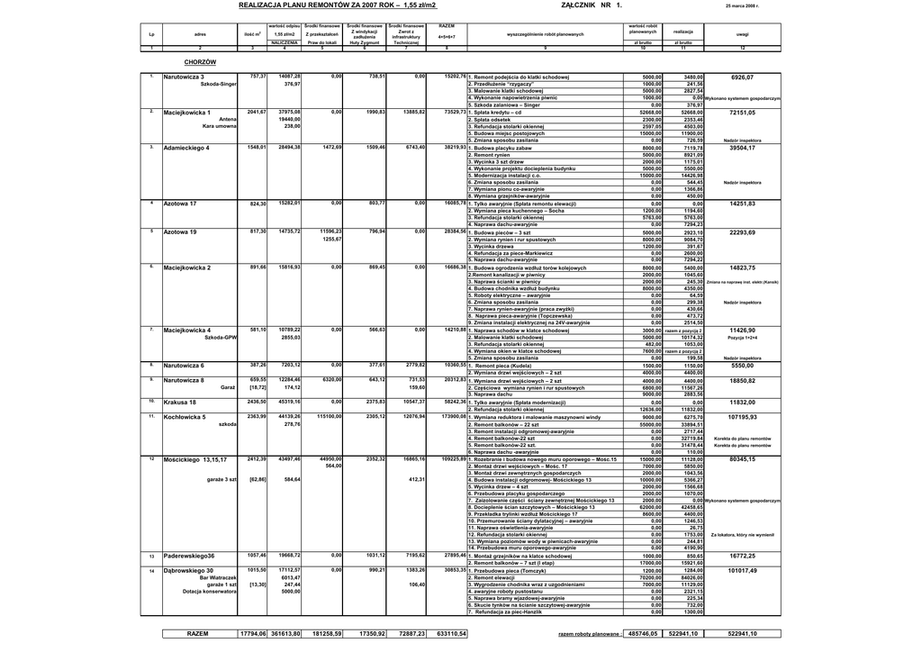 REALIZACJA PLANU REMONTÓW ZA 2007 ROK – 1,55 zł/m2 wartość odpisu Środki finansowe Lp adres 1 2 ilość m2 1,55 zł/m2 Z przekształceń 3 NALICZENIA 4 Praw do lokali 5 Środki finansowe Z windykacji zadłużenia Huty Zygmunt 6 Środki finansowe Zwrot z infrastruktury Technicznej 7 ZĄŁCZNIK NR 1. RAZEM 4+5+6+7 8 wyszczególnienie robót planowanych 9 25 marca 2008 r. wartość robót planowanych realizacja zł brutto 10 zł brutto 11 uwagi 12 CHORZÓW 1. 757,37 Narutowicza 3 Szkoda-Singer 2. Antena Kara umowna 3. 738,51 0,00 37975,08 0,00 1990,83 13885,82 1472,69 1509,46 6743,40 19440,00 238,00 1548,01 Adamieckiego 4 0,00 376,97 2041,67 Maciejkowicka 1 14087,28 28494,38 15202,76 1. Remont podejścia do klatki schodowej 2. Przedłużenie “rzygaczy” 3. Malowanie klatki schodowej 4. Wykonanie napowietrzenia piwnic 5. Szkoda zalaniowa – Singer 73529,73 1. Spłata kredytu – cd 2. Spłata odsetek 3. Refundacja stolarki okiennej 5. Budowa miejsc postojowych 5. Zmiana sposobu zasilania 38219,93 1. Budowa placyku zabaw 2. Remont rynien 3. Wycinka 3 szt drzew 4. Wykonanie projektu docieplenia budynku 5. Modernizacja instalacji c.o. 6. Zmiana sposobu zasilania 7. Wymiana pionu co-awaryjnie 8. Wymiana grzejników-awaryjnie 4 Azotowa 17 824,30 15282,01 0,00 803,77 0,00 5 Azotowa 19 817,30 14735,72 11596,23 796,94 0,00 16085,78 1. Tylko awaryjnie (Spłata remontu elewacji) 2. Wymiana pieca kuchennego – Socha 3. Refundacja stolarki okiennej 4. Naprawa dachu-awaryjnie 28384,56 1. Budowa pieców – 3 szt 1255,67 6. 7. 891,66 Maciejkowicka 2 581,10 Maciejkowicka 4 Szkoda-GPW 8. Narutowicza 6 9. Narutowicza 8 Garaż 15816,93 10789,22 0,00 0,00 2. Wymiana rynien i rur spustowych 3. Wycinka drzewa 4. Refundacja za piece-Markiewicz 5. Naprawa dachu-awaryjnie 869,45 566,63 0,00 0,00 2855,03 2. Malowanie klatki schodowej 3. Refundacja stolarki okiennej 4. Wymiana okien w klatce schodowej 5. Zmiana sposobu zasilania 387,26 7203,12 0,00 377,61 6320,00 643,12 659,55 12284,46 [18,72] 174,12 2779,82 731,53 Krakusa 18 2436,50 45319,16 0,00 2375,83 10547,37 11. Kochłowicka 5 2363,99 44139,26 115100,00 2305,12 12076,94 44950,00 564,00 2352,32 16865,16 szkoda Mościckiego 13,15,17 garaże 3 szt 278,76 2412,39 43497,46 [62,86] 584,64 412,31 13 Paderewskiego36 1057,46 19668,72 0,00 1031,12 7195,62 14 Dąbrowskiego 30 1015,50 17112,57 0,00 990,21 1383,26 [13,30] 6013,47 247,44 5000,00 Bar Wiatraczek garaże 1 szt Dotacja konserwatora RAZEM 17794,06 361613,80 10360,55 1. Remont pieca (Kudela) 2. Wymiana drzwi wejściowych – 2 szt 20312,83 1. Wymiana drzwi wejściowych – 2 szt 159,60 10. 12 16686,38 1. Budowa ogrodzenia wzdłuż torów kolejowych 2.Remont kanalizacji w piwnicy 3. Naprawa ścianki w piwnicy 4. Budowa chodnika wzdłuż budynku 5. Roboty elektryczne – awaryjnie 6. Zmiana sposobu zasilania 7. Naprawa rynien-awaryjnie (praca zwyżki) 8. Naprawa pieca-awaryjnie (Topczewska) 9. Zmiana instalacji elektrycznej na 24V-awaryjnie 14210,88 1. Naprawa schodów w klatce schodowej 106,40 181258,59 17350,92 72887,23 2. Częściowa wymiana rynien i rur spustowych 3. Naprawa dachu 58242,36 1. Tylko awaryjnie (Spłata modernizacji) 2. Refundacja stolarki okiennej 173900,08 1. Wymiana reduktora i malowanie maszynowni windy 2. Remont balkonów – 22 szt 3. Remont instalacji odgromowej-awaryjnie 4. Remont balkonów-22 szt 5. Remont balkonów-22 szt. 6. Naprawa dachu -awaryjnie 109225,89 1. Rozebranie i budowa nowego muru oporowego – Mośc.15 2. Montaż drzwi wejściowych – Mośc. 17 3. Montaż drzwi zewnętrznych gospodarczych 4. Budowa instalacji odgromowej- Mościckiego 13 5. Wycinka drzew – 4 szt 6. Przebudowa placyku gospodarczego 7. Zaizolowanie części ściany zewnętrznej Mościckiego 13 8. Docieplenie ścian szczytowych – Mościckiego 13 9. Przekładka trylinki wzdłuż Mościckiego 17 10. Przemurowanie ściany dylatacyjnej – awaryjnie 11. Naprawa oświetlenia-awaryjnie 12. Refundacja stolarki okiennej 13. Wymiana poziomów wody w piwnicach-awaryjnie 14. Przebudowa muru oporowego-awaryjnie 27895,46 1. Montaż grzejników na klatce schodowej 2. Remont balkonów – 7 szt (I etap) 30853,35 1. Przebudowa pieca (Tomczyk) 2. Remont elewacji 3. Wygrodzenie chodnika wraz z uzgodnieniami 4. awaryjne roboty pustostanu 5. Naprawa bramy wjazdowej-awaryjnie 6. Skucie tynków na ścianie szczytowej-awaryjnie 7. Refundacja za piec-Hanzlik 633110,54 razem roboty planowane : 5000,00 1000,00 5000,00 1000,00 0,00 52668,00 2300,00 2597,05 15000,00 0,00 3480,00 6926,07 241,56 2827,54 0,00 Wykonano systemem gospodarczym 376,97 52668,00 72151,05 2353,46 4503,00 11900,00 726,59 Nadzór inspektora 8000,00 5000,00 2000,00 5000,00 15000,00 0,00 0,00 0,00 7119,78 8921,09 1175,01 5500,00 14426,98 544,45 1366,86 450,00 0,00 1200,00 5763,00 0,00 0,00 1194,60 5763,00 7294,23 14251,83 5000,00 8000,00 1200,00 0,00 0,00 2923,10 9084,70 391,67 2600,00 7294,22 22293,69 8000,00 2000,00 2000,00 8000,00 0,00 0,00 0,00 0,00 0,00 5400,00 1045,60 245,30 4350,00 64,59 299,38 430,66 473,72 2514,50 3000,00 razem z pozycją 2 5000,00 10174,32 482,00 1053,00 7600,00 razem z pozycją 2 0,00 199,58 39504,17 Nadzór inspektora 14823,75 Zmiana na naprawę inst. elektr.(Kansik) Nadzór inspektora 11426,90 Pozycja 1+2+4 Nadzór inspektora 1500,00 4000,00 1150,00 4400,00 5550,00 4000,00 6800,00 9000,00 4400,00 11567,26 2883,56 18850,82 0,00 12636,00 0,00 11832,00 11832,00 9000,00 55000,00 0,00 0,00 0,00 0,00 15000,00 7000,00 2000,00 10000,00 2000,00 2000,00 2000,00 62000,00 8600,00 0,00 0,00 0,00 0,00 0,00 107195,93 6275,70 33894,51 2717,44 32719,84 Korekta do planu remontów 31478,44 Korekta do planu remontów 110,00 80345,15 11128,00 5850,00 1043,56 5366,27 1566,68 1070,00 0,00 Wykonano systemem gospodarczym 42458,65 4400,00 1246,53 26,75 1753,00 Za lokatora, który nie wymienił 244,81 4190,90 1000,00 17000,00 850,65 15921,60 1284,00 84026,00 11129,00 2321,15 225,34 732,00 1300,00 1200,00 70200,00 7000,00 0,00 0,00 0,00 0,00 485746,05