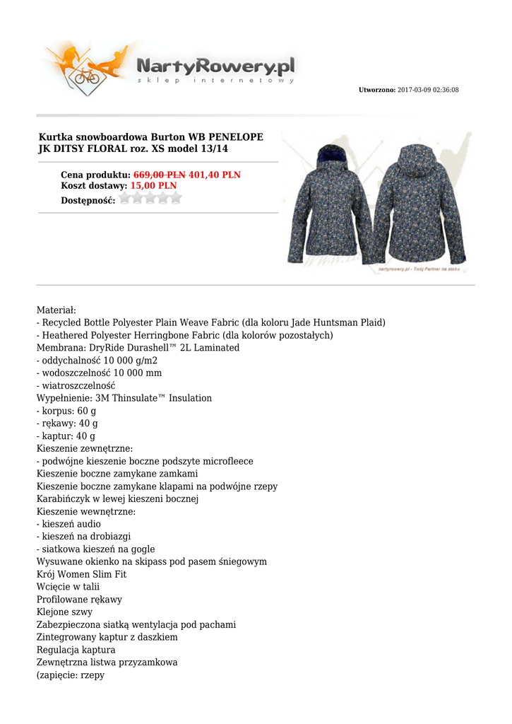Utworzono: 2017-03-09 02:36:08 Kurtka snowboardowa Burton WB PENELOPE JK DITSY FLORAL roz. XS model 13/14 Cena produktu: 669,00 PLN 401,40 PLN Koszt dostawy: 15,00 PLN Dostępność: Materiał: - Recycled Bottle Polyester Plain Weave Fabric (dla koloru Jade Huntsman Plaid) - Heathered Polyester Herringbone Fabric (dla kolorów pozostałych) Membrana: DryRide Durashell™ 2L Laminated - oddychalność 10 000 g/m2 - wodoszczelność 10 000 mm - wiatroszczelność Wypełnienie: 3M Thinsulate™ Insulation - korpus: 60 g - rękawy: 40 g - kaptur: 40 g Kieszenie zewnętrzne: - podwójne kieszenie boczne podszyte microfleece Kieszenie boczne zamykane zamkami Kieszenie boczne zamykane klapami na podwójne rzepy Karabińczyk w lewej kieszeni bocznej Kieszenie wewnętrzne: - kieszeń audio - kieszeń na drobiazgi - siatkowa kieszeń na gogle Wysuwane okienko na skipass pod pasem śniegowym Krój Women Slim Fit Wcięcie w talii Profilowane rękawy Klejone szwy Zabezpieczona siatką wentylacja pod pachami Zintegrowany kaptur z daszkiem Regulacja kaptura Zewnętrzna listwa przyzamkowa (zapięcie: rzepy Wewnętrzna listwa przyzamkowa Ochraniacz brody Zintegrowany pas śniegowy na Lycrze Pętle na zatrzaski do spięcia ze spodniami Regulacja dolnego obwodu kurtki (także z wnętrza kieszeni bocznych) Makiety na rzepy Zamki YKK® Vislon Nosi się tak dobrze jak dobrze wygląda i doskonale chroni Cię przed niskimi temperaturami i złą pogodą. Penelope to damska kurtka snowboardowa Burton, którą stworzono, by niezależnie od warunków dać Ci niezawodność i maksymalną ochronę. Skrojona tak, byś czuła się w niej doskonale. Uwzględnia damską budowę ciała o węższych ramionach i drobniejszej sylwetce, zapewniając jednocześnie niczym nieograniczony komfort ruchów bez względu na to, czy właśnie jeździsz na desce, czy jesteś na zimowym spacerze. Wodoodporna do 10 tys. mm słupa wody i oddychająca do 10 tys. g/m2/24h dwuwarstwowa membrana DryRide Durashell™ 2L oraz zastosowanie techniki podklejania szwów zapewnią wysoki poziom odporności na wodę i wiatr, a nieco lżejsze w rękawach i kapturze wypełnienie ociepliną Thinsulate skutecznie chroni Cię przed niskimi temperaturami. Gdy temperatura wzrośnie, możesz się pozbyć nadmiaru ciepła za pomocą wentylacji pod pachami. Wygodnie rozmieszczone i praktyczne kieszenie sprawdzą się kiedy pojedziesz na deskę, a także na co dzień. Ciepłe podszycie podwójnych bocznych pozwoli Ci szybko ogrzać zmarzenięte dłonie. W lewej znajdziesz karabinek, dzięki któremu z pewnością nie zgubisz swoich kluczy albo wygodnie przypniesz swoje rękawice, a w wewnętrznych bezpiecznie schowasz na przykład swojego smartfona albo gogle. DryRide™ Durashell 2L to opracowana przez Burtona niezwykle efektywna membrana. DryRide gwarantuje skuteczne zabezpieczenie przed niekorzystnymi warunkami atmosferycznymi, pozwala jednocześnie na zachowanie maksymalnego komfortu termicznego. Wysoka transmisja ciepła i wilgoci pozwala zachować pełnię komfortu w każdej sytuacji. Women Slim Fit to specjalny krój uwzględniający budowę ciała kobiety o węższych ramionach i drobniejszej sylwetce. Zapewnia swobodę ruchów i komfort podczas aktywności na stoku i na co dzień. 3M Thinsulate™ Insulation - Burton poszukiwał dla swojej odzieży wypełnienia, które będzie trwałe, wodoodporne oraz będzie miało bardzo dobrą oddychalność. Jednocześnie wypełnienie nie mogło ograniczać swobody ruchów i czynić z odzieży grubej zbroi. Ocieplina New 3M Thinsulation łączy mikrowłókna z włóknami o luźniejszym splocie, dzięki czemu mniejsza ilość włókien utrzymuje ciepło skuteczniej niż standardowe wypełnienie. YKK® Vislon to nowatorskie rozwiązanie zaproponowane przez światowego lidera zamknięć tekstylnych. Specjalny kształt ząbków zamka zapewnia im po zsunięciu suwakiem idealne przyleganie. W rezultacie przepuszczalność jest zdecydowanie zmniejszona, a zamek jest o wiele bardziej odporny na przesiąknięcia niż inne rozwiązania stosowane w odzieży technicznej i sportowej. Producent Burton Rozmiary XS Wodoodporność 6000-10000 mm Kolory Kolekcja Płeć Czarny, Turkusowy, Biały, Fioletowy zima 2013/14 Damska Adres: http://nartyrowery.pl/ Telefon: 34 365 66 09 Email: [email protected] Gadu-Gadu: Skype: