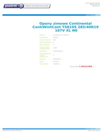 Truck System Stolorz Spacerowa 2B Mysłowice Opony zimowe Continental ContiWintCont TS810S 285/40R19 107V XL N0 Bieżnik: ContiWintCont TS810S Dostępność: 1.0000 Indeks nośności: 107 Indeks prędkości: V Opór toczenia: E Poziom hałasu zewnętrznego: 75dB Producent: CONTINENTAL Przyczepność na mokrej nawierzchni: C Rozmiar: 285/40R19 Sezon: Zimowe Typ pojazdu: Osobowe Cena brutto: http://www.opony-stolorz.pl 1 472,31 PLN sklep internetowy