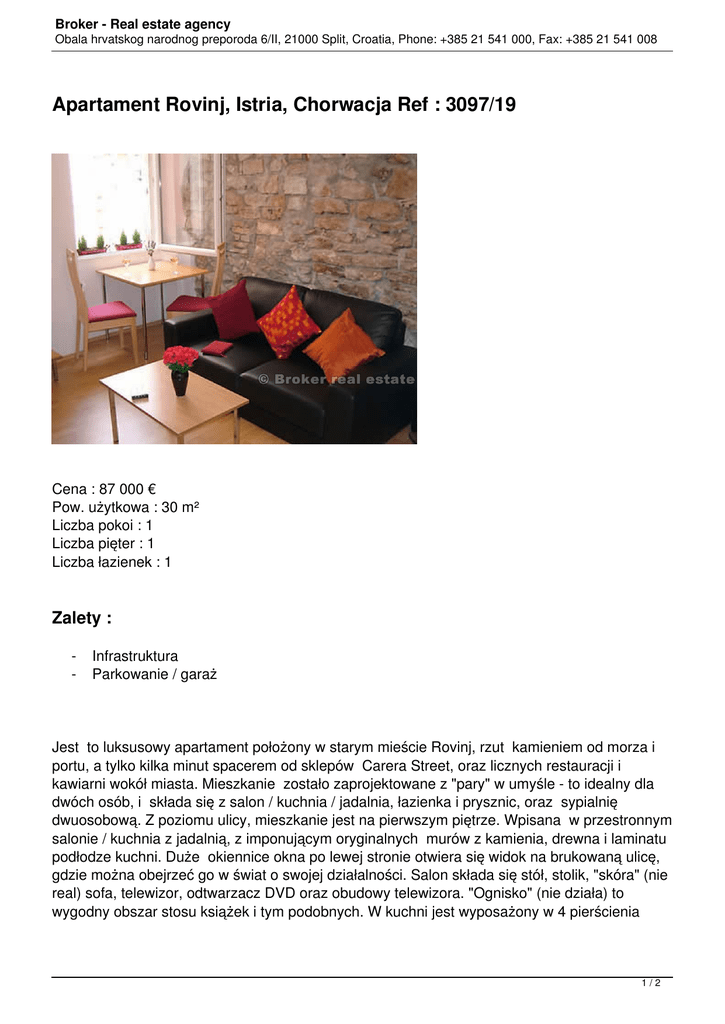 Broker - Real estate agency Obala hrvatskog narodnog preporoda 6/II, 21000 Split, Croatia, Phone: +385 21 541 000, Fax: +385 21 541 008 Apartament Rovinj, Istria, Chorwacja Ref : 3097/19 Cena : 87 000 € Pow. użytkowa : 30 m² Liczba pokoi : 1 Liczba pięter : 1 Liczba łazienek : 1 Zalety : - Infrastruktura Parkowanie / garaż Jest to luksusowy apartament położony w starym mieście Rovinj, rzut kamieniem od morza i portu, a tylko kilka minut spacerem od sklepów Carera Street, oraz licznych restauracji i kawiarni wokół miasta. Mieszkanie zostało zaprojektowane z "pary" w umyśle - to idealny dla dwóch osób, i składa się z salon / kuchnia / jadalnia, łazienka i prysznic, oraz sypialnię dwuosobową. Z poziomu ulicy, mieszkanie jest na pierwszym piętrze. Wpisana w przestronnym salonie / kuchnia z jadalnią, z imponującym oryginalnych murów z kamienia, drewna i laminatu podłodze kuchni. Duże okiennice okna po lewej stronie otwiera się widok na brukowaną ulicę, gdzie można obejrzeć go w świat o swojej działalności. Salon składa się stół, stolik, "skóra" (nie real) sofa, telewizor, odtwarzacz DVD oraz obudowy telewizora. "Ognisko" (nie działa) to wygodny obszar stosu książek i tym podobnych. W kuchni jest wyposażony w 4 pierścienia 1/2 Broker - Real estate agency Obala hrvatskog narodnog preporoda 6/II, 21000 Split, Croatia, Phone: +385 21 541 000, Fax: +385 21 541 008 płyta elektryczna, zlewozmywak, mnóstwo szafek, półek i zmywarki wyposażone. Na jednej z półek, jest połączeniem grill / kuchenka mikrofalowa. Off salonie jest duży pokój, z super-king size, dużo miejsca na ubrania i toaletki. W sypialni jest klimatyzacja / ogrzewanie jednostki utrzymać chłód w gorące letnie wieczory, lub ciepłe w zimie. Dwa okna pozwalają wentylacji i światła w pokoju i wygląda na mały, gminnych (zgodnie z prawem chorwackim) "sąd yarded" obszar o dobrze. Wyremontowane łazienki faktycznie jest wanna (nie wielu apartamenty w Rovinj zrobić), jak i prysznic. Jest miejsce i wodno-kanalizacyjnych dla małych ładowanych od góry pralki. 2/2