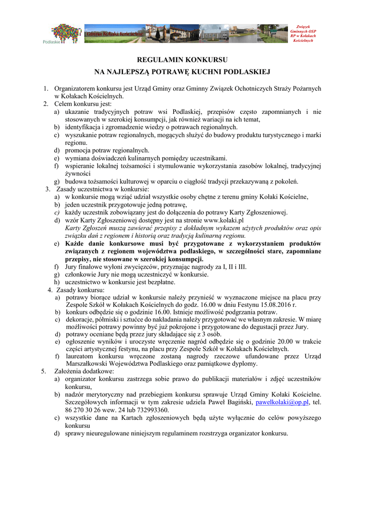 Związek Gminnych OSP RP w Kołakach Kościelnych REGULAMIN KONKURSU NA NAJLEPSZĄ POTRAWĘ KUCHNI PODLASKIEJ 1. Organizatorem konkursu jest Urząd Gminy oraz Gminny Związek Ochotniczych Straży Pożarnych w Kołakach Kościelnych. 2. Celem konkursu jest: a) ukazanie tradycyjnych potraw wsi Podlaskiej, przepisów często zapomnianych i nie stosowanych w szerokiej konsumpcji, jak również wariacji na ich temat, b) identyfikacja i zgromadzenie wiedzy o potrawach regionalnych. c) wyszukanie potraw regionalnych, mogących służyć do budowy produktu turystycznego i marki regionu. d) promocja potraw regionalnych. e) wymiana doświadczeń kulinarnych pomiędzy uczestnikami. f) wspieranie lokalnej tożsamości i stymulowanie wykorzystania zasobów lokalnej, tradycyjnej żywności g) budowa tożsamości kulturowej w oparciu o ciągłość tradycji przekazywaną z pokoleń. 3. Zasady uczestnictwa w konkursie: a) w konkursie mogą wziąć udział wszystkie osoby chętne z terenu gminy Kołaki Kościelne, b) jeden uczestnik przygotowuje jedną potrawę, c) każdy uczestnik zobowiązany jest do dołączenia do potrawy Karty Zgłoszeniowej. d) wzór Karty Zgłoszeniowej dostępny jest na stronie www.kolaki.pl Karty Zgłoszeń muszą zawierać przepisy z dokładnym wykazem użytych produktów oraz opis związku dań z regionem i historią oraz tradycją kulinarną regionu. e) Każde danie konkursowe musi być przygotowane z wykorzystaniem produktów związanych z regionem województwa podlaskiego, w szczególności stare, zapomniane przepisy, nie stosowane w szerokiej konsumpcji. f) Jury finałowe wyłoni zwycięzców, przyznając nagrody za I, II i III. g) członkowie Jury nie mogą uczestniczyć w konkursie. h) uczestnictwo w konkursie jest bezpłatne. 4. Zasady konkursu: a) potrawy biorące udział w konkursie należy przynieść w wyznaczone miejsce na placu przy Zespole Szkół w Kołakach Kościelnych do godz. 16.00 w dniu Festynu 15.08.2016 r. b) konkurs odbędzie się o godzinie 16.00. Istnieje możliwość podgrzania potraw. c) dekoracje, półmiski i sztućce do nakładania należy przygotować we własnym zakresie. W miarę możliwości potrawy powinny być już pokrojone i przygotowane do degustacji przez Jury. d) potrawy oceniane będą przez jury składające się z 3 osób. e) ogłoszenie wyników i uroczyste wręczenie nagród odbędzie się o godzinie 20.00 w trakcie części artystycznej festynu, na placu przy Zespole Szkół w Kołakach Kościelnych. f) laureatom konkursu wręczone zostaną nagrody rzeczowe ufundowane przez Urząd Marszałkowski Województwa Podlaskiego oraz pamiątkowe dyplomy. 5. Założenia dodatkowe: a) organizator konkursu zastrzega sobie prawo do publikacji materiałów i zdjęć uczestników konkursu, b) nadzór merytoryczny nad przebiegiem konkursu sprawuje Urząd Gminy Kołaki Kościelne. Szczegółowych informacji w tym zakresie udziela Paweł Bagiński, [email protected], tel. 86 270 30 26 wew. 24 lub 732993360. c) wszystkie dane na Kartach zgłoszeniowych będą użyte wyłącznie do celów powyższego konkursu d) sprawy nieuregulowane niniejszym regulaminem rozstrzyga organizator konkursu.