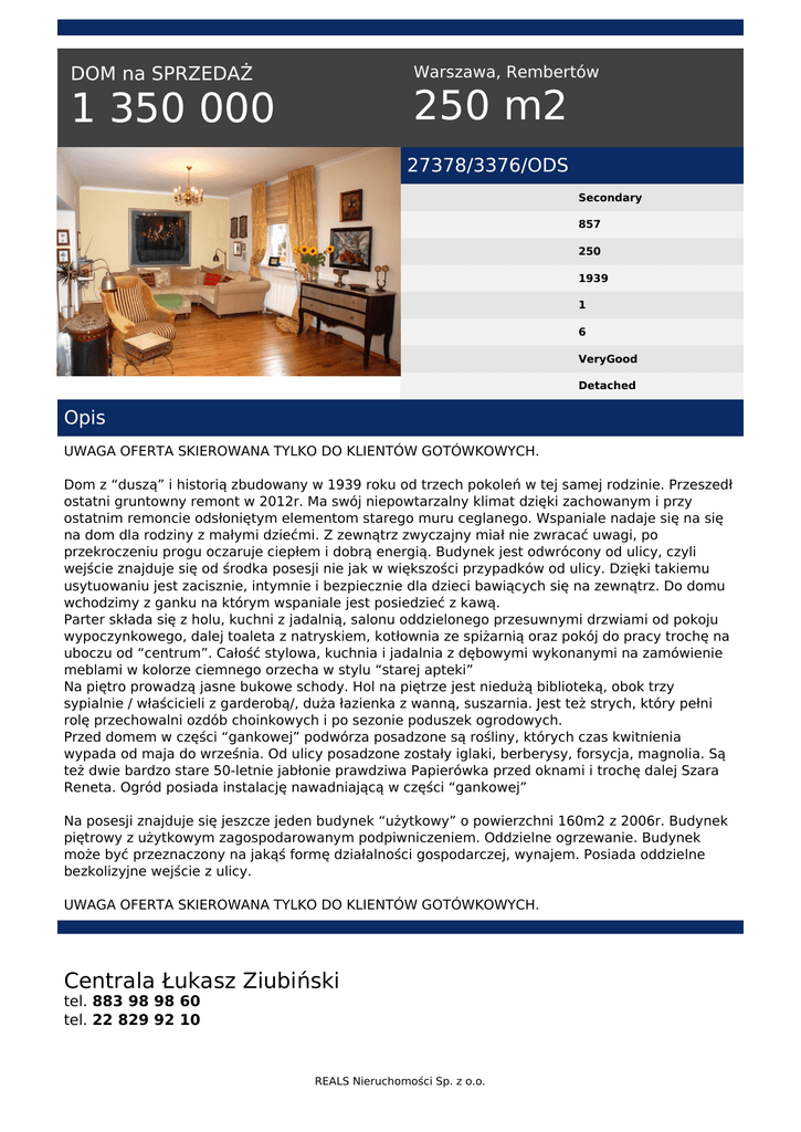 Warszawa, Rembertów DOM na SPRZEDAŻ 250 m2 1 350 000 27378/3376/ODS Secondary 857 250 1939 1 6 VeryGood Detached Opis UWAGA OFERTA SKIEROWANA TYLKO DO KLIENTÓW GOTÓWKOWYCH. Dom z “duszą” i historią zbudowany w 1939 roku od trzech pokoleń w tej samej rodzinie. Przeszedł ostatni gruntowny remont w 2012r. Ma swój niepowtarzalny klimat dzięki zachowanym i przy ostatnim remoncie odsłoniętym elementom starego muru ceglanego. Wspaniale nadaje się na się na dom dla rodziny z małymi dziećmi. Z zewnątrz zwyczajny miał nie zwracać uwagi, po przekroczeniu progu oczaruje ciepłem i dobrą energią. Budynek jest odwrócony od ulicy, czyli wejście znajduje się od środka posesji nie jak w większości przypadków od ulicy. Dzięki takiemu usytuowaniu jest zacisznie, intymnie i bezpiecznie dla dzieci bawiących się na zewnątrz. Do domu wchodzimy z ganku na którym wspaniale jest posiedzieć z kawą. Parter składa się z holu, kuchni z jadalnią, salonu oddzielonego przesuwnymi drzwiami od pokoju wypoczynkowego, dalej toaleta z natryskiem, kotłownia ze spiżarnią oraz pokój do pracy trochę na uboczu od “centrum”. Całość stylowa, kuchnia i jadalnia z dębowymi wykonanymi na zamówienie meblami w kolorze ciemnego orzecha w stylu “starej apteki” Na piętro prowadzą jasne bukowe schody. Hol na piętrze jest niedużą biblioteką, obok trzy sypialnie / właścicieli z garderobą/, duża łazienka z wanną, suszarnia. Jest też strych, który pełni rolę przechowalni ozdób choinkowych i po sezonie poduszek ogrodowych. Przed domem w części “gankowej” podwórza posadzone są rośliny, których czas kwitnienia wypada od maja do września. Od ulicy posadzone zostały iglaki, berberysy, forsycja, magnolia. Są też dwie bardzo stare 50-letnie jabłonie prawdziwa Papierówka przed oknami i trochę dalej Szara Reneta. Ogród posiada instalację nawadniającą w części “gankowej” Na posesji znajduje się jeszcze jeden budynek “użytkowy” o powierzchni 160m2 z 2006r. Budynek piętrowy z użytkowym zagospodarowanym podpiwniczeniem. Oddzielne ogrzewanie. Budynek może być przeznaczony na jakąś formę działalności gospodarczej, wynajem. Posiada oddzielne bezkolizyjne wejście z ulicy. UWAGA OFERTA SKIEROWANA TYLKO DO KLIENTÓW GOTÓWKOWYCH. Centrala Łukasz Ziubiński tel. 883 98 98 60 tel. 22 829 92 10 REALS Nieruchomości Sp. z o.o. email: [email protected] REALS Nieruchomości Sp. z o.o. Powered by TCPDF (www.tcpdf.org)