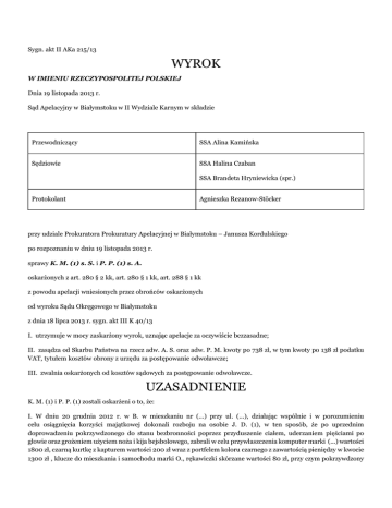 Sygn. akt II AKa 215/13 WYROK W IMIENIU RZECZYPOSPOLITEJ POLSKIEJ Dnia 19 listopada 2013 r. Sąd Apelacyjny w Białymstoku w II Wydziale Karnym w składzie Przewodniczący SSA Alina Kamińska Sędziowie SSA Halina Czaban SSA Brandeta Hryniewicka (spr.) Protokolant Agnieszka Rezanow-Stöcker przy udziale Prokuratora Prokuratury Apelacyjnej w Białymstoku – Janusza Kordulskiego po rozpoznaniu w dniu 19 listopada 2013 r. sprawy K. M. (1) s. S. i P. P. (1) s. A. oskarżonych z art. 280 § 2 kk, art. 280 § 1 kk, art. 288 § 1 kk z powodu apelacji wniesionych przez obrońców oskarżonych od wyroku Sądu Okręgowego w Białymstoku z dnia 18 lipca 2013 r. sygn. akt III K 40/13 I. utrzymuje w mocy zaskarżony wyrok, uznając apelacje za oczywiście bezzasadne; II. zasądza od Skarbu Państwa na rzecz adw. A. S. oraz adw. P. M. kwoty po 738 zł, w tym kwoty po 138 zł podatku VAT, tytułem kosztów obrony z urzędu za postępowanie odwoławcze; III. zwalnia oskarżonych od kosztów sądowych za postępowanie odwoławcze. UZASADNIENIE K. M. (1) i P. P. (1) zostali oskarżeni o to, że: I. W dniu 20 grudnia 2012 r. w B. w mieszkaniu nr (...) przy ul. (...), działając wspólnie i w porozumieniu celu osiągnięcia korzyści majątkowej dokonali rozboju na osobie J. D. (1), w ten sposób, że po uprzednim doprowadzeniu pokrzywdzonego do stanu bezbronności poprzez przyduszenie ciałem, uderzaniem pięściami po głowie oraz grożeniem użyciem noża i kija bejsbolowego, zabrali w celu przywłaszczenia komputer marki (...) wartości 1800 zł, czarną kurtkę z kapturem wartości 200 zł wraz z portfelem koloru czarnego z zawartością pieniędzy w kwocie 1300 zł , klucze do mieszkania i samochodu marki O., rękawiczki skórzane wartości 80 zł, przy czym pokrzywdzony doznał obrażeń ciała w postaci złamania V, VI, VII, VIII, IX i X żebra po stronie prawej z prawostronną odmą opłucnową, urazu głowy ze złamaniem nosa tj. o czyn z art. 280 § 2 k.k. II.W dniu 17 grudnia 2012 roku w B. w mieszkaniu nr. (...) przy ul. (...), działając wspólnie i w porozumieniu z nieustaloną osobą w celu osiągnięcia korzyści majątkowej po uprzednim wyważeniu drzwi do mieszkania, dokonali rozboju na osobie A. B. (1), w ten sposób, że po uprzednim doprowadzeniu pokrzywdzonego do stanu bezbronności poprzez kopnięcie w klatkę piersiową, bicie pięściami po głowie i zakrywanie twarzy poduszką, zabrali w celu przywłaszczenia dekoder telewizji naziemnej marki M. o wartości 100 zł, odtwarzacz(...)marki D. o wartości 200 zł, telefon komórkowy marki N. (...) nr. I. (...) wraz z kartę sim sieci O. o wartości 50 zł, portfel koloru jasnobrązowego o wartości 20 zł z zawartością dowodu osobistego i legitymacji emeryta, pieniądze w kwocie 100 zł i telewizor marki F. (...) cale o wartości 500 zł, tj. o czyn art. 280 § 1 k.k. w zb. z art. 276 k.k. III. W dniu 18 grudnia 2012 roku w B. przy ul. (...) działając wspólnie i w porozumieniu, poprzez kopanie w drzwi wejściowe w/w mieszkania spowodowali ich uszkodzenie w postaci wgniecenia i zdeformowania, powodując tym samym straty w wysokości 1700 na szkodę Z. B. (1) tj. o czyn z art. 288 § 1 k.k. IV. W dniu 20 grudnia 2012 roku w B. przy ul. (...) działając wspólnie i w porozumieniu, poprzez kopanie w drzwi wejściowe w/w mieszkania spowodowali ich uszkodzenie w postaci uszkodzenia klamki i zamka listwowego wielobolcowego, powodując tym samym straty w wysokości 500 na szkodę S. K. tj. o czyn z art. 288 § 1 k.k. Sąd Okręgowy w Białymstoku wyrokiem z dnia 18 lipca 2013r. oskarżonych K. M. (1) i P. P. (1) uznał za winnych popełnienia czynu opisanego w pkt. I i za to: oskarżonego K. M. (1) na mocy art. 280 § 2 k.k. skazał na karę 3 (trzech) lat pozbawienia wolności, a oskarżonego P. P. (1) na mocy art. 280 § 2 k.k. skazał na karę 4 (czterech) lat pozbawienia wolności. II. Oskarżonych K. M. (1) i P. P. (1) uznał za winnych tego, że w dniu 17 grudnia 2012 roku w B. w mieszkaniu nr. (...), przy ul. (...), działając wspólnie i w porozumieniu z nieustaloną osobą w celu osiągnięcia korzyści majątkowej po uprzednim wyważeniu drzwi do mieszkania, dokonali rozboju na osobie A. B. (1), w ten sposób, że po uprzednim doprowadzeniu pokrzywdzonego do stanu bezbronności poprzez kopnięcie w klatkę piersiową, bicie pięściami po głowie i zakrywanie twarzy poduszką, dokonali zaboru w celu przywłaszczenia dekodera telewizji naziemnej marki M. o wartości 100 zł, odtwarzacza(...) marki D. o wartości 200 zł, telefonu komórkowego marki N. (...) nr. I. (...) wraz z kartę sim sieci O. o wartości 50 zł, portfela koloru jasnobrązowego o wartości 20 zł, pieniędzy w kwocie 100 zł i telewizora marki F. (...) cale o wartości 500 zł, a ponadto wagi łazienkowej o wartości 50 zł, wiatraka o wartości 50 zł oraz saszetki koloru czarnego o wartości 50 zł, tj. czynu art. 280 § 1 k.k. i za to: 1/ oskarżonego K. M. (1) na mocy art. 280 § 1 k.k. skazał na karę 2 (dwóch) lat pozbawienia wolności, 2/ oskarżonego P. P. (1) na mocy art. 280 § 1 k.k. skazał na karę 3 (trzech) lat pozbawienia wolności. III. Oskarżonych K. M. (1) i P. P. (1) uznał za winnych popełnienia czynów opisanych pkt. III i IV i za to na mocy art. 288 § 1 k.k. skazał ich, a na mocy art. 288 § 1 k.k. w zw. z art. 91 § 1 k.k. wymierzył im kary: 1/ oskarżonemu K. M. (1) karę 8 (ośmiu) miesięcy pozbawienia wolności, 2/ oskarżonemu P. P. (1) karę 1 (jednego) roku pozbawienia wolności. Na mocy art. 91 § 2 k.k., art. 86 § 1 k.k. wymierzył oskarżonym kary łączne: 1/ oskarżonemu K. M. (1) 5 (pięciu) lat pozbawienia wolności, 2/ oskarżonemu P. P. (1) 6 (sześciu) lat pozbawienia wolności. Na mocy art. 63§1 kk na poczet orzeczonej kary łącznej pozbawienia wolności zaliczył: oskarżonemu K. M. (1) okres rzeczywistego pozbawienia wolności w sprawie od dnia 21 grudnia 2012r. do dnia 18 lipca 2013r. Na mocy art. 46
