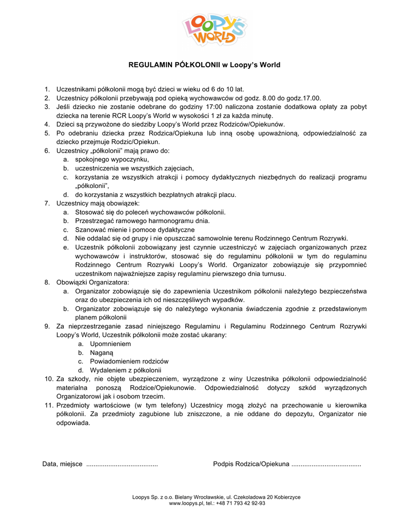REGULAMIN PÓŁKOLONII w Loopy’s World 1. Uczestnikami półkolonii mogą być dzieci w wieku od 6 do 10 lat. 2. Uczestnicy półkolonii przebywają pod opieką wychowawców od godz. 8.00 do godz.17.00. 3. Jeśli dziecko nie zostanie odebrane do godziny 17:00 naliczona zostanie dodatkowa opłaty za pobyt dziecka na terenie RCR Loopy’s World w wysokości 1 zł za każda minutę. 4. Dzieci są przywożone do siedziby Loopy’s World przez Rodziców/Opiekunów. 5. Po odebraniu dziecka przez Rodzica/Opiekuna lub inną osobę upoważnioną, odpowiedzialność za dziecko przejmuje Rodzic/Opiekun. 6. Uczestnicy „półkolonii” mają prawo do: a. spokojnego wypoczynku, b. uczestniczenia we wszystkich zajęciach, c. korzystania ze wszystkich atrakcji i pomocy dydaktycznych niezbędnych do realizacji programu „półkolonii”, d. do korzystania z wszystkich bezpłatnych atrakcji placu. 7. Uczestnicy mają obowiązek: a. Stosować się do poleceń wychowawców półkolonii. b. Przestrzegać ramowego harmonogramu dnia. c. Szanować mienie i pomoce dydaktyczne d. Nie oddalać się od grupy i nie opuszczać samowolnie terenu Rodzinnego Centrum Rozrywki. e. Uczestnik półkolonii zobowiązany jest czynnie uczestniczyć w zajęciach organizowanych przez wychowawców i instruktorów, stosować się do regulaminu półkolonii w tym do regulaminu Rodzinnego Centrum Rozrywki Loopy’s World. Organizator zobowiązuje się przypomnieć uczestnikom najważniejsze zapisy regulaminu pierwszego dnia turnusu. 8. Obowiązki Organizatora: a. Organizator zobowiązuje się do zapewnienia Uczestnikom półkolonii należytego bezpieczeństwa oraz do ubezpieczenia ich od nieszczęśliwych wypadków. b. Organizator zobowiązuje się do należytego wykonania świadczenia zgodnie z przedstawionym planem półkolonii 9. Za nieprzestrzeganie zasad niniejszego Regulaminu i Regulaminu Rodzinnego Centrum Rozrywki Loopy’s World, Uczestnik półkolonii może zostać ukarany: a. Upomnieniem b. Naganą c. Powiadomieniem rodziców d. Wydaleniem z półkolonii 10. Za szkody, nie objęte ubezpieczeniem, wyrządzone z winy Uczestnika półkolonii odpowiedzialność materialna ponoszą Rodzice/Opiekunowie. Odpowiedzialność dotyczy szkód wyrządzonych Organizatorowi jak i osobom trzecim. 11. Przedmioty wartościowe (w tym telefony) Uczestnicy mogą złożyć na przechowanie u kierownika półkolonii. Za przedmioty zagubione lub zniszczone, a nie oddane do depozytu, Organizator nie odpowiada. Data, miejsce ....................................... Podpis Rodzica/Opiekuna ...................................... Loopys Sp. z o.o. Bielany Wrocławskie, ul. Czekoladowa 20 Kobierzyce www.loopys.pl, tel.: +48 71 793 42 92-93