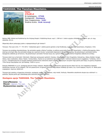 Informacje o wydawnictwie Utworzono 09-03-2017 TIANSHAN. The Tianshan Mountains. Cena : 378,00 zł R Nr katalogowy : 37546 Dostępność : Dostępny Stan magazynowy : niski Średnia ocena : brak recenzji LA Beijing 1980. Edited and Published by the Xinjiang People`s Publishing House. wyd. 1. 200 kol. il. tekst w języku chińskim i angielskim. opr. pł. oryg. obwoluta. 26 cm. FI Wspaniały album pokazujący jedne z najwspanialszych gór świata!!! Tienszan, Tien-szan (chin. ?? - Ti?n Sh?n: "niebiańskie góry") wielkie pasmo górskie w Azji Środkowej, na pograniczu Kazachstanu, Kirgistanu i Chin. sk i Tienszan ma przebieg równoleżnikowy. Na zachodzie opada w Nizinę Turańską, na północy graniczy z Pogórzem Kazachskim i z Kotliną Dżungarską, która dzieli go od od gór Ałtaj. Na wschodzie zbiega się z pasmem Kunlun i przechodzi stopniowo w Wyżynę Mongolską. Na południowym wschodzie Kotlina Kaszgarska oddziela go od Kunlunu. Na południowym zachodzie Tienszan łączy się z górami Pamir, a dalej Kotlina Fergańska oddziela do od Ałaju. G ór Tienszan dzieli się na Zachodni i Wschodni. Obejmuje szereg pasm górskich: Karatau, Góry Kirgiskie, Góry Fergańskie, Kokszał-tau, Ałatau Zailijski, Kungej Ałatau, Góry Czatkalskie, Ałatau Tałaski, Terskej Ałatou. Pasma te są rozdzielone licznymi dolinami i kotlinami tektonicznymi (najgłębsza Turfańska, 154 m p.p.m.). Charakterystyczne są wysoko położone powierzchnie zrównania zwane syrtami. Najwyższym szczytem tego pasma jest leżący na granicy Kirgistanu i Chin Szczyt Zwycięstwa (ros. pik Pobiedy, 7439 m n.p.m.). ar ia t Powyżej 36004450 m n.p.m. występują wieczne śniegi i lodowce. Współczesne zlodowacenie zajmuje łącznie około 16,5 tys. km (największy lodowiec Południowy Inylczek, 61 km długości, 567 km powierzchni). W górach Tienszan mają obszar źródłowy Syr-daria, Czu, liczne dopływy Tarymu i Ili. Wiele jezior (największe Issyk-kul, 6200 km). Tienszan jest zasobny w bogactwa mineralne, występują: węgiel, ropa naftowa, rudy metali, fosforyty. Niewielkie zaludnienie skupia się w dolinach i u podnóża. Wyższe partie gór odwiedzają tylko sezonowi pasterze i alpiniści. An ty k Zweryfikowane: Tak. Obszar: Alpinizm, Tien szan. Wydawnictwo zwarte: Tak. w Dostępne opcje TIANSHAN. The Tianshan Mountains. Wygenerowano w programie www.oscGold.com