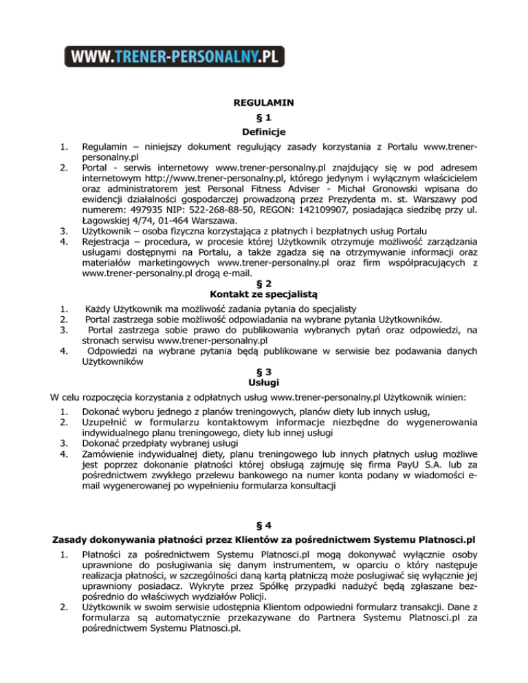 REGULAMIN §1 Definicje 1. 2. 3. 4. 1. 2. 3. 4. Regulamin – niniejszy dokument regulujący zasady korzystania z Portalu www.trenerpersonalny.pl Portal - serwis internetowy www.trener-personalny.pl znajdujący się w pod adresem internetowym http://www.trener-personalny.pl, którego jedynym i wyłącznym właścicielem oraz administratorem jest Personal Fitness Adviser - Michał Gronowski wpisana do ewidencji działalności gospodarczej prowadzoną przez Prezydenta m. st. Warszawy pod numerem: 497935 NIP: 522-268-88-50, REGON: 142109907, posiadająca siedzibę przy ul. Łagowskiej 4/74, 01-464 Warszawa. Użytkownik – osoba fizyczna korzystająca z płatnych i bezpłatnych usług Portalu Rejestracja – procedura, w procesie której Użytkownik otrzymuje możliwość zarządzania usługami dostępnymi na Portalu, a także zgadza się na otrzymywanie informacji oraz materiałów marketingowych www.trener-personalny.pl oraz firm współpracujących z www.trener-personalny.pl drogą e-mail. §2 Kontakt ze specjalistą Każdy Użytkownik ma możliwość zadania pytania do specjalisty Portal zastrzega sobie możliwość odpowiadania na wybrane pytania Użytkowników. Portal zastrzega sobie prawo do publikowania wybranych pytań oraz odpowiedzi, na stronach serwisu www.trener-personalny.pl Odpowiedzi na wybrane pytania będą publikowane w serwisie bez podawania danych Użytkowników §3 Usługi W celu rozpoczęcia korzystania z odpłatnych usług www.trener-personalny.pl Użytkownik winien: 1. 2. 3. 4. Dokonać wyboru jednego z planów treningowych, planów diety lub innych usług, Uzupełnić w formularzu kontaktowym informacje niezbędne do wygenerowania indywidualnego planu treningowego, diety lub innej usługi Dokonać przedpłaty wybranej usługi Zamówienie indywidualnej diety, planu treningowego lub innych płatnych usług możliwe jest poprzez dokonanie płatności której obsługą zajmuję się firma PayU S.A. lub za pośrednictwem zwykłego przelewu bankowego na numer konta podany w wiadomości email wygenerowanej po wypełnieniu formularza konsultacji §4 Zasady dokonywania płatności przez Klientów za pośrednictwem Systemu Platnosci.pl 1. 2. Płatności za pośrednictwem Systemu Platnosci.pl mogą dokonywać wyłącznie osoby uprawnione do posługiwania się danym instrumentem, w oparciu o który następuje realizacja płatności, w szczególności daną kartą płatniczą może posługiwać się wyłącznie jej uprawniony posiadacz. Wykryte przez Spółkę przypadki nadużyć będą zgłaszane bezpośrednio do właściwych wydziałów Policji. Użytkownik w swoim serwisie udostępnia Klientom odpowiedni formularz transakcji. Dane z formularza są automatycznie przekazywane do Partnera Systemu Platnosci.pl za pośrednictwem Systemu Platnosci.pl. 3. 4. 1. 2. 3. 4. Klient, po zatwierdzeniu formularza transakcji w Serwisie Użytkownika i wybraniu formy płatności za pośrednictwem Systemu Platnosci.pl, jest automatycznie przekierowywany odpowiednio: w przypadku płatności dokonywanych przy użyciu karty płatniczej – na stronę internetową Partnera Systemu Platnosci.pl będącego cen- trum autoryzacyjnorozliczeniowym, w przypadku płatności w drodze przelewu internetowego – na stronę internetową Partnera Systemu Platnosci.pl będącego bankiem, a w przypadku płatności w drodze przelewu tradycyjnego – na stronę internetową Serwisu Platnosci.pl. W celu dokonania płatności Klient powinien potwierdzić dokonanie płatności na stronach internetowych odpowiedniego Partnera Systemu Platnosci.pl zgodnie z zasadami określonymi przez tego Partnera. W przypadku dokonywania jakichkolwiek zmian w formularzu płatności udostępnionym na tych stronach i automatycznie uzupełnionym przez System Platnosci.pl, płatność może nie zostać zrealizowana. §5 Warunki świadczenia usług Rozpoczęcie świadczenia odpłatnych usług www.trener-personalny.pl nastąpi, na co Użytkownik wyraża zgodę, nie wcześniej niż w ciągu 1 (jednej) doby i nie później niż w 6 (sześć) dni od dnia potwierdzenia zaksięgowania zapłaty za wybraną usługę. Indywidualny plan dietetyczny lub treningowy zostanie niezwłocznie przesłany w formie elektronicznej na wskazany przez użytkownika adres e-mail. Ceny usług wyrażone są w złotych polskich (PLN) i są cenami brutto, co oznacza, iż zawierają one podatek od towarów i usług (VAT). Użytkownik oświadcza, iż przyjął do wiadomości i rozumie, że: 1. stosowanie diety określonego rodzaju może być wykluczone w przypadku istnienia przeciwwskazań zdrowotnych do jej stosowania. Użytkownik oświadcza, iż przed przystąpieniem do stosowania wybranej spośród oferowanych w ramach odpłatnej usługi www.trener-personalny.pl, przeprowadził z odpowiednim lekarzem konsultacje celem ustalenia wszelkich zaleceń lub przeciwwskazań co do sposobu żywienia Użytkownika zgodnie z wybranym rodzajem diety, 2. uprawianie sportu wiąże się z ryzykiem wystąpienia kontuzji oraz, że w przypadku jakichkolwiek wątpliwości lub dolegliwości winien je niezwłocznie konsultować wyłącznie z osobami posiadającymi stosowne kompetencje i uprawnienia. Użytkownik oświadcza, iż przed przystąpieniem do korzystania z odpłatnych usług www.trener-personalny.pl stanowiących indywidualny plan treningowy skonsultował swój stan zdrowia z odpowiednim lekarzem, który stwierdził brak przeciwwskazań do wykonywania ćwiczeń fizycznych, 3. korzystając z odpłatnych usług www.trener-personalny.pl winien ściśle stosować się do indywidualnych planów dietetycznych lub indywidualnych planów treningowych, które mogą być modyfikowane wyłącznie po uprzedniej konsultacji z osobami upoważnionymi do tego przez specjalistów z firmy Personal Fitness Adviser, w szczególności zaś, że nie wolno mu modyfikować tych planów samodzielnie lub przy pomocy lub udziale innych niż wyraźnie do tego wskazane przez Personal Fitness Adviser osób, a 