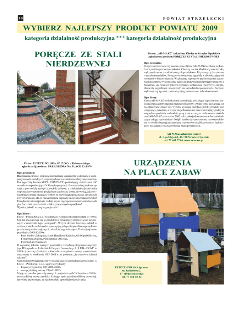 10 POWIAT STR Z E LE C K I WYBIERZ NAJLEPSZY PRODUKT POWIATU 2009 kategoria dzia³alnoæ produkcyjna *** kategoria dzia³alnoæ produkcyjna PORÊCZE ZE STALI NIERDZEWNEJ Firma: AR-MASZ Arkadiusz Kinder ze Strzelec Opolskich zg³osi³a swój produkt: PORÊCZE ZE STALI NIERDZEWNEJ Opis produktu: Porêcze nierdzewne wykonane przez firmê AR-MASZ cechuj¹ siê bardzo wysokim poziomem jakoci. G³ówny nacisk k³adziemy na estetykê wykonania oraz trwa³oæ naszych produktów. U¿ywamy tylko atestowanych materia³ów. Porêcze wykonujemy zgodnie z obowi¹zuj¹cymi normami w budownictwie. Wychodz¹c naprzeciw preferencjom i ¿yczeniom klientów, wykonujemy zarówno indywidualne projekty porêczy i balustrad, jak równie¿ gotowe elementy systemowe (pochwyty, s³upki, elementy wype³nieñ i mocowañ) do samodzielnego monta¿u. Porêcze wykonujemy zgodnie z obowi¹zuj¹cymi normami w budownictwie. Opis firmy: Firma AR-MASZ to doskona³a kompilacja polskiego kapita³u oraz dowiadczenia zdobytego na zachodzie Europy. Dziêki temu decyduj¹c siê na oferowane przez nas wyroby zyskuj¹ Pañstwo polski produkt nie ustêpuj¹cy jakoci¹, a wrêcz niejednokrotnie przewy¿szaj¹cy pod tym wzglêdem produkty zachodnie, przy jednoczesnym zachowaniu niskich cen! AR-MASZ powsta³ w 2005 roku jako jednoosobowa firma wiadcz¹ca us³ugo spawalnicze. Dziêki bardzo dynamicznemu rozwojowi firmy w chwili obecnej zatrudniamy wysoko wykwalifikowanych fachowców, posiadamy równie¿ w³asne biuro projektowe. AR-MASZ Arkadiusz Kinder ul. 1-go Maja 61, 47-100 Strzelce Opolskie tel. 77 461 37 66, www.ar-masz.pl Firma: ELTETE POLSKA SP. Z O.O. z Kolonowskiego zg³osi³a swój produkt: URZ¥DZENIA NA PLACE ZABAW Opis produktu: Bezpieczne, trwa³e, inspirowane fantazj¹ urz¹dzenia wykonane z kompozytowych, solidnych, odpornych na warunki atmosferyczne materia³ów typu: lity laminat (HPL, COMPACT) posiadaj¹cy stabilizator UV oraz drewno posiadaj¹ce IV klasê impregnacji. Barwna kolorystyka urz¹dzeñ z pewnoci¹ zachêci dzieci do zabawy, a wielofunkcyjna cianka wspinaczkowa pomo¿e pociechom zachowaæ dobr¹ sylwetkê, jak równie¿ bêdzie mia³a znacz¹cy wp³yw na rozwój ich sprawnoci, si³y miêni i wytrzyma³oci, ale co najwa¿niejsze zapewni im wymienit¹ rozrywkê! Urz¹dzenie niew¹tpliwie nadaje siê na zagospodarowanie osiedlowych placów, szkó³ przedszkoli, a tak¿e prywatnych ogródków! Wysoka jakoæ w przystêpnej cenie! Opis firmy: Eltete Polska Sp. z o.o. z siedzib¹ w Kolonowskiem powsta³a w 1996 r. Spó³ka specjalizuje siê w produkcji i monta¿u systemów cian dzia³owych z materia³u typu compact. W tym okresie bralimy udzia³ w realizacji wielu ambitnych i wymagaj¹cych profesjonalizmu projektów przede wszystkim krajowych, ale tak¿e zagranicznych. Poni¿ej wybrane przyk³ady z 2008 i 2009 r.: - Park Wodny Zakopane, Bank Handlowy Kraków, GM Opel Gliwice, Filharmonia Opole, Politechnika Opolska, - Ciemna City Bukareszt. O wysokiej jakoci naszych produktów wiadcz¹ otrzymane nagrody (np. II Nagroda na Lubelskich Targach Budowlanych LUB DOM w 1999 r.) oraz wyró¿nienia, z których szczególnie cenimy wyró¿nienie otrzymane w konkursie NPP 2008 r. za produkt: Systemowe cianki szklane. Natomiast potwierdzeniem wysokiej jakoci zarz¹dzania procesami w Eltete Polska Sp. z o.o. s¹ n/w certyfikaty: - krajowy (wg normy ISO 9001-2008), - europejski (wg normy ETA-01/002), Maj¹c na uwadze potrzeby naszych najm³odszych Klientów w 2009 r. stworzylimy nowy produkt, którego opis przedstawilimy powy¿ej. Jestemy przekonani, ¿e nasz produkt spe³ni ich oczekiwania. URZ¥DZENIA NA PLACE ZABAW ELTETE - POLSKA Sp. z o.o. ul. Zak³adowa 2, 47-110 Kolonowskie tel. 77 461 18 82