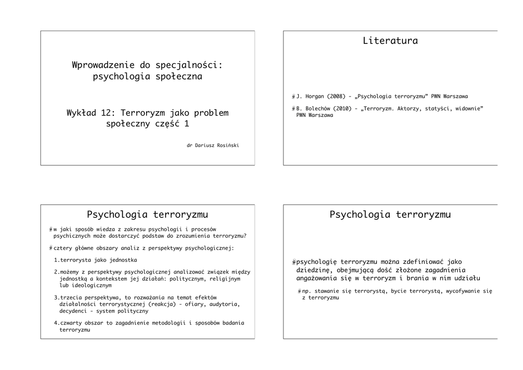 Literatura Wprowadzenie do specjalno!ci: psychologia spo"eczna J. Horgan (2008) - „Psychologia terroryzmu” PWN Warszawa Wyk"ad 12: Terroryzm jako problem spo"eczny cz#!$ 1 B. Bolechów (2010) - „Terroryzm. Aktorzy, staty!ci, widownie” PWN Warszawa dr Dariusz Rosi%ski Psychologia terroryzmu Psychologia terroryzmu w jaki sposób wiedza z zakresu psychologii i procesów psychicznych mo&e dostarczy$ podstaw do zrozumienia terroryzmu? cztery g"ówne obszary analiz z perspektywy psychologicznej: 1.terrorysta jako jednostka 2.mo&emy z perspektywy psychologicznej analizowa$ zwi'zek mi#dzy jednostk' a kontekstem jej dzia"a%: politycznym, religijnym lub ideologicznym 3.trzecia perspektywa, to rozwa&ania na temat efektów dzia"alno!ci terrorystycznej (reakcja) - ofiary, audytoria, decydenci - system polityczny 4.czwarty obszar to zagadnienie metodologii i sposobów badania terroryzmu psychologi# terroryzmu mo&na zdefiniowa$ jako dziedzin#, obejmuj'c' do!$ z"o&one zagadnienia anga&owania si# w terroryzm i brania w nim udzia"u np. stawanie si# terroryst', bycie terroryst', wycofywanie si# z terroryzmu Terroryzm to wywo"uj'ca l#k metoda powtarzalnych aktów przemocy, motywowana politycznie, stosowana przeciwko celom niewalcz'cym, gdzie, w odró&nieniu od innych form przemocy politycznej, bezpo!redni cel ataku nie jest celem g"ównym. Cele bezpo!rednie wybierane s': losowo (oportunistycznie) lub selektywnie (cele reprezentatywne b'd( symboliczne) i s"u&' jako generatory komunikatów. Terroryzm terrory!ci próbuj' osi'gn'$ maksymalny efekt w zakresie zmiany percepcji i - w jej nast#pstwie - zachowania - poprzez relatywnie minimalne (z konieczno!ci) ingerencje w „rzeczywisto!$ materialn'” psychologia stanowi jeden z najistotniejszych kluczy do zrozumienia tego zjawiska Terroryzm terroryzm jest form' manipulacji psychologicznej i form' opartej na przemocy komunikacji pomi#dzy terrorystami a ich audytorium, za po!rednictwem ofiar audytoria maj' przy tym sta$ si#: obiektem terroru (gdy chodzi o zastraszanie), &'da% (gdy chodzi o wymuszenie) lub uwagi (gdy chodzi o propagand#) Psychologia a badania nad terroryzmem Freud - agresja i przemoc wobec symboli w"adzy reprezentuje fundamentalna, pierwotn' cz#!$ ludzkiej psyche... terroryzm mo&na rozumie$ jako wyraz pierwotnych impulsów koncepcja mechanizmów obronnych ego: projekcja, zaprzeczanie, wyparcie, mechanizm koz"a ofiarnego, racjonalizacja terroryzm jako reakcja obronna ego Psychologia a badania nad terroryzmem Adler - w ludzkiej naturze le&y pierwotny impuls ku osi'ganiu przewagi, który mo&e ulec zniekszta"ceniu i transformacji (zw"aszcza w reakcji na poczucie ni&szo!ci), wskutek czego zapewnienie sobie przewagi odbywa si# poprzez si"#, w"adz#, dominacj#, kontrol# terroryzm jako aspo"eczna i agresywna reakcja na postrzegana podrz#dno!$, której celem jest zapewnienie sobie oczekiwanej przewagi Psychologia a badania nad terroryzmem Psychologia a badania nad terroryzmem Fromm - komplikacje &ycia codziennego przekraczaj' mo&liwo!ci wielu osób, które próbuj' uwolni$ si# od ci#&aru odpowiedzialno!ci oraz delegowa$ decyzje na inne podmioty - w konsekwencji !lepe pos"usze%stwo wobec autorytetów, które umo&liwiaj' ucieczk# od wolno!ci, oferuj'c poczucie sensu i znaczenia oraz jasno zdefiniowanej to&samo!ci terroryzm - psychologiczna reakcja ucieczkowa oraz forma patologicznych zachowa% wy"aniaj'cych si# wskutek uniemo&liwienia realizacji podstawowych ludzkich potrzeb Psychologia a badania nad terroryzmem do niedawna psychologia g"ównego nurtu w du&ej mierze ignorowa"a problem terroryzmu (mo&e ze wzgl#du na konotacje polityczne) Bandura - pomocne w rozumieniu terroryzmu mog' by$ jego koncepcje modelowania, imitacji i d'&enia do skuteczno!ci terrory!ci próbuj' uzyska$ kontrol# osobist' przez swoje dzia"ania. Poprzez modelowanie i imitacj# terroryzm staje si# akceptowalnym sposobem radzenia sobie z problemami oraz sposobem ustalania celów spodziewany wzrost zainteresowania terroryzmem w!ród psychologów z powodu: ro!nie przekonanie, &e terroryzm stanowi pe"noprawny i istotny temat bada% naukowych nie ma istotnych przes"anek przemawiaj'cych za znikni#ciem terroryzmu jako zjawiska spo"ecznego psychologia dysponuje znacz'cym i niewykorzystanym potencja"em poznawczym w kontek!cie bada% nad terroryzmem w!ród decydentów politycznych ro&nie zapotrzebowanie na wiarygodne informacje z zakresu psychologii terroryzmu (w kontek!cie decyzji) Dlaczego ludzie zostaj' terrorystami? Dlaczego ludzie zostaj' terrorystami? „jak oni mogli to zrobi$?” - np. 11 wrze!nia 2001 „profilowanie” - przypisywanie terrorystom konkretnych cech w celu wyja!nienia ich zachowa% (osoba „szczególna”, „patologiczna”) terrorysta jest by$ mo&e inny, przez to "atwiej go wy"oni$ z t"umu typologia osobowo!ci terrorystycznej (Goertzel, za Bolechów, 2010) strateg polityczny liderzy terrorystów - si"a przywódcza, specjalne „cechy przywódcze”? radykalny teoretyk szczególn' cech' terroryzmu (nie terrorysty) jest fakt, &e terroryzm jest zjawiskiem grupowym wojowniczy aktywista czy terrory!ci to psychopaci? Dynamika grupy terrorystycznej za"o&enie podstawowe: grupa terrorystyczna stanowi kluczowy determinant zachowania terrorystycznego mechanizm procesu grupowego wraz z takimi zjawiskami, jak izolacja, poczucie zagro&enia, indoktrynacja, szkolenie czy presja grupowa, maj' silnie kszta"towa$ sk"onno!$ grupy (i jednostek w ramach tej grupy) do przemocy, w du&ej mierze niezale&nie od indywidualnych cech psychologicznych jej cz"onków indywidualna analiza psychologiczna b#dzie z definicji niewystarczaj'ca do zrozumienia ludzi stosuj'cych terroryzm Dynamika grupy terrorystycznej operacje terrorystyczne s' zakorzenione w kontek!cie grupowym i organizacyjnym, obejmuj'cym mo&liwe do zidentyfikowania wymiary ideologiczne czy polityczne, wp"ywaj'ce na indywidualnych terrorystów na wszystkich etapach procesu radykalizacji (za Bolechów, 2010) terroryzm to przede wszystkim dzia