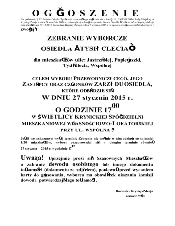 O G Ł O S Z E N I E Na podstawie § 12 Statutu Osiedla Tysiąclecia stanowiącego załącznik do uchwały Nr LXII.361.2014 Rady Miejskiej w Krynicy-Zdroju z dnia 24 września 2014 r. zmieniającej uchwałę w sprawie Statutu Osiedla „Tysiąclecia” w Krynicy-Zdroju oraz Zarządzenia Nr 12.2015 Burmistrza Krynicy-Zdroju z dnia 7 stycznia 2015 r. w sprawie zwołania zebrań wyborczych – zwołuję ZEBRANIE WYBORCZE OSIEDLA „ TYSIĄCLECIA” dla mieszkańców ulic: Jastrzębiej, Popiełuszki, Tysiąclecia, Wspólnej CELEM WYBORU PRZEWODNICZĄCEGO, JEGO ZASTĘPCY ORAZ CZŁONKÓW ZARZĄDU OSIEDLA, KTÓRE ODBĘDZIE SIĘ W DNIU 27 stycznia 2015 r. 00 O GODZINIE 17 W ŚWIETLICY KRYNICKIEJ SPÓŁDZIELNI MIESZKANIOWEJ WŁASNOŚCIOWO-LOKATORSKIEJ PRZY UL. WSPÓLNA 5 Jeżeli we wskazanym wyżej terminie Zebrania nie weźmie w nim udziału co najmniej 1/20 mieszkańców, wybory przeprowadzi się w drugim terminie również 15 27 stycznia 2015 r. o godzinie 17 Uwaga! Uprzejmie prosi się Szanownych Mieszkańców o zabranie dowodu osobistego lub innego dokumentu tożsamości (dokumentu ze zdjęciem), ponieważ przed wydaniem karty do głosowania, wyborca ma obowiązek okazania komisji dowodu potwierdzającego tożsamość. Burmistrz Krynicy-Zdroju Dariusz Reśko