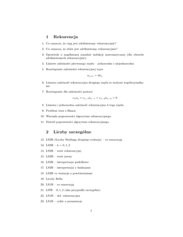 1 Rekurencja 1. Co oznacza, że ciąg jest zdefiniowany rekurencyjnie? 2. Co oznacza, że zbiór jest zdefiniowany rekurencyjnie? 3. Opowiedz o uogólnionej zasadzie indukcji matematycznej (dla zbiorów zdefiniowanych rekurencyjnie). 4. Liniowe zależności pierwszego rzędu – jednorodne i niejednorodne. 5. Rozwiązanie zależności rekurencyjnej typu an+1 = dan 6. Liniowa zależność rekurencyjna drugiego rzędu ze stałymi współczynnikami. 7. Rozwiązanie dla zależności postaci: cn an + cn−1 an−1 + cn−2 an−2 = 0 8. Liniowa i jednorodna zależność rekurencyjna k-tego rzędu. 9. Problem wież z Hanoi. 10. Warunki poprawności algorytmu rekurencyjnego. 11. Dowód poprawności algorytmu rekurencyjnego. 2 Liczby szczególne 12. LS2R (Liczby Stirlinga drugiego rodzaju) – co oznaczają 13. LS2R – k = 0, 1, 2 14. LS2R – wzór rekurencyjny 15. LS2R – wzór jawny 16. LS2R – interpretacje pudełkowe 17. LS2R – interpretacja z funkcjami 18. LS2R vs wariacja z powtórzeniami 19. Liczby Bella 20. LS1R – co oznaczają 21. LS!R – 0, 1, 2 (aka przypadki szczególne) 22. LS1R – def. rekurencyjna 23. LS1R – cykle a permutacje 1 24. LS i wielomian 25. Liczby Eulera pierwszego rzędu – definicja 26. Liczby Eulera pierwszego rzędu – własności 27. Liczby Eulera pierwszego rzędu – definicja rekurencyjna 28. Liczby Eulera drugiego rzędu – definicja 29. Liczby Eulera drugiego rzędu – własności 30. Liczby Eulera drugiego rzędu – definicja rekurencyjna 31. Co z czym wiążą które liczby Eulera? 32. Liczby harmoniczne 33. Własności liczb harmonicznych 34. Liczby harmoniczne a logarytm 35. Liczby Fibonacciego - def. rekurencyjna, jawna 36. Tw. Zeckendorfa 37. Liczby Lucasa 38. Liczby Euklidesa 39. Liczby Mersennea 40. Liczby Catalana 3 Zaawansowane metody zliczania obiektów kombinatorycznych 41. Zasada włączania i wyłączania. 42. Dowód zasady włączania i wyłączania. 43. Alternatywna postać zasady włączania i wyłączania. 44. Dowód alternatywnej zasady włączania i wyłączania. 45. Nieporządek 46. Zasada szufladkowa Dirichleta. 47. Dowód zasady szufladkowej Dirichleta. 48. Uogólniona zasada szufladkowa Dirichleta. 49. Jej dowód. 50. Zasada dwoistości. 2 4 funkcje tworzące 51. Funkcje tworzące zwykłe – definicja 52. Funkcje tworzące zwykłe – pudełka (i kule) 53. Funkcje tworzące zwykłe – równanie diofantyczne 54. Przykład 4: (1 + x)n 1 1 55. Przykład 5: (1 − xn+1 ), 1−x , (1−x) 2 56. Pochodna funkcji tworzącej (przykład 5d) 57. Uogólnienie symbolu Newtona na R i konsekwencje „przykładowe” 58. Dla m, n ∈ P i a ∈ R zachodzi... (1 do 7) 59. Podziały liczb całkowitych 60. Funkcje tworzące wykładnicze 61. Rozwinięcie ex w szereg Maclaurina 5 Prostokąty łacińskie 62. Definicja prostokąta i kwadratu łacińskiego. 63. Postać podstawowa. 64. Pierwsze twierdzenie o rozszerzaniu prostokątów łacińskich. 65. Jak rozszerzyć prostokąt p × n do kwadratu n × n? 66. Drugie twierdzenie o rozszerzaniu prostokątów łacińskich. 67. Jak rozszerzyć prostokąt p × q do kwadratu n × n? 68. Ortogonalność kwadratów łacińskich. 69. Twierdzenie Bosego-Shrikhande-Parkera. 70. Twierdzenie trzecie. 6 wielomiany szachowe 71. Wielomiany szachowe (opisują...) – definicja 72. „Zastosowania wielomianów szachowych” 73. Rozszerzanie prostokąta łacińskiego a rozmieszczenie wież 74. Podział na rozłączne obszary – dekompozycja 75. Tw. 1 – o tablicach bez wspólnych wierszy i kolumn 3 76. Tw. 2 – o skreślaniu 77. Tw. 3 – o dopełnieniu (na czym opiera się dowód?) 78. Wielomiany szachowe a liczba nieporządków 7 Teoria grafów II 79. p-graf (definicja) 80. Graf sprzężony (definicja) 81. Definicja 3 82. Skierowany graf liniowy (definicja) 83. graf (α, k)-etykietowalny (definicja) 84. Graf de Bruijna (definicja) 85. Graf de Bruijna (własności) 86. Definicja 7 – klasy 1-grafów (α, k)-etykietowalnych 87. Graf DNA (definicja) 88. Twierdzenie 1: o grafie sprzężonym, Eulerze i Hamiltonie 89. Wniosek 1: o skierowanym grafie liniowym, Eulerze i Hamiltonie 90. Twierdzenie 2: o warunku sprzężenia 1-grafu 91. Twierdzenie 3: o skierowaniu liniowym 1-grafu 92. Twierdzenie 4: o należeniu skierowanego grafu liniowego do L∞ k+1 (ma dowód) 93. Twierdzenie 5: o L∞ 2 , więcej byłoby podaniem twierdzenia (ma dowód) 94. Twierdzenie 6: o k ∈ C, k > 2 95. Twierdzenie 7: o tym, do czego jeszcze należy H, jeśli należy do L∞ k 4
