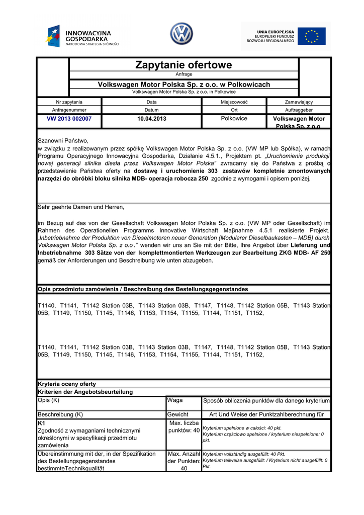 Zapytanie ofertowe Anfrage Volkswagen Motor Polska Sp. z o.o. w Polkowicach Volkswagen Motor Polska Sp. z o.o. in Polkowice Nr zapytania Data Miejscowość Zamawiający Anfragenummer Datum Ort Auftraggeber VW 2013 002007 10.04.2013 Polkowice Volkswagen Motor Polska Sp. z o.o. Szanowni Państwo, w związku z realizowanym przez spółkę Volkswagen Motor Polska Sp. z o.o. (VW MP lub Spółka), w ramach Programu Operacyjnego Innowacyjna Gospodarka, Działanie 4.5.1., Projektem pt. „Uruchomienie produkcji nowej generacji silnika diesla przez Volkswagen Motor Polska” zwracamy się do Państwa z prośbą o przedstawienie Państwa oferty na dostawę i uruchomienie 303 zestawów kompletnie zmontowanych narzędzi do obróbki bloku silnika MDB- operacja robocza 250 zgodnie z wymogami i opisem poniŜej. Sehr geehrte Damen und Herren, im Bezug auf das von der Gesellschaft Volkswagen Motor Polska Sp. z o.o. (VW MP oder Gesellschaft) im Rahmen des Operationellen Programms Innovative Wirtschaft Maβnahme 4.5.1 realisierte Projekt. „Inbetriebnahme der Produktion von Dieselmotoren neuer Generation (Modularer Dieselbaukasten – MDB) durch Volkswagen Motor Polska Sp. z o.o .” wenden wir uns an Sie mit der Bitte, Ihre Angebot über Lieferung und Inbetriebnahme 303 Sätze von der komplettmontierten Werkzeugen zur Bearbeitung ZKG MDB- AF 250 gemäß der Anforderungen und Beschreibung wie unten abzugeben. Opis przedmiotu zamówienia / Beschreibung des Bestellungsgegenstandes T1140, T1141, T1142 Station 03B, T1143 Station 03B, T1147, T1148, T1142 Station 05B, T1143 Station 05B, T1149, T1150, T1145, T1146, T1153, T1154, T1155, T1144, T1151, T1152, T1140, T1141, T1142 Station 03B, T1143 Station 03B, T1147, T1148, T1142 Station 05B, T1143 Station 05B, T1149, T1150, T1145, T1146, T1153, T1154, T1155, T1144, T1151, T1152, Kryteria oceny oferty Kriterien der Angebotsbeurteilung Opis (K) Beschreibung (K) K1 Zgodność z wymaganiami technicznymi określonymi w specyfikacji przedmiotu zamówienia Ȕbereinstimmung mit der, in der Spezifikation des Bestellungsgegenstandes bestimmteTechnikqualität Waga Sposób obliczenia punktów dla danego kryterium Gewicht Art Und Weise der Punktzahlberechnung für Max. liczba punktów: 40 Kryterium spełnione w całości: 40 pkt. Kryterium częściowo spełnione / kryterium niespełnione: 0 pkt. Max. Anzahl Kryterium vollständig ausgefüllt: 40 Pkt. der Punkten: Kryterium teilweise ausgefüllt: / Kryterium nicht ausgefüllt: 0 Pkt. 40 K2 Termin dostawy wskazany przez VWMP Max. liczba Zgodność z terminem dostawy wymaganym przez punktów: 30 Zamawiającego: 30 pkt. Częściowa lub całlkowita niezgodność z terminem dostawy wymaganym przez Zamawiającego: 0 pkt. Liefertermin, der vom Auftraggeber erfordert wird Max. Anzahl Übereinstimmung mit dem vom Auftraggeber erfordern der Punkten: Liefertermin: 30 Pkt. Teilweise Übereinstimmung und Unstimmigkeit mit dem vom 30 Auftraggeber erfordern Liefertermin: 0 Pkt. cena najniŜsza ---------------------------------------- x 30 = liczba punktów cena zadeklarowana przez Oferenta K3 Cena Max. liczba punktów: 30 Preis Max. Anzahl niedrigste Preis der Punkten: --------------------------------------------- x 30= Punktzahl 30 von dem Anbieter vorgeschalagener Preis Miejsce realizacji zamówienia / Ort der Bestellungsrealisierung Siedziba Volkswagen Motor Polska Sp z o. o.: ul. Strefowa 1, 59-101 Polkowice Termin oddania przez firmę maszyny do uŜytku klienta / Bertiebliche Übergabe TK 27/2013 KW 27/2013 NajwaŜniejsze informacje dotyczące sposobu, terminu oraz miejsca składania ofert Die wichtigste Anmerkungen bezüglich der Art und Weise, Frist, sowie des Orts der Angebotsabgabe − Oferta powinna zostać złoŜona w formie pisemnej i zaadresowana na Volkswagen Motor Polska Sp. z o.o. z siedzibą w Polkowicach, ul. Strefowa 1, 59-101 Polkowice; _ Oferta powinna zostać złoŜona w terminie do dnia .26.04.2013 − KaŜda oferta powinna wskazywać termin waŜności. − Das Angebot soll im Schriftform eingerichtet werden und an Volkswagen Motor Polska Sp. z o.o. mit Sitz in Polkowice, ul. Strefowa 1, 59-101 Polkowice adressiert werden; _ Das Angebot soll bis zum 26.04.2013. abgegeben werden; − Jedes Angebot sollte auf ihre Geltungsdauer hinweisen. Inne istotne postanowienia / uwagi Andere relevante Bestimmungen / Anmerkungen − Zamawiający zastrzega sobie moŜliwość negocjowania Ofert. O terminie ew. negocjacji Oferenci zostaną poinformowani w odpowiednim czasie; − Der Auftraggeber behält sich das Recht vor, die Angeboten verhandeln zu können. Vom Termin der ev. Verhandlung werden die Anbieter in der ensprechenden Frist benachrichtigt; Osoba do kontaktu ze strony Zamawiającego Anprechpartner seitens des Auftraggebers Małgorzata Kruk, Specjalista ds. Handlu Zagranicznego i Zakupów Dawid Odrobina, Planowanie E-mail Telefon Adres [email protected] + 48 76 848 3264 Volkswagen Motor Polska Sp zoo ul. Strefowa 1, 59-101 Polkowice [email protected] + 48 76 8483945 Volkswagen Motor Polska Sp zoo ul. Strefowa 1, 59-101 Polkowice 1. Obowiązuje „Instrukcja organizacyjna nr 17 „Procedura zamówień w ramach projektu Uruchomienie produkcji nowej generacji silnika diesla (MDB – Modularer Dieselbaukasten) przez Volkswagen Motor Polska” („Instrukcja organizacyjna nr 17”), która stanowi integralną część niniejszego zapytania ofertowego. 2. Obowiązują Ogólne Warunki Zakupów VWMP. 3. Obowiązuje szczegółowa specyfikacja przedmiotu zamówienia (Lastenheft). Zusätzliche Bestimmungen: 1. Es gilt die Organisationsanweisung Nr 17 „Das Bestellungsverfahren im Rahmen des Projekts Inbetriebnahme der Produktion von Dieselmotoren neuer Generation (Modularer Dieselbaukasten – MDB) durch Volkswagen Motor Polska Sp. z o.o .“ („Organisationsanweisung Nr 17 ), die der integrale Teil dieser Angebotsanfrage ist. 2. Es gelten die allgemeine Verkaufsbedingungen von VWMP. 3. Es gilt die detaillierte Spezifikation des Gegenst