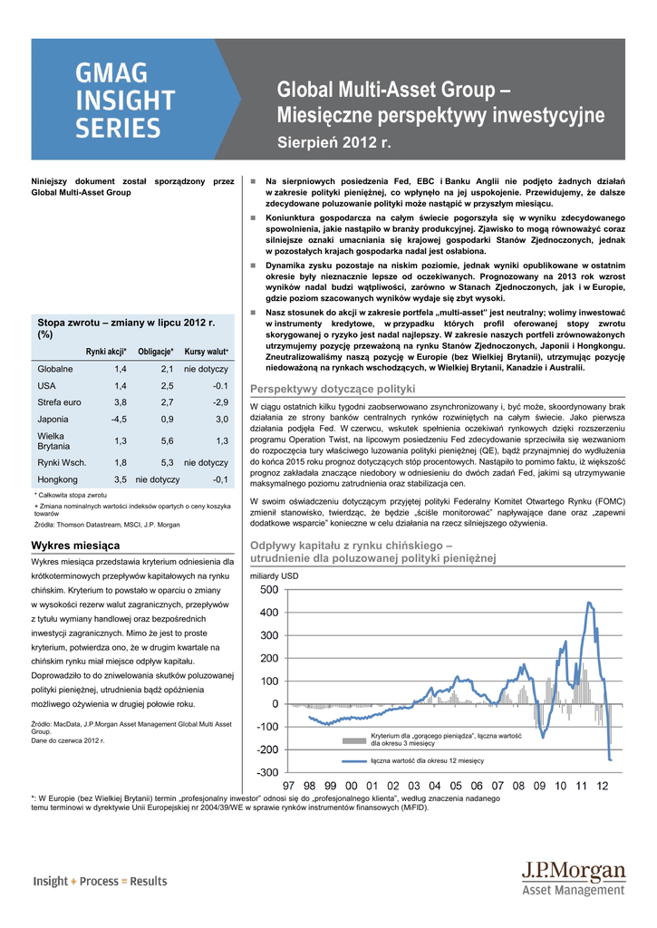 Global Multi-Asset Group – Miesięczne perspektywy inwestycyjne Sierpień 2012 r. Niniejszy dokument został sporządzony przez Global Multi-Asset Group Stopa zwrotu – zmiany w lipcu 2012 r. (%) Na sierpniowych posiedzenia Fed, EBC i Banku Anglii nie podjęto żadnych działań w zakresie polityki pieniężnej, co wpłynęło na jej uspokojenie. Przewidujemy, że dalsze zdecydowane poluzowanie polityki może nastąpić w przyszłym miesiącu. Koniunktura gospodarcza na całym świecie pogorszyła się w wyniku zdecydowanego spowolnienia, jakie nastąpiło w branży produkcyjnej. Zjawisko to mogą równoważyć coraz silniejsze oznaki umacniania się krajowej gospodarki Stanów Zjednoczonych, jednak w pozostałych krajach gospodarka nadal jest osłabiona. Dynamika zysku pozostaje na niskim poziomie, jednak wyniki opublikowane w ostatnim okresie były nieznacznie lepsze od oczekiwanych. Prognozowany na 2013 rok wzrost wyników nadal budzi wątpliwości, zarówno w Stanach Zjednoczonych, jak i w Europie, gdzie poziom szacowanych wyników wydaje się zbyt wysoki. Nasz stosunek do akcji w zakresie portfela „multi-asset” jest neutralny; wolimy inwestować w instrumenty kredytowe, w przypadku których profil oferowanej stopy zwrotu skorygowanej o ryzyko jest nadal najlepszy. W zakresie naszych portfeli zrównoważonych utrzymujemy pozycję przeważoną na rynku Stanów Zjednoczonych, Japonii i Hongkongu. Zneutralizowaliśmy naszą pozycję w Europie (bez Wielkiej Brytanii), utrzymując pozycję niedoważoną na rynkach wschodzących, w Wielkiej Brytanii, Kanadzie i Australii. Rynki akcji* Obligacje* Kursy walut+ Globalne 1,4 2,1 nie dotyczy USA 1,4 2,5 -0.1 Perspektywy dotyczące polityki Strefa euro 3,8 2,7 -2,9 Japonia -4,5 0,9 3,0 Wielka Brytania 1,3 5,6 1,3 Rynki Wsch. 1,8 5,3 nie dotyczy Hongkong 3,5 W ciągu ostatnich kilku tygodni zaobserwowano zsynchronizowany i, być może, skoordynowany brak działania ze strony banków centralnych rynków rozwiniętych na całym świecie. Jako pierwsza działania podjęła Fed. W czerwcu, wskutek spełnienia oczekiwań rynkowych dzięki rozszerzeniu programu Operation Twist, na lipcowym posiedzeniu Fed zdecydowanie sprzeciwiła się wezwaniom do rozpoczęcia tury właściwego luzowania polityki pieniężnej (QE), bądź przynajmniej do wydłużenia do końca 2015 roku prognoz dotyczących stóp procentowych. Nastąpiło to pomimo faktu, iż większość prognoz zakładała znaczące niedobory w odniesieniu do dwóch zadań Fed, jakimi są utrzymywanie maksymalnego poziomu zatrudnienia oraz stabilizacja cen. nie dotyczy -0,1 * Całkowita stopa zwrotu + Zmiana nominalnych wartości indeksów opartych o ceny koszyka towarów Źródła: Thomson Datastream, MSCI, J.P. Morgan W swoim oświadczeniu dotyczącym przyjętej polityki Federalny Komitet Otwartego Rynku (FOMC) zmienił stanowisko, twierdząc, że będzie „ściśle monitorować” napływające dane oraz „zapewni dodatkowe wsparcie” konieczne w celu działania na rzecz silniejszego ożywienia. Wykres miesiąca przedstawia kryterium odniesienia dla Odpływy kapitału z rynku chińskiego – utrudnienie dla poluzowanej polityki pieniężnej krótkoterminowych przepływów kapitałowych na rynku miliardy USD Wykres miesiąca chińskim. Kryterium to powstało w oparciu o zmiany w wysokości rezerw walut zagranicznych, przepływów z tytułu wymiany handlowej oraz bezpośrednich inwestycji zagranicznych. Mimo że jest to proste kryterium, potwierdza ono, że w drugim kwartale na chińskim rynku miał miejsce odpływ kapitału. Doprowadziło to do zniwelowania skutków poluzowanej polityki pieniężnej, utrudnienia bądź opóźnienia możliwego ożywienia w drugiej połowie roku. Źródło: MacData, J.P.Morgan Asset Management Global Multi Asset Group. Dane do czerwca 2012 r. Kryterium dla „gorącego pieniądza”, łączna wartość dla okresu 3 miesięcy łączna wartość dla okresu 12 miesięcy *: W Europie (bez Wielkiej Brytanii) termin „profesjonalny inwestor” odnosi się do „profesjonalnego klienta”, według znaczenia nadanego temu terminowi w dyrektywie Unii Europejskiej nr 2004/39/WE w sprawie rynków instrumentów finansowych (MiFID). Global Multi-Asset Group – Miesięczne perspektywy inwestycyjne Perspektywy dotyczące polityki, cd. Prognozy gospodarcze – rynkowy konsensus Realny PKB USA 2012 2013 2,1 2,2 Europa -0,4 0,6 Japonia 2,5 1,4 Wielka Brytania 0,0 1,6 Chiny 8,2 8,3 Źródło: Bloomberg Prognozy inflacji cen dóbr konsumpcyjnych – rynkowy konsensus CPI 2012 2013 USA 2,0 2,0 Europa 2,3 1,7 Japonia 0,2 0,1 Wielka Brytania 2,7 1,9 Chiny 2,8 2,9 Źródło: Bloomberg Warto nadmienić, że w następstwie poprzedniego oświadczenia FOMC, w którym komitet ten zobowiązał się do „ścisłego monitorowania” gospodarki, w okresie między poszczególnymi posiedzeniami komitetu miało miejsce działanie. Publikacja protokołu wraz z treścią przemówień różnych członków FOMC, a w szczególności komentarzy prezesa FOMC wygłoszonych w Jackson Hole, może dostarczyć więcej informacji dotyczących prawdopodobieństwa przedstawienia nowych inicjatyw na wrześniowym posiedzeniu komitetu. Jak już wcześniej wspominaliśmy, nadchodzący sezon wyborczy powoduje wyraźne podniesienie poprzeczki dla wszelkich działań, jednakże zmniejszona presja cenowa oraz ograniczona inflacja płacowa może stanowić pretekst dla Fed. Posiedzenie Europejskiego Banku Centralnego (EBC) na początku sierpnia nie zaowocowało żadnymi nowymi inicjatywami; EBC utrzymał stopę refinansową na poziomie 0,75%. Posiedzenie to było jednak godne uwagi ze względu na oświadczenie prezesa EBC, Mario Draghiego, dotyczące ujawnienia przez EBC w nadchodzących tygodniach szczegółów wprowadzenia dalszych niekonwencjonalnych środków. Uwaga prawdopodobnie skupi się na kolejnym posiedzeniu EBC, które ma odbyć się 6 września, kiedy to zakłada się, że bank centralny ujawni pakie