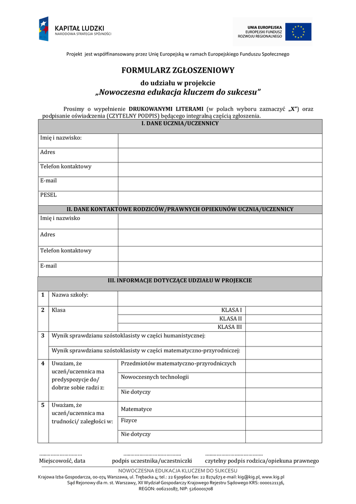 Projekt jest współfinansowany przez Unię Europejską w ramach Europejskiego Funduszu Społecznego FORMULARZ ZGŁOSZENIOWY do udziału w projekcie „Nowoczesna edukacja kluczem do sukcesu” Prosimy o wypełnienie DRUKOWANYMI LITERAMI (w polach wyboru zaznaczyć „X”) oraz podpisanie oświadczenia (CZYTELNY PODPIS) będącego integralną częścią zgłoszenia. I. DANE UCZNIA/UCZENNICY Imię i nazwisko: Adres Telefon kontaktowy E-mail PESEL II. DANE KONTAKTOWE RODZICÓW/PRAWNYCH OPIEKUNÓW UCZNIA/UCZENNICY Imię i nazwisko Adres Telefon kontaktowy E-mail III. INFORMACJE DOTYCZĄCE UDZIAŁU W PROJEKCIE 1 Nazwa szkoły: 2 Klasa 3 Wynik sprawdzianu szóstoklasisty w części humanistycznej: KLASA I KLASA II KLASA III Wynik sprawdzianu szóstoklasisty w części matematyczno-przyrodniczej: 4 5 Uważam, że uczeń/uczennica ma predyspozycje do/ dobrze sobie radzi z: Przedmiotów matematyczno-przyrodniczych Nowoczesnych technologii Nie dotyczy Uważam, że uczeń/uczennica ma trudności/ zaległości w: Matematyce Fizyce Nie dotyczy …..…………………… Miejscowość, data …..……………………………. podpis uczestnika/uczestniczki …..……………………………. czytelny podpis rodzica/opiekuna prawnego NOWOCZESNA EDUKACJA KLUCZEM DO SUKCESU Krajowa Izba Gospodarcza, 00-074 Warszawa, ul. Trębacka 4; tel.: 22 6309600 fax: 22 8274673 e-mail: [email protected], www.kig.pl Sąd Rejonowy dla m. st. Warszawy, XII Wydział Gospodarczy Krajowego Rejestru Sądowego KRS: 0000121136, REGON: 006210187, NIP: 5260001708 Projekt jest współfinansowany przez Unię Europejską w ramach Europejskiego Funduszu Społecznego OŚWIADCZENIE Oświadczam, że - dane zawarte w ankiecie zgłoszeniowej w części 1 są zgodne z prawdą i zostałem/am pouczony/a o odpowiedzialności za składanie oświadczeń niezgodnych z prawdą - zapoznałem/am się z Regulaminem Rekrutacji i Uczestnictwa w ramach Projektu,jestem świadomy/a, iż złożenie ankiety zgłoszeniowej nie jest równoznaczne z zakwalifikowaniem do udziału w projekcie, - zostałem/am poinformowany/a o współfinansowaniu projektu ze środków Unii Europejskiej w ramach Europejskiego Funduszu Społecznego, - wyrażam zgodę na przetwarzanie danych osobowych zawartych w ankiecie zgłoszeniowej oraz dokumentach niezbędnych dla potrzeb realizacji rekrutacji do projektu - w przypadku przyjęcia mojego dziecka do udziału w zajęciach realizowanych w ramach Projektu, wyrażam zgodę na przetwarzanie danych osobowych oraz zobowiązuję się do tego, że moje dziecko będzie systematycznie uczestniczyć w działaniach Projektu oraz sumiennie wykonywać wszystkie zadania - stan zdrowia dziecka umożliwia udział w zajęciach dodatkowych i będę ponosić odpowiedzialność za bezpieczeństwo swojego dziecka w drodze do miejsca oraz z miejsca odbywania zajęć - wyrażam zgodę na publikację wizerunku w celach promocyjnych projektu …..…………………… Miejscowość, data …..……………………………. podpis uczestnika/uczestniczki …..……………………………. czytelny podpis rodzica/opiekuna prawnego NOWOCZESNA EDUKACJA KLUCZEM DO SUKCESU Krajowa Izba Gospodarcza, 00-074 Warszawa, ul. Trębacka 4; tel.: 22 6309600 fax: 22 8274673 e-mail: [email protected], www.kig.pl Sąd Rejonowy dla m. st. Warszawy, XII Wydział Gospodarczy Krajowego Rejestru Sądowego KRS: 0000121136, REGON: 006210187, NIP: 5260001708