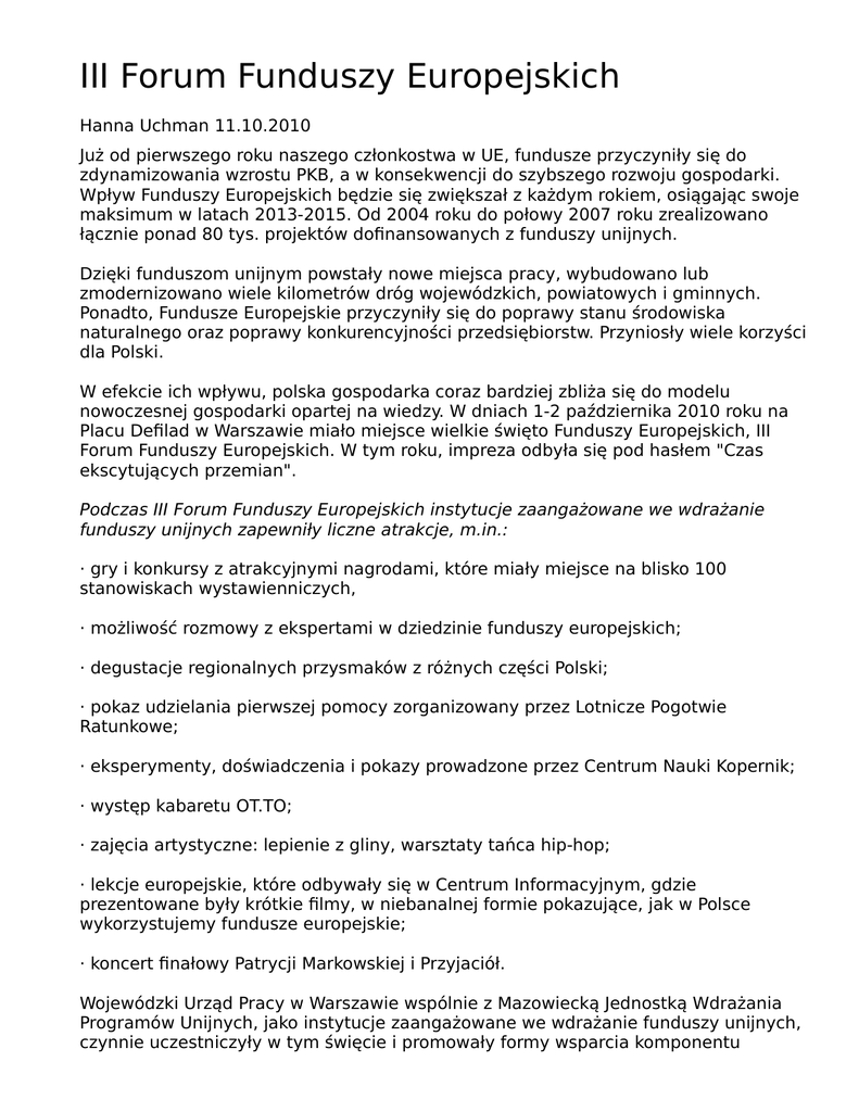 III Forum Funduszy Europejskich Hanna Uchman 11.10.2010 Już od pierwszego roku naszego członkostwa w UE, fundusze przyczyniły się do zdynamizowania wzrostu PKB, a w konsekwencji do szybszego rozwoju gospodarki. Wpływ Funduszy Europejskich będzie się zwiększał z każdym rokiem, osiągając swoje maksimum w latach 2013-2015. Od 2004 roku do połowy 2007 roku zrealizowano łącznie ponad 80 tys. projektów dofinansowanych z funduszy unijnych. Dzięki funduszom unijnym powstały nowe miejsca pracy, wybudowano lub zmodernizowano wiele kilometrów dróg wojewódzkich, powiatowych i gminnych. Ponadto, Fundusze Europejskie przyczyniły się do poprawy stanu środowiska naturalnego oraz poprawy konkurencyjności przedsiębiorstw. Przyniosły wiele korzyści dla Polski. W efekcie ich wpływu, polska gospodarka coraz bardziej zbliża się do modelu nowoczesnej gospodarki opartej na wiedzy. W dniach 1-2 października 2010 roku na Placu Defilad w Warszawie miało miejsce wielkie święto Funduszy Europejskich, III Forum Funduszy Europejskich. W tym roku, impreza odbyła się pod hasłem "Czas ekscytujących przemian". Podczas III Forum Funduszy Europejskich instytucje zaangażowane we wdrażanie funduszy unijnych zapewniły liczne atrakcje, m.in.: · gry i konkursy z atrakcyjnymi nagrodami, które miały miejsce na blisko 100 stanowiskach wystawienniczych, · możliwość rozmowy z ekspertami w dziedzinie funduszy europejskich; · degustacje regionalnych przysmaków z różnych części Polski; · pokaz udzielania pierwszej pomocy zorganizowany przez Lotnicze Pogotwie Ratunkowe; · eksperymenty, doświadczenia i pokazy prowadzone przez Centrum Nauki Kopernik; · występ kabaretu OT.TO; · zajęcia artystyczne: lepienie z gliny, warsztaty tańca hip-hop; · lekcje europejskie, które odbywały się w Centrum Informacyjnym, gdzie prezentowane były krótkie filmy, w niebanalnej formie pokazujące, jak w Polsce wykorzystujemy fundusze europejskie; · koncert finałowy Patrycji Markowskiej i Przyjaciół. Wojewódzki Urząd Pracy w Warszawie wspólnie z Mazowiecką Jednostką Wdrażania Programów Unijnych, jako instytucje zaangażowane we wdrażanie funduszy unijnych, czynnie uczestniczyły w tym święcie i promowały formy wsparcia komponentu regionalnego Programu Operacyjnego Kapitał Ludzki oraz Regionalnego Programu Operacyjnego dla Województwa Mazowieckiego. Już dziś, zapraszamy wszystkich Państwa za rok, na IV FORUM FUNDUSZY EUROPEJSKICH.