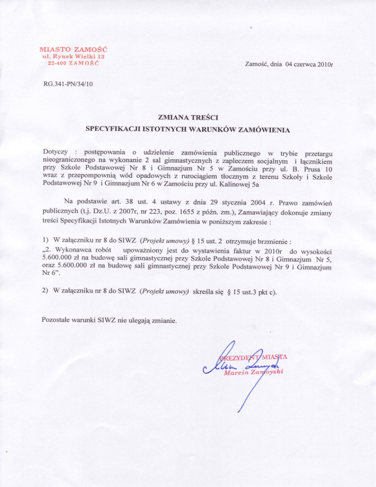 MIAsTo zAMoŚC ul. Synek Wielki 13 2 2 . 4 t łz A M o Ś Ć ZamoŚć, dnia 04 częrwca20I0r RG.341-PN/34l10 ZMIANA TREŚCI SPECYFIKACJI ISToTNYCH WARUNKÓw z.tn,rÓwrnNrł Dotyczy : postępowania o udzielenie zamówienia publicznego w trybie przetargu tieograticzonego na wykonanie 2 sa| gimnastycznych z żap|eczei socjalnyrn i łączilkiń przy Szkole Podstawowej Nr 8 i GimnĄvm Nr 5 w Zamościu przy u|. B. Prusa 10 wraz Z przepompownią wód opadowych z rurociągiem tłocmym z terenu Szkoły i Szkole PodstawowejNr 9 i GimnazjumNr 6 w Zanościuprzy v|. Kalinowej 5a Na podstawie art. 38 ust. 4 ustawy z drua 29 sĘczrua }OO r. Prawo zarnówień publicznych (tj. Dz.U, z 2007r,nr 223, poz, |655 z późn.zm.), Zarnawiającydokonujezmiany treściSpecyfikacji Istotnych Warunków Zamówieniaw poniższymzakresie : 1) W załącznikunr 8 do SIWZ (Projeh umowy) $ 15 ust. f otrzymlje brzmienie : upoważniony jest do wystawienia faktur w 2010r do wysokości ,,2. Wykonawca robót 5'600.000 zł na budowę sali gimnastycznej przy Szkole Podstawowej Nr 8 i Gimnazjum Nr 5, oraz 5.600.000 zł na budowę sali gimnastycznej przy Szko|e Podstawowej Nr 9 i Gimnazjum Nr 6". 2) W załącznikunr 8 do SIWZ (Projekt umowy) skreślasię $ 15 ust.3 pkt c). Pozostałewarunki SIWZ nie ulegają nniarie, Marcin Za