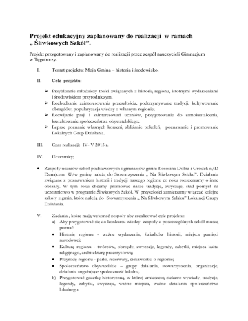 Projekt edukacyjny zaplanowany do realizacji w ramach „ Śliwkowych Szkół”. Projekt przygotowany i zaplanowany do realizacji przez zespół nauczycieli Gimnazjum w Tęgoborzy. I. Temat projektu: Moja Gmina – historia i środowisko. II. Cele projektu: Przybliżanie młodzieży treści związanych z historią regionu, istotnymi wydarzeniami i środowiskiem przyrodniczym; Rozbudzanie zainteresowania przeszłością, podtrzymywanie tradycji, kultywowanie obrzędów, popularyzacja wiedzy o własnym regionie; Rozwijanie pasji i zainteresowań uczniów, przygotowanie do samokształcenia, kształtowanie społeczeństwa obywatelskiego; Lepsze poznanie własnych korzeni, zbliżanie pokoleń, poznawanie i promowanie Lokalnych Grup Działania. III. Czas realizacji: IV- V 2015 r. IV. Uczestnicy; V. Zespoły uczniów szkół podstawowych i gimnazjów gmin: Łososina Dolna i Gródek n/D Dunajcem. W/w gminy należą do Stowarzyszenia „ Na Śliwkowym Szlaku”. Działania związane z poznawaniem historii i tradycji naszego regionu co roku rozszerzamy o inne obszary. W tym roku chcemy promować nasze tradycje, zwyczaje, stad pomysł na uczestnictwo w programie Śliwkowych Szkół. W przyszłości zamierzamy włączać kolejne szkoły z gmin, które należą do Stowarzyszenia „ Na Śliwkowym Szlaku” Lokalnej Grupy Działania. Zadania , które mają wykonać zespoły aby zrealizować cele projektu: a) Aby przygotować się do konkursu wiedzy zespoły z poszczególnych szkół muszą poznać: Historię regionu - ważne wydarzenia, świadków historii, miejsca pamięci narodowej; Kulturę regionu - twórców, obrzędy, zwyczaje, legendy, zabytki, miejsca kultu religijnego, architekturę przemysłową; Przyrodę regionu - parki, rezerwaty, ciekawostki o regionie; Społeczeństwo obywatelskie – grupy działania, stowarzyszenia, organizacje, działania angażujące społeczność lokalną. b) Przygotować gazetkę historyczną, w której umieszczą ciekawe wywiady, tradycje, legendy, zabytki, zwyczaje, ważne miejsca, ważne działania społeczeństwa lokalnego. c) Grupa kulinarna- czyli uczniowie Gimnazjum w Tęgoborzy- przygotuje prace pt; Poradnik kulinarny mojej babci”. Prace będą zaprezentowane podczas konkursu. d) Uczniowie zespołu kulinarnego zaproszą do współpracy swoje babcie, wspólnie przygotują tradycyjne potrawy związane z naszym regionem, potrawy z wykorzystaniem śliwki sechlońskiej, jabłek i przetworów. e) Zespół ds. dekoracji przygotuje przestrzenną dekorację pt; „Kwitnące sady”. f) Zespół do spraw promocji wykona zdjęcia, przygotuje informacje do prasy, umieści informacje i zdjęcia na stronach internetowych. VI. Sposób prezentacji: konkurs, prezentacje prac i potraw odbędą się w Gimnazjum w Tęgoborzy; Konkurs wiedzy- test dla uczniów szkół podstawowych i gimnazjów w/w gmin; Prezentacja prac – gazetki historycznej; Prezentacja prac- poradników kulinarnych mojej babci; Prezentacja i degustacja regionalnych potraw; Informacja o projekcie, wynikach konkursu, zdjęcia z prezentacji i degustacji potraw zostaną umieszczone na stronie internetowej gimnazjum, stronie gmin oraz stowarzyszenia. VII. Termin prezentacji- 20 maj 2015 r. od godziny 10.00; VIII. Kryteria oceny projektu; Członkowie jury będą przyznawać punkty za: test wiedzy- indywidualnie ; pracę przygotowaną przez 3 osobowy zespół z danej szkoły; przygotowanie poradników i prezentację potraw. Uczestnicy projektu otrzymają nagrody: indywidualne za test wiedzy: zespołowe dla szkół: łącznie punkty za test wiedzy i pracę. IX. Odbiorcy projektu; zaproszeni goście –władze gmin, władze Stowarzyszenia „ Na Śliwkowym Szlaku” , uczniowie i nauczyciele szkół uczestniczących w projekcie, rodzice, babcie, nauczyciele i uczniowie Gimnazjum w Tęgoborzy; Przygotowali: Irena Basta- Dyrektor Gimnazjum w Tęgoborzy; Krystyna Gargula- nauczyciel historii; Renata Kaczkowska – nauczyciel geografii.