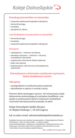 Poszukują pracowników na stanowiska: • maszynista spalinowych pojazdów trakcyjnych, • kierownik pociągu, • konduktor, • specjalista ds. taboru , oraz kandydatów do przyuczenia na stanowisko: • kierownik pociągu, • konduktor, • maszynista spalinowych pojazdów trakcyjnych. Wymagania: • wykształcenie – minimum zawodowe, • zawodowy staż pracy – minimum 1 rok pracy na podobnym stanowisku • uregulowanu stosunek do służby wojskowej • dobry stan zdrowia • dyspozycyjność, chęć do pracy, obowiązkowość, sumienność. Doświadczenie w kierowaniu autobusami szynowymi, będzie dodatkowym atutem. Oferujemy: • wynagrodzenie na konkurencyjnym poziomie, • zatrudnienie w oparciu o umowę o pracę . Pisemne oferty zawierające: życiorys , list motywacyjny, kopię dokumentów potwierdzających posiadane kwalifikacje oraz zgodę na przetwarzanie danych osobowych niezbędnych, w procesie rekrutacji prosimy przesyłać na adres: Koleje Dolnośląskie Spółka Akcyjna Ul. Wojska Polskiego 1, 59-220 Legnica lub na adres email: [email protected] Kandydaci do pracy winni spełniać wymogi zgodne z Rozporządzeniem Ministra Infrastruktury z dnia 16 sierpnia 2004 r. w sprawie wykazu stanowisk bezpośrednio związanych z prowadzeniem i bezpieczeństwem ruchu kolejowego i warunków, jakie powinny spełniać osoby zatrudnione na tych stanowiskach oraz prowadzący pojazdy kolejowe (Dz. U. z 2004 r. Nr 212, poz. 2152).