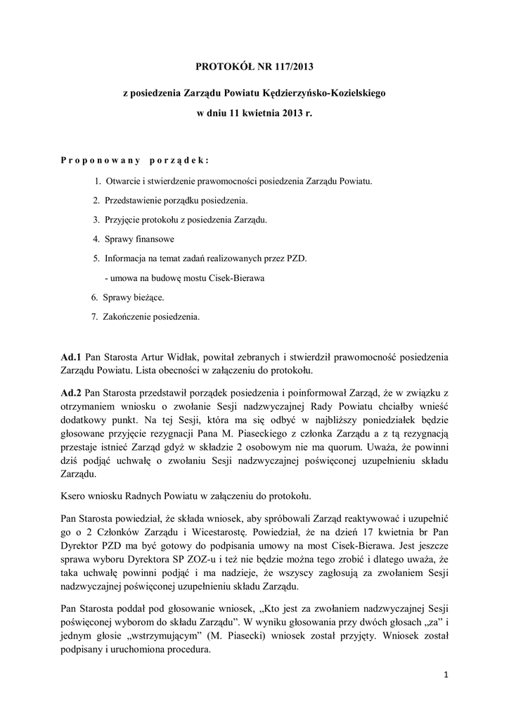 PROTOKÓŁ NR 117/2013 z posiedzenia Zarządu Powiatu Kędzierzyńsko-Kozielskiego w dniu 11 kwietnia 2013 r. Proponowany porządek: 1. Otwarcie i stwierdzenie prawomocności posiedzenia Zarządu Powiatu. 2. Przedstawienie porządku posiedzenia. 3. Przyjęcie protokołu z posiedzenia Zarządu. 4. Sprawy finansowe 5. Informacja na temat zadań realizowanych przez PZD. - umowa na budowę mostu Cisek-Bierawa 6. Sprawy bieżące. 7. Zakończenie posiedzenia. Ad.1 Pan Starosta Artur Widłak, powitał zebranych i stwierdził prawomocność posiedzenia Zarządu Powiatu. Lista obecności w załączeniu do protokołu. Ad.2 Pan Starosta przedstawił porządek posiedzenia i poinformował Zarząd, że w związku z otrzymaniem wniosku o zwołanie Sesji nadzwyczajnej Rady Powiatu chciałby wnieść dodatkowy punkt. Na tej Sesji, która ma się odbyć w najbliższy poniedziałek będzie głosowane przyjęcie rezygnacji Pana M. Piaseckiego z członka Zarządu a z tą rezygnacją przestaje istnieć Zarząd gdyż w składzie 2 osobowym nie ma quorum. Uważa, że powinni dziś podjąć uchwałę o zwołaniu Sesji nadzwyczajnej poświęconej uzupełnieniu składu Zarządu. Ksero wniosku Radnych Powiatu w załączeniu do protokołu. Pan Starosta powiedział, że składa wniosek, aby spróbowali Zarząd reaktywować i uzupełnić go o 2 Członków Zarządu i Wicestarostę. Powiedział, że na dzień 17 kwietnia br Pan Dyrektor PZD ma być gotowy do podpisania umowy na most Cisek-Bierawa. Jest jeszcze sprawa wyboru Dyrektora SP ZOZ-u i też nie będzie można tego zrobić i dlatego uważa, że taka uchwałę powinni podjąć i ma nadzieje, że wszyscy zagłosują za zwołaniem Sesji nadzwyczajnej poświęconej uzupełnieniu składu Zarządu. Pan Starosta poddał pod głosowanie wniosek, „Kto jest za zwołaniem nadzwyczajnej Sesji poświęconej wyborom do składu Zarządu”. W wyniku głosowania przy dwóch głosach „za” i jednym głosie „wstrzymującym” (M. Piasecki) wniosek został przyjęty. Wniosek został podpisany i uruchomiona procedura. 1 Ksero wniosku w załączeniu do protokołu Ad.6 W związku z przybyciem na posiedzenie Zarządu p.o. Dyrektora SP ZOZ-u Pana Andrzeja Mazura Zarząd postanowił przejść do tematów SP ZOZ. p.o. Dyrektor Pan A. Mazur poinformował obecnych o zakończeniu audytów w SP ZOZ. Powyższe informacje znajdą się na Biuletynie Informacji Publicznej SP ZOZ-u. Rzecznik prasowy sporządzi również obszerną notatkę, którą przekaże dziennikarzom – główne tezy, jakie są zawarte w tych raportach z audytu. Podobnie z raportem z PIP-u po zamazaniu danych osobowych również ukarze się w BIP-ie. . Następnie uzupełniając informacje o sytuacji finansowej jednostki na dzień 5 kwietnia br. powiedział, że wartość zobowiązań na dzień 31.12.2012 roku była ponad 10 milionów złotych. Zapłacono za 2012 rok – 4 miliony zł, więc stan zobowiązań z ubiegłego roku wynosi 6 milionów zł, ale przybyło 5 milionów w pierwszych 3 miesiącach tego roku plus ponad milion zł niezafakturowany, czyli stan zobowiązań z tytułu dostaw towarów i usług mimo spłacenia są nadal takie, jakie były. Ponadto pan Dyrektor poinformował członków Zarządu, że nie zostało rozwiązane postępowanie mające na celu wybór podmiotu, który obsługiwałby sanitarki i samochody służbowe na ten rok. Było 9 ofert. Wszystkie negatywne ze strony zakładów usługowych. Żadna firma nie chce świadczyć im usług z powodu, że wiedzą, że są niewypłacalni. Ma informację od urzędników, że w ubiegłym roku jedna firma splajtowała z powodu nie zapłacenia należności przez SP ZOZ. Pani Skarbnik zwróciła się do Dyrektora z zapytaniem - „Co z budową lądowiska?” na co pan dyrektor odpowiedział, że około miesiąca temu wysłał pismo do Przewodniczącego Rady Powiatu, do Pana Starosty do Zarządu, że są gotowi, ale ma opinie prawną, że on nie powinien uruchamiać inwestycji, pomimo że jest do tego gotowy. Dlatego wysłał pismo, aby uzyskać odpowiedź - nawet negatywną. Chce mieć ślad, że rozmawiał z organem założycielskim. Nawet gdyby otrzymał odpowiedź negatywna to i tak podjąłby jakąś decyzję, którą uważałby za słuszną dla ZOZ-u. Nie otrzymał odpowiedzi ani od Rady Powiatu ani od Zarządu. Powiedział, że są gotowi od 6 lutego do uruchomienia inwestycji. Pan adwokat M. Semeniuk powiedział: „nie może”. Dyrektor Pan A. Mazur podkreślił, że nie jest to zarzut tylko informacja - odpowiedź na pytanie. Do ustawowego terminu odpowiedzi brakuje jeszcze kilku dni. Pan Starosta powiedział, że jest opinia, że p.o. Dyrektor nie powinien podejmować tego typu decyzji tylko prowadzić bieżącą działalność. Pan Dyrektor wyjaśnił, że są zabezpieczeni, co do udziału w kontrakcie na przyszły rok, gdyż mają lądowisko zastępcze na boisku „Odry” i w momencie, kiedy rozpoczną inwestycje mają poinformować o tym pogotowie lotnicze w Warszawie. Przyjedzie wówczas ekspert i wyznaczy lądowisko, które jest w tej chwili na boisku, jako zastępcze i mogą brać udział w konkursie, jeżeli budowa będzie trwała. Powiedział, że nie wyraża żadnej opinii tylko informuje, i powtórzył, że w momencie, kiedy uruchomią budowę lądowiska, które już 2 powinni mieć mają zaprosić na wizje przedstawiciela Lotniczego Pogotowia Ratunkowego z Warszawy, który jak potwierdzi, że procedura budowy lądowiska jest w toku wyznaczy lądowisko zastępcze, które będzie mogło być podstawą do aplikacji o kontrakt na ratownictwo medyczne na SOR na przyszły rok - spełnimy warunki do przystąpienia do konkursu. Pan Starosta powiedział, że czyta wniosek o zwołanie Sesji nadzwyczajnej podpisanej również przez Pana M. Piaseckiego i jest zdziwiony, że nie zadecydowali o uzupełnienie składu tylko jest rezygnacja Pana M. Piaseckiego. Nie ma wtedy Zarządu a to jest działanie wbrew rozstrzygnięciu nadzorczemu Wojewody, k