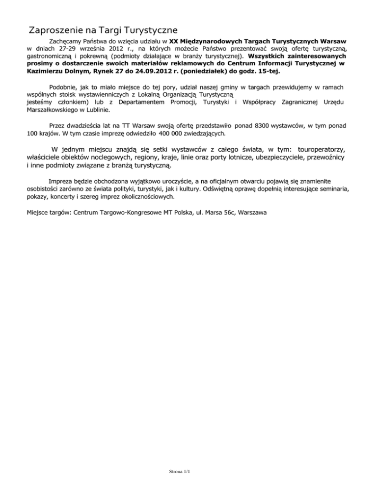 Zaproszenie na Targi Turystyczne Zachęcamy Państwa do wzięcia udziału w XX Międzynarodowych Targach Turystycznych Warsaw w dniach 27-29 września 2012 r., na których możecie Państwo prezentować swoją ofertę turystyczną, gastronomiczną i pokrewną (podmioty działające w branży turystycznej). Wszystkich zainteresowanych prosimy o dostarczenie swoich materiałów reklamowych do Centrum Informacji Turystycznej w Kazimierzu Dolnym, Rynek 27 do 24.09.2012 r. (poniedziałek) do godz. 15-tej. Podobnie, jak to miało miejsce do tej pory, udział naszej gminy w targach przewidujemy w ramach wspólnych stoisk wystawienniczych z Lokalną Organizacją Turystyczną jesteśmy członkiem) lub z Departamentem Promocji, Turystyki i Współpracy Zagranicznej Urzędu Marszałkowskiego w Lublinie. Przez dwadzieścia lat na TT Warsaw swoją ofertę przedstawiło ponad 8300 wystawców, w tym ponad 100 krajów. W tym czasie imprezę odwiedziło 400 000 zwiedzających. W jednym miejscu znajdą się setki wystawców z całego świata, w tym: touroperatorzy, właściciele obiektów noclegowych, regiony, kraje, linie oraz porty lotnicze, ubezpieczyciele, przewoźnicy i inne podmioty związane z branżą turystyczną. Impreza będzie obchodzona wyjątkowo uroczyście, a na oficjalnym otwarciu pojawią się znamienite osobistości zarówno ze świata polityki, turystyki, jak i kultury. Odświętną oprawę dopełnią interesujące seminaria, pokazy, koncerty i szereg imprez okolicznościowych. Miejsce targów: Centrum Targowo-Kongresowe MT Polska, ul. Marsa 56c, Warszawa Strona 1/1 Powered by TCPDF (www.tcpdf.org)
