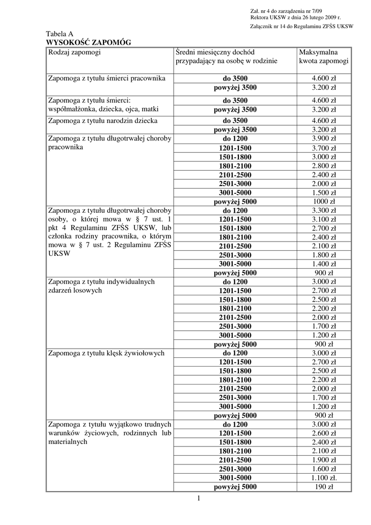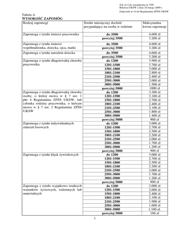Zał. nr 4 do zarządzenia nr 7/09 Rektora UKSW z dnia 26 lutego 2009 r. Załącznik nr 14 do Regulaminu ZFŚS UKSW Tabela A WYSOKOŚĆ ZAPOMÓG Rodzaj zapomogi Średni miesięczny dochód przypadający na osobę w rodzinie Maksymalna kwota zapomogi Zapomoga z tytułu śmierci pracownika do 3500 powyżej 3500 4.600 zł 3.200 zł Zapomoga z tytułu śmierci: współmałżonka, dziecka, ojca, matki do 3500 powyżej 3500 do 3500 powyżej 3500 do 1200 1201-1500 1501-1800 1801-2100 2101-2500 2501-3000 3001-5000 powyżej 5000 do 1200 1201-1500 1501-1800 1801-2100 2101-2500 2501-3000 3001-5000 powyżej 5000 do 1200 1201-1500 1501-1800 1801-2100 2101-2500 2501-3000 3001-5000 powyżej 5000 do 1200 1201-1500 1501-1800 1801-2100 2101-2500 2501-3000 3001-5000 powyżej 5000 do 1200 1201-1500 1501-1800 1801-2100 2101-2500 2501-3000 3001-5000 powyżej 5000 4.600 zł 3.200 zł 4.600 zł 3.200 zł 3.900 zł 3.700 zł 3.000 zł 2.800 zł 2.400 zł 2.000 zł 1.500 zł 1000 zł 3.300 zł 3.100 zł 2.700 zł 2.400 zł 2.100 zł 1.800 zł 1.400 zł 900 zł 3.000 zł 2.700 zł 2.500 zł 2.200 zł 2.000 zł 1.700 zł 1.200 zł 900 zł 3.000 zł 2.700 zł 2.500 zł 2.200 zł 2.000 zł 1.700 zł 1.200 zł 900 zł 3.000 zł 2.600 zł 2.400 zł 2.100 zł 1.900 zł 1.600 zł 1.100 zł. 190 zł Zapomoga z tytułu narodzin dziecka Zapomoga z tytułu długotrwałej choroby pracownika Zapomoga z tytułu długotrwałej choroby osoby, o której mowa w § 7 ust. 1 pkt 4 Regulaminu ZFŚS UKSW, lub członka rodziny pracownika, o którym mowa w § 7 ust. 2 Regulaminu ZFŚS UKSW Zapomoga z tytułu indywidualnych zdarzeń losowych Zapomoga z tytułu klęsk żywiołowych Zapomoga z tytułu wyjątkowo trudnych warunków życiowych, rodzinnych lub materialnych 1 Załącznik nr 14 do Regulaminu ZFŚS UKSW Cd. Tabeli A – Wysokość Zapomóg Rodzaj zapomogi Dofinansowanie przedszkola do żłobka Średni miesięczny dochód przypadający na osobę w rodzinie lub 2 Maksymalna kwota zapomogi do 1500 1501-2000 2001-2500 2501-3000 3001-4000 1.800 zł. 1.500 zł. 1.200 zł. 900 zł. 600 zł. 4001-5000 300 zł. Załącznik nr 14 do Regulaminu ZFŚS UKSW Tabela B WYSOKOŚĆ ZAPOMÓG (DOT. EMERYTÓW i RENCISTÓW) Rodzaj zapomogi Średni miesięczny dochód przypadający na osobę w rodzinie Maksymalna kwota zapomogi Zapomoga z tytułu śmierci emeryta lub rencisty UKSW do 1600 powyżej 1600 4.600 zł 3.000 zł Zapomoga z tytułu śmierci: współmałżonka, dziecka, ojca, matki do 1600 powyżej 1600 do 1200 1201-1500 1501-1800 1801-2100 2101-2500 powyżej 2500 do 1200 1201-1500 1501-1800 1801-2100 2101-2500 powyżej 2500 do 1200 1201-1500 1501-1800 1801-2100 2101-2500 powyżej 2500 do 1200 1201-1500 1501-1800 1801-2100 2101-2500 powyżej 2500 do 1200 1201-1500 1501-1800 1801-2100 2101-2500 powyżej 2500 4.600 zł 3.000 zł 3.700 zł 3.000 zł 2.500 zł 2.000 zł 1.800 zł 1.400 zł 3.500 zł 2.800 zł 2.200 zł 1800 zł 1500 zł 1000 zł 3.000 zł 2.500 zł 2.000 zł 1.500 zł 1.000 zł 700 zł 3.000 zł 2.500 zł 2.000 zł 1.500 zł 1.000 zł 700 zł 2.500 zł 2.000 zł 1.800 zł 1.400 zł 1.000 zł 700 zł. Zapomoga z tytułu długotrwałej choroby emeryta lub rencisty UKSW Zapomoga z tytułu długotrwałej choroby osoby, o której mowa w § 7 ust. 1 pkt 4 Regulaminu ZFŚS UKSW, lub członka rodziny emeryta lub rencisty UKSW, o którym mowa w § 7 ust. 2 Regulaminu ZFŚS UKSW Zapomoga z tytułu indywidualnych zdarzeń losowych Zapomoga z tytułu klęsk żywiołowych Zapomoga z tytułu wyjątkowo trudnych warunków życiowych, rodzinnych lub materialnych 3