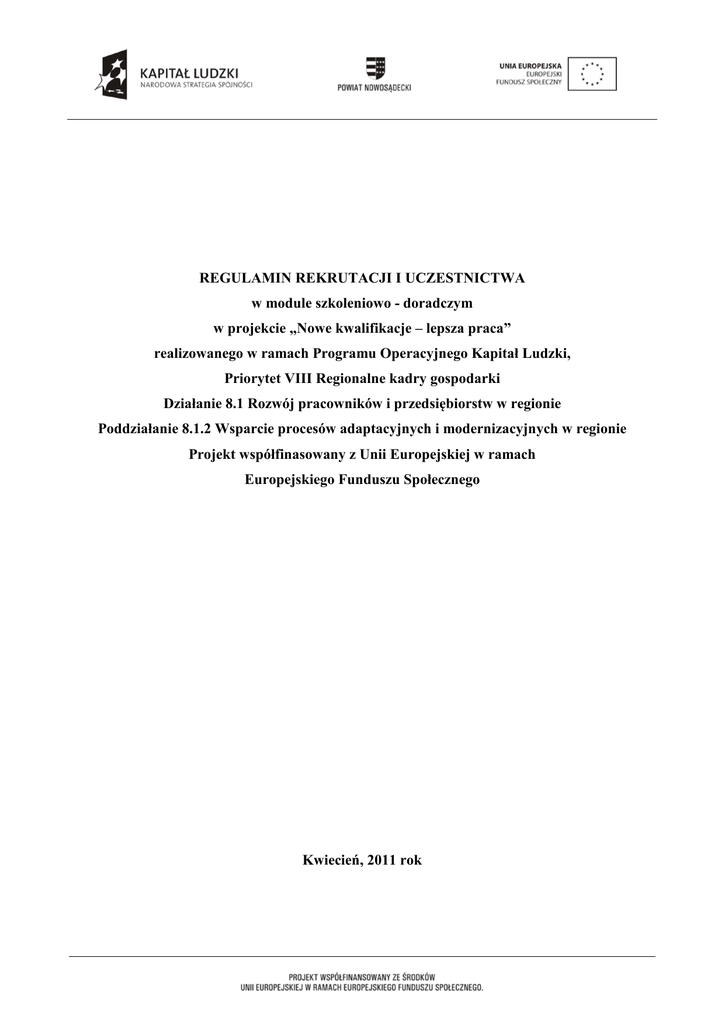 REGULAMIN REKRUTACJI I UCZESTNICTWA w module szkoleniowo - doradczym w projekcie „Nowe kwalifikacje – lepsza praca” realizowanego w ramach Programu Operacyjnego Kapitał Ludzki, Priorytet VIII Regionalne kadry gospodarki Działanie 8.1 Rozwój pracowników i przedsiębiorstw w regionie Poddziałanie 8.1.2 Wsparcie procesów adaptacyjnych i modernizacyjnych w regionie Projekt współfinasowany z Unii Europejskiej w ramach Europejskiego Funduszu Społecznego Kwiecień, 2011 rok § 1. Definicje 1. Projekt - projekt „Nowe kwalifikacje – lepsza praca”, który jest realizowany w ramach Programu Operacyjnego Kapitał Ludzki Działanie 8.1 „Rozwój pracowników i przedsiębiorstw w regionie”, Poddziałanie 8.1.2 „Wsparcie procesów adaptacyjnych i modernizacyjnych w regionie”. Projekt współfinansowany ze środków Unii Europejskiej w ramach Europejskiego Funduszu Społecznego. 2. Beneficjent – Powiat Nowosądecki, ul. Jagiellońska 33, 33-300 Nowy Sącz. 3. Realizator - Powiatowe Centrum Funduszy Europejskich ul. Nawojowska 118, 33-300 Nowy Sącz 4. Instytucja Wdrażająca (Instytucja Pośrednicząca II stopnia) - Wojewódzki Urząd Pracy w Krakowie, Plac Na Stawach 1, 30-107 Kraków. 5. Beneficjenci Ostateczni: 1) osoby fizyczne zatrudnione w mikro, małych lub średnich przedsiębiorstwach z terenu powiatu nowosądeckiego przewidziane do zwolnienia lub zagrożone zwolnieniem z pracy, 2) osoby fizyczne odchodzące z rolnictwa zamieszkujące teren powiatu nowosądeckiego, 3) mikro, małe lub średnie przedsiębiorstwa prowadzące działalność gospodarczą na terenie powiatu nowosądeckiego, które spełniają kryteria określone w niniejszym regulaminie i w wyniku przeprowadzonej rekrutacji zostaną zakwalifikowane do udziału w projekcie. 6. Komisja Rekrutacyjna - komisja powołana przez Kierownika Projektu w celu przeprowadzenia rekrutacji Beneficjentów Ostatecznych. W skład Komisji wchodzą: Kierownik Projektu, Asystent kierownika oraz Specjalista ds. rekrutacji. 7. Mikroprzedsiebiorstwo – to przedsiębiorstwo, które w co najmniej w jednym z dwóch lat obrotowych: zatrudniało średniorocznie mniej niż 10 pracowników oraz osiągnęło roczny obrót netto ze sprzedaży towarów, wyrobów i usług oraz operacji finansowych nieprzekraczający równowartości w zł 2 milionów euro, lub sumy aktywów jego bilansu sporządzonego na koniec jednego z tych lat nie przekroczy równowartości w złotych 2 miliony euro. 8. Małe przedsiębiorstwo – to przedsiębiorstwo, które w co najmniej w jednym z dwóch lat obrotowych : zatrudniało średniorocznie mniej niż 50 pracowników oraz osiągnęło roczny obrót netto ze sprzedaży towarów, wyrobów i usług oraz operacji finansowych nieprzekraczający równowartości w zł 10 milionów euro, lub sumy aktywów jego bilansu sporządzonego na koniec jednego z tych lat nie przekroczy równowartości w złotych 10 milionów euro. 9. Średnie przedsiębiorstwo - to przedsiębiorstwo, które w co najmniej w jednym z dwóch lat obrotowych: zatrudniało średniorocznie mniej niż 250 pracowników oraz osiągnęło roczny obrót netto ze sprzedaży towarów, wyrobów i usług oraz operacji finansowych nieprzekraczający równowartości w zł 50 milionów euro, lub sumy aktywów jego bilansu sporządzonego na koniec jednego z tych lat nie przekroczy równowartości w złotych 43 milionów euro. 10. Osoba odchodząca z rolnictwa – to rolnik ubezpieczony w KRUS lub jego domownik (w rozumieniu przepisów ustawy z dnia 20 grudnia 1990 r. o ubezpieczeniu społecznym rolników), zamieszkujący w gminie wiejskiej i miejsko-wiejskiej oraz w mieście do 25 tys. mieszkańców, który wykonuje działalność rolniczą, lecz w momencie przystąpienia do projektu składa oświadczenie o zamiarze podjęcia zatrudnienia w obszarach niezwiązanych z działalnością rolniczą lub o zamiarze podjęcia pozarolniczej działalności gospodarczej. W rozumieniu przepisów ustawy z dnia 20 grudnia 1990 r. o ubezpieczeniu społecznym rolników, domownikiem jest „osoba bliska rolnikowi, która: a) ukończyła 16 lat, b) pozostaje z rolnikiem we wspólnym gospodarstwie domowym lub zamieszkuje na terenie jego gospodarstwa rolnego albo w bliskim sąsiedztwie, c) stale pracuje w tym gospodarstwie. 11. Kandydat – organizacja lub osoba ubiegająca się o zakwalifikowanie do udziału w projekcie na podstawie zasad określonych w Regulaminie. 12. Uczestnik – osoba, która po spełnieniu wszystkich wymogów określonych w Regulaminie została zakwalifikowana do udziału w projekcie. 13. Osoba przewidziana do zwolnienia – osoba, która otrzymała od pracodawcy wypowiedzenie stosunku pracy, stosunku służbowego lub która została poinformowana przez pracodawcę o zamiarze nieprzedłużenia przez niego stosunku pracy lub stosunku służbowego. 14. Osoba zagrożona zwolnieniem – osoba zatrudniona u pracodawcy, który prowadzi działalność w branży przechodzącej procesy adaptacyjne lub modernizacyjne. 15. Procesy modernizacyjne i adaptacyjne przedsiębiorstw – wszelkie zmiany organizacyjne przedsiębiorstw niosące ze sobą ryzyko redukcji zatrudnienia, mające na celu przystosowanie się do zachodzących zmian gospodarczych. 16. Organizacja – przedsiębiorstwo posiadające wpis do KRS w rejestrze przedsiębiorstw delegujące pracownika, spełniające określone w regulaminie wymogi uczestnictwa w projekcie. 17. Program indywidualny - szkolenia przekwalifikowujące i usługi doradcze w zakresie wyboru nowego zawodu i zdobycia nowych umiejętności zawodowych dla: 1) osób odchodzących z rolnictwa lub rybołówstwa (rybactwa) – z własnej inicjatywy; 2) pracowników – tylko z inicjatywy pracodawcy (delegowanie); w tym przypadku pracodawca będący przedsiębiorcą, kierujący pracownika na szkolenie jest beneficjentem pomocy publicznej. 18. Wsparcie szkoleniowo- doradcze dla przedsiębiorstw- szkolenia i doradztwo dla przedsiębiorców wspom