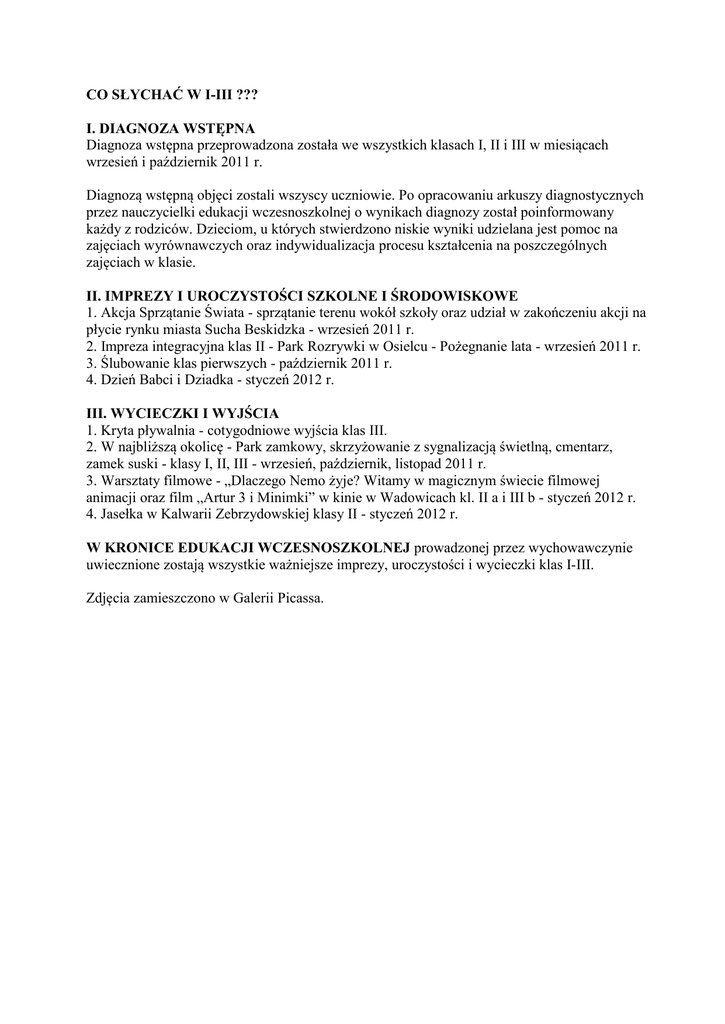 CO SŁYCHAĆ W I-III ??? I. DIAGNOZA WSTĘPNA Diagnoza wstępna przeprowadzona została we wszystkich klasach I, II i III w miesiącach wrzesień i październik 2011 r. Diagnozą wstępną objęci zostali wszyscy uczniowie. Po opracowaniu arkuszy diagnostycznych przez nauczycielki edukacji wczesnoszkolnej o wynikach diagnozy został poinformowany każdy z rodziców. Dzieciom, u których stwierdzono niskie wyniki udzielana jest pomoc na zajęciach wyrównawczych oraz indywidualizacja procesu kształcenia na poszczególnych zajęciach w klasie. II. IMPREZY I UROCZYSTOŚCI SZKOLNE I ŚRODOWISKOWE 1. Akcja Sprzątanie Świata - sprzątanie terenu wokół szkoły oraz udział w zakończeniu akcji na płycie rynku miasta Sucha Beskidzka - wrzesień 2011 r. 2. Impreza integracyjna klas II - Park Rozrywki w Osielcu - Pożegnanie lata - wrzesień 2011 r. 3. Ślubowanie klas pierwszych - październik 2011 r. 4. Dzień Babci i Dziadka - styczeń 2012 r. III. WYCIECZKI I WYJŚCIA 1. Kryta pływalnia - cotygodniowe wyjścia klas III. 2. W najbliższą okolicę - Park zamkowy, skrzyżowanie z sygnalizacją świetlną, cmentarz, zamek suski - klasy I, II, III - wrzesień, październik, listopad 2011 r. 3. Warsztaty filmowe - „Dlaczego Nemo żyje? Witamy w magicznym świecie filmowej animacji oraz film „Artur 3 i Minimki” w kinie w Wadowicach kl. II a i III b - styczeń 2012 r. 4. Jasełka w Kalwarii Zebrzydowskiej klasy II - styczeń 2012 r. W KRONICE EDUKACJI WCZESNOSZKOLNEJ prowadzonej przez wychowawczynie uwiecznione zostają wszystkie ważniejsze imprezy, uroczystości i wycieczki klas I-III. Zdjęcia zamieszczono w Galerii Picassa.
