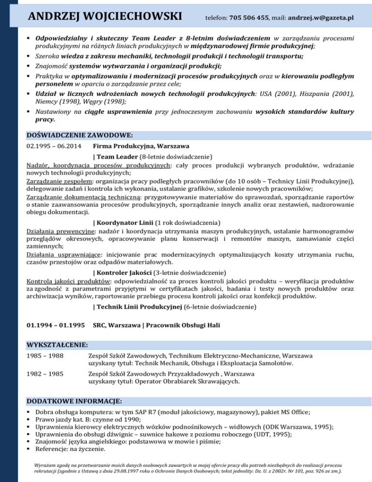 ANDRZEJ WOJCIECHOWSKI telefon: 705 506 455, mail: [email protected] Odpowiedzialny i skuteczny Team Leader z 8-letnim doświadczeniem w zarządzaniu procesami produkcyjnymi na różnych liniach produkcyjnych w międzynarodowej firmie produkcyjnej; Szeroka wiedza z zakresu mechaniki, technologii produkcji i technologii transportu; Znajomość systemów wytwarzania i organizacji produkcji; Praktyka w optymalizowaniu i modernizacji procesów produkcyjnych oraz w kierowaniu podległym personelem w oparciu o zarządzanie przez cele; Udział w licznych wdrożeniach nowych technologii produkcyjnych: USA (2001), Hiszpania (2001), Niemcy (1998), Węgry (1998); Nastawiony na ciągłe usprawnienia przy jednoczesnym zachowaniu wysokich standardów kultury pracy. DOŚWIADCZENIE ZAWODOWE: 02.1995 – 06.2014 Firma Produkcyjna, Warszawa | Team Leader (8-letnie doświadczenie) Nadzór, koordynacja procesów produkcyjnych: cały proces produkcji wybranych produktów, wdrażanie nowych technologii produkcyjnych; Zarządzanie zespołem: organizacja pracy podległych pracowników (do 10 osób – Technicy Linii Produkcyjnej), delegowanie zadań i kontrola ich wykonania, ustalanie grafików, szkolenie nowych pracowników; Zarządzanie dokumentacją techniczną: przygotowywanie materiałów do sprawozdań, sporządzanie raportów o stanie zaawansowania procesów produkcyjnych, sporządzanie innych analiz oraz zestawień, nadzorowanie obiegu dokumentacji. | Koordynator Linii (1 rok doświadczenia) Działania prewencyjne: nadzór i koordynacja utrzymania maszyn produkcyjnych, ustalanie harmonogramów przeglądów okresowych, opracowywanie planu konserwacji i remontów maszyn, zamawianie części zamiennych; Działania usprawniające: inicjowanie prac modernizacyjnych optymalizujących koszty utrzymania ruchu, czasów przestojów oraz odpadów materiałowych. | Kontroler Jakości (3-letnie doświadczenie) Kontrola jakości produktów: odpowiedzialność za proces kontroli jakości produktu – weryfikacja produktów za zgodność z parametrami przyjętymi w certyfikatach jakości, badania i testy nowych produktów oraz archiwizacja wyników, raportowanie przebiegu procesu kontroli jakości oraz konfekcji produktów. | Technik Linii Produkcyjnej (6-letnie doświadczenie) 01.1994 – 01.1995 SRC, Warszawa | Pracownik Obsługi Hali WYKSZTAŁCENIE: 1985 – 1988 Zespół Szkół Zawodowych, Technikum Elektryczno-Mechaniczne, Warszawa uzyskany tytuł: Technik Mechanik, Obsługa i Eksploatacja Samolotów. 1982 – 1985 Zespół Szkół Zawodowych Przyzakładowych , Warszawa uzyskany tytuł: Operator Obrabiarek Skrawających. DODATKOWE INFORMACJE: Dobra obsługa komputera: w tym SAP R7 (moduł jakościowy, magazynowy), pakiet MS Office; Prawo jazdy kat. B: czynne od 1990; Uprawnienia kierowcy elektrycznych wózków podnośnikowych – widłowych (ODK Warszawa, 1995); Uprawnienia do obsługi dźwignic – suwnice hakowe z poziomu roboczego (UDT, 1995); Znajomość języka angielskiego: podstawowa w mowie i piśmie; Referencje: na życzenie. Wyrażam zgodę na przetwarzanie moich danych osobowych zawartych w mojej ofercie pracy dla potrzeb niezbędnych do realizacji procesu rekrutacji (zgodnie z Ustawą z dnia 29.08.1997 roku o Ochronie Danych Osobowych; tekst jednolity: Dz. U. z 2002r. Nr 101, poz. 926 ze zm.).