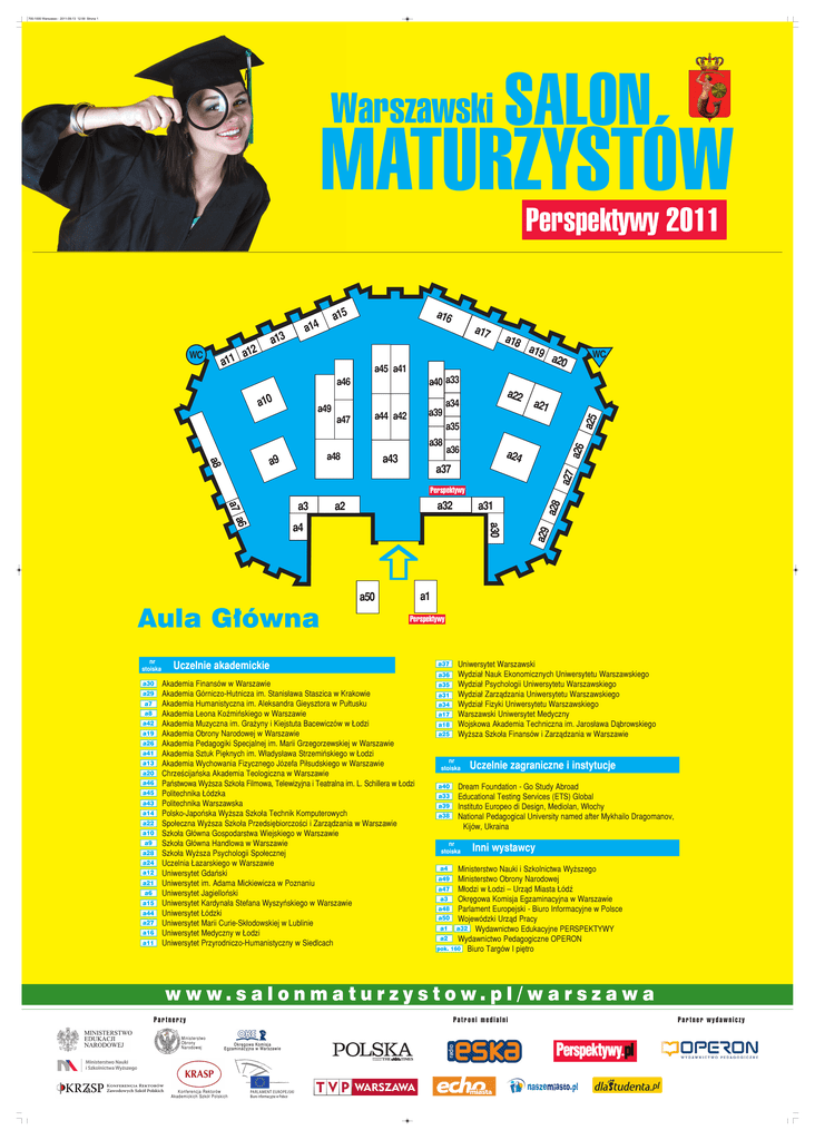 700-1000 Warszawa:- 2011-09-13 12:59 Strona 1 Warszawski SALON MATURZYSTÓW Perspektywy 2011 a16 a17 a18 a45 a41 a21 a35 a38 a48 a8 a9 a34 a25 a47 a39 a44 a42 a22 a43 a36 a26 a49 WC a40 a33 a46 a10 a19 a20 a24 a37 a27 WC a14 a13 12 a a11 a15 Perspektywy a32 a4 Aula Główna nr stoiska a30 a29 a7 a8 a42 a19 a26 a41 a13 a20 a46 a45 a43 a14 a22 a10 a9 a28 a24 a12 a21 a6 a15 a44 a27 a16 a11 a28 a31 a29 a2 a30 a6 a7 a3 a1 a50 Perspektywy Uczelnie akademickie Akademia Finansów w Warszawie Akademia Górniczo-Hutnicza im. Stanisława Staszica w Krakowie Akademia Humanistyczna im. Aleksandra Gieysztora w Pułtusku Akademia Leona Koźmińskiego w Warszawie Akademia Muzyczna im. Grażyny i Kiejstuta Bacewiczów w Łodzi Akademia Obrony Narodowej w Warszawie Akademia Pedagogiki Specjalnej im. Marii Grzegorzewskiej w Warszawie Akademia Sztuk Pięknych im. Władysława Strzemińskiego w Łodzi Akademia Wychowania Fizycznego Józefa Piłsudskiego w Warszawie Chrześcijańska Akademia Teologiczna w Warszawie Państwowa Wyższa Szkoła Filmowa, Telewizyjna i Teatralna im. L. Schillera w Łodzi Politechnika Łódzka Politechnika Warszawska Polsko-Japońska Wyższa Szkoła Technik Komputerowych Społeczna Wyższa Szkoła Przedsiębiorczości i Zarządzania w Warszawie Szkoła Główna Gospodarstwa Wiejskiego w Warszawie Szkoła Główna Handlowa w Warszawie Szkoła Wyższa Psychologii Społecznej Uczelnia Łazarskiego w Warszawie Uniwersytet Gdański Uniwersytet im. Adama Mickiewicza w Poznaniu Uniwersytet Jagielloński Uniwersytet Kardynała Stefana Wyszyńskiego w Warszawie Uniwersytet Łódzki Uniwersytet Marii Curie-Skłodowskiej w Lublinie Uniwersytet Medyczny w Łodzi Uniwersytet Przyrodniczo-Humanistyczny w Siedlcach a37 a36 a35 a31 a34 a17 a18 a25 Uniwersytet Warszawski Wydział Nauk Ekonomicznych Uniwersytetu Warszawskiego Wydział Psychologii Uniwersytetu Warszawskiego Wydział Zarządzania Uniwersytetu Warszawskiego Wydział Fizyki Uniwersytetu Warszawskiego Warszawski Uniwersytet Medyczny Wojskowa Akademia Techniczna im. Jarosława Dąbrowskiego Wyższa Szkoła Finansów i Zarządzania w Warszawie nr stoiska a40 a33 a39 a38 Uczelnie zagraniczne i instytucje Dream Foundation - Go Study Abroad Educational Testing Services (ETS) Global Instituto Europeo di Design, Mediolan, Włochy National Pedagogical University named after Mykhailo Dragomanov, Kijów, Ukraina nr stoiska Inni wystawcy a4 Ministerstwo Nauki i Szkolnictwa Wyższego a49 Ministerstwo Obrony Narodowej a47 Młodzi w Łodzi — Urząd Miasta Łódź a3 Okręgowa Komisja Egzaminacyjna w Warszawie a48 Parlament Europejski - Biuro Informacyjne w Polsce a50 Wojewódzki Urząd Pracy a1 a32 Wydawnictwo Edukacyjne PERSPEKTYWY a2 Wydawnictwo Pedagogiczne OPERON pok. 160 Biuro Targów I piętro w w w. s a l o n m a t u r z y s t o w. p l / w a r s z a w a Partnerzy Ministerstwo Obrony Narodowej Patroni medialni Okręgowa Komisja Egzaminacyjna w Warszawie Konferencja Rektorów Akademickich Szkół Polskich Partner wydawniczy