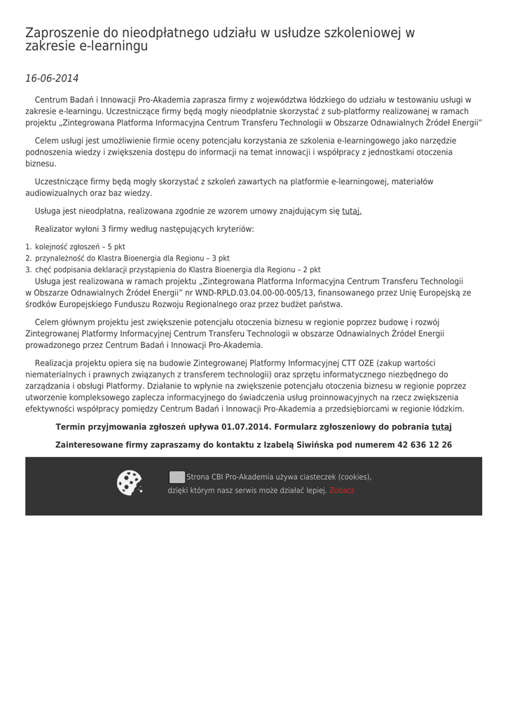 Zaproszenie do nieodpłatnego udziału w usłudze szkoleniowej w zakresie e-learningu 16-06-2014 Centrum Badań i Innowacji Pro-Akademia zaprasza firmy z województwa łódzkiego do udziału w testowaniu usługi w zakresie e-learningu. Uczestniczące firmy będą mogły nieodpłatnie skorzystać z sub-platformy realizowanej w ramach projektu „Zintegrowana Platforma Informacyjna Centrum Transferu Technologii w Obszarze Odnawialnych Źródeł Energii” Celem usługi jest umożliwienie firmie oceny potencjału korzystania ze szkolenia e-learningowego jako narzędzie podnoszenia wiedzy i zwiększenia dostępu do informacji na temat innowacji i współpracy z jednostkami otoczenia biznesu. Uczestniczące firmy będą mogły skorzystać z szkoleń zawartych na platformie e-learningowej, materiałów audiowizualnych oraz baz wiedzy. Usługa jest nieodpłatna, realizowana zgodnie ze wzorem umowy znajdującym się tutaj. Realizator wyłoni 3 firmy według następujących kryteriów: 1. kolejność zgłoszeń – 5 pkt 2. przynależność do Klastra Bioenergia dla Regionu – 3 pkt 3. chęć podpisania deklaracji przystąpienia do Klastra Bioenergia dla Regionu – 2 pkt Usługa jest realizowana w ramach projektu „Zintegrowana Platforma Informacyjna Centrum Transferu Technologii w Obszarze Odnawialnych Źródeł Energii” nr WND-RPLD.03.04.00-00-005/13, finansowanego przez Unię Europejską ze środków Europejskiego Funduszu Rozwoju Regionalnego oraz przez budżet państwa. Celem głównym projektu jest zwiększenie potencjału otoczenia biznesu w regionie poprzez budowę i rozwój Zintegrowanej Platformy Informacyjnej Centrum Transferu Technologii w obszarze Odnawialnych Źródeł Energii prowadzonego przez Centrum Badań i Innowacji Pro-Akademia. Realizacja projektu opiera się na budowie Zintegrowanej Platformy Informacyjnej CTT OZE (zakup wartości niematerialnych i prawnych związanych z transferem technologii) oraz sprzętu informatycznego niezbędnego do zarządzania i obsługi Platformy. Działanie to wpłynie na zwiększenie potencjału otoczenia biznesu w regionie poprzez utworzenie kompleksowego zaplecza informacyjnego do świadczenia usług proinnowacyjnych na rzecz zwiększenia efektywności współpracy pomiędzy Centrum Badań i Innowacji Pro-Akademia a przedsiębiorcami w regionie łódzkim. Termin przyjmowania zgłoszeń upływa 01.07.2014. Formularz zgłoszeniowy do pobrania tutaj Zainteresowane firmy zapraszamy do kontaktu z Izabelą Siwińska pod numerem 42 636 12 26 Strona CBI Pro-Akademia używa ciasteczek (cookies), dzięki którym nasz serwis może działać lepiej. Zobacz