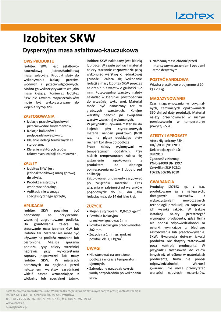 Izobitex SKW Izotex Izobitex SKW Dyspersyjna masa asfaltowo-kauczukowa Izobitex SKW jest jednoskładnikową masą gotową do użycia. Produkt elastyczny i wodorozcieńczalny. Aplikacja nie wymaga specjalistycznego sprzętu, Izobitex SKW nakładany jest kielnią lub pacą. W czasie aplikacji materiał należy starannie rozprowadzić pacą wykonując warstwę o jednakowej grubości. Zaleca się wykonanie izolacji z masy Izobitex SKW poprzez nałożenie 2-3 warstw o grubości 1-2 mm. Poszczególne warstwy należy nakładać w kierunku prostopadłym do wcześniej wykonanej. Materiał może być nanoszony też w grubszych warstwach. Kolejne warstwy nanosić po związaniu warstw wcześniej wykonanych. W przypadku używania materiału do klejenia płyt styropianowych materiał nanosić punktowo (8-10 szt. na płytę) dociskając płyty ruchem kolistym do podłoża. Prace należy wykonywać w temperaturach dodatnich. Przy niskich temperaturach zaleca się wstawienie opakowania z produktem do ciepłego pomieszczenia na 1 – 2 doby przed aplikacją. Zaizolowane fundamenty zasypywać po związaniu materiału. Czas wiązania w zależności od warunków pogodowych: do 3-5 dni jako izolacja; max. do 14 dni jako klej. APLIKACJA ZUŻYCIE Izobitex SKW powinien być nanoszony na oczyszczone, wcześniej zagruntowane podłoża. Do gruntowania zaleca się stosowanie mas: Izobitex GW lub Izobitex GR. Materiał nie może być używany na podłoża zmrożone lub oszronione. Miejsca spękania podłoża, rysy należy wcześniej naprawić przy wykorzystaniu zaprawy naprawczej lub masy Izobitex SKW. W miejscach narażonych na spękania przed nałożeniem warstwy zasadniczej wkleić pasma wzmacniające z włókniny lub specjalnej taśmy. Klejenie styropianu: 0,8-2,0 kg/m . Powłoka izolacyjna przeciwwilgociowa: 2 mm Powłoka izolacyjna przeciwwodna: 3x2 mm Zużycie na 1 mm gr. mokrej 2 powłoki ok. 1,2 kg/m . OPIS PRODUKTU Izobitex SKW jest asfaltowokauczukową jednoskładnikową masą izolacyjną. Produkt służy do wykonywania izolacji przeciwwodnych i przeciwwilgociowych. Można go wykorzystywać także jako masę klejącą. Ponieważ Izobitex SKW nie zawiera rozpuszczalników może być wykorzystywany do klejenia styropianu. ZASTOSOWANIA Izolacje przeciwwilgociowe i przeciwwodne fundamentów. Izolacje balkonów i podposadzkowe piwnic. Klejenie izolacji termicznych ze styropianu. Klejenie niektórych typów rolowanych izolacji bitumicznych. ZALETY 2 UWAGI Nie stosować na zmrożone podłoża i w czasie temperatur ujemnych. Zabrudzone narzędzia czyścić wodą bezpośrednio po wykonaniu prac. Karta techniczna produktu ver. 0412. W przypadku chęci uzyskania aktualnych danych proszę kontaktować się z: IZOTEX Sp. z o.o., ul. Strońska 6B, 50-540 Wrocław Karta tel. +48 71 795-07-26, +48 71 795-07-46, fax. +48 71 792-79-64 www.izotex.pl [email protected] Nałożoną masę chronić przed intensywnym suszeniem i opadami atmosferycznymi. POSTAĆ HANDLOWA Wiadra plastikowe o pojemności 10 kg i 20 kg. MAGAZYNOWANIE Czas magazynowania w oryginalnych, zamkniętych opakowaniach 360 dni od daty produkcji. Materiał należy przechowywać w suchym pomieszczeniu w temperaturze powyżej +5 ºC. ATESTY I APROBATY Atest Higieniczny PZH: HK/B/0310/01/2011 Deklaracja zgodności: 98/2010 Zgodność z Normą: PN-B-24000 DN:1997 Certyfikat ZKP PCBC: FD/13/BG/30/2010 GWARANCJA Produkty IZOTEX sp. z o.o. produkowane są z najlepszych, dostępnych surowców z wykorzystaniem nowoczesnych technologii produkcji, co zapewnia ich wysoką jakość. W trakcie instalacji należy przestrzegać wymogów producenta, gdyż firma nie ponosi odpowiedzialności za usterki wynikające z błędnego zastosowania lub przechowywania. SKW. Gwarancja dotyczy jakości produktu. Nie dotyczy zastosowań poza kontrolą producenta. W przypadku zastosowań do celów innych niż określone w materiałach producenta, firma nie ponosi odpowiedzialności. Wartość gwarancji nie może przewyższać wartości nabytych materiałów.
