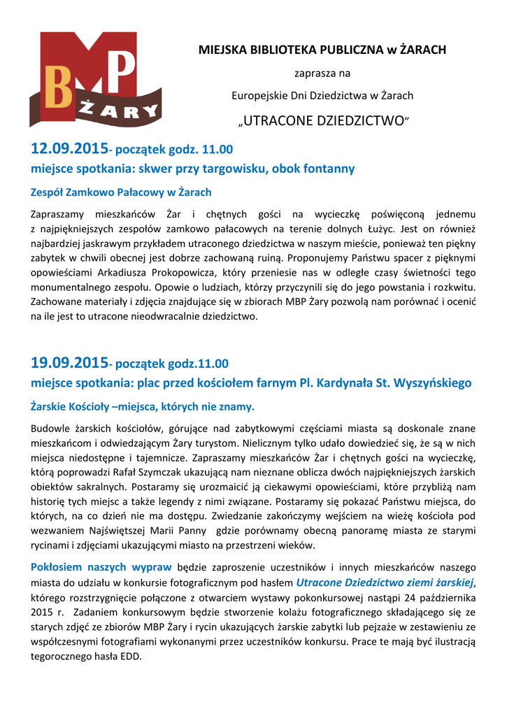 MIEJSKA BIBLIOTEKA PUBLICZNA w ŻARACH zaprasza na Europejskie Dni Dziedzictwa w Żarach „UTRACONE DZIEDZICTWO” 12.09.2015- początek godz. 11.00 miejsce spotkania: skwer przy targowisku, obok fontanny Zespół Zamkowo Pałacowy w Żarach Zapraszamy mieszkańców Żar i chętnych gości na wycieczkę poświęconą jednemu z najpiękniejszych zespołów zamkowo pałacowych na terenie dolnych Łużyc. Jest on również najbardziej jaskrawym przykładem utraconego dziedzictwa w naszym mieście, ponieważ ten piękny zabytek w chwili obecnej jest dobrze zachowaną ruiną. Proponujemy Państwu spacer z pięknymi opowieściami Arkadiusza Prokopowicza, który przeniesie nas w odległe czasy świetności tego monumentalnego zespołu. Opowie o ludziach, którzy przyczynili się do jego powstania i rozkwitu. Zachowane materiały i zdjęcia znajdujące się w zbiorach MBP Żary pozwolą nam porównać i ocenić na ile jest to utracone nieodwracalnie dziedzictwo. 19.09.2015- początek godz.11.00 miejsce spotkania: plac przed kościołem farnym Pl. Kardynała St. Wyszyńskiego Żarskie Kościoły –miejsca, których nie znamy. Budowle żarskich kościołów, górujące nad zabytkowymi częściami miasta są doskonale znane mieszkańcom i odwiedzającym Żary turystom. Nielicznym tylko udało dowiedzieć się, że są w nich miejsca niedostępne i tajemnicze. Zapraszamy mieszkańców Żar i chętnych gości na wycieczkę, którą poprowadzi Rafał Szymczak ukazującą nam nieznane oblicza dwóch najpiękniejszych żarskich obiektów sakralnych. Postaramy się urozmaicić ją ciekawymi opowieściami, które przybliżą nam historię tych miejsc a także legendy z nimi związane. Postaramy się pokazać Państwu miejsca, do których, na co dzień nie ma dostępu. Zwiedzanie zakończymy wejściem na wieżę kościoła pod wezwaniem Najświętszej Marii Panny gdzie porównamy obecną panoramę miasta ze starymi rycinami i zdjęciami ukazującymi miasto na przestrzeni wieków. Pokłosiem naszych wypraw będzie zaproszenie uczestników i innych mieszkańców naszego miasta do udziału w konkursie fotograficznym pod hasłem Utracone Dziedzictwo ziemi żarskiej, którego rozstrzygnięcie połączone z otwarciem wystawy pokonkursowej nastąpi 24 października 2015 r. Zadaniem konkursowym będzie stworzenie kolażu fotograficznego składającego się ze starych zdjęć ze zbiorów MBP Żary i rycin ukazujących żarskie zabytki lub pejzaże w zestawieniu ze współczesnymi fotografiami wykonanymi przez uczestników konkursu. Prace te mają być ilustracją tegorocznego hasła EDD.