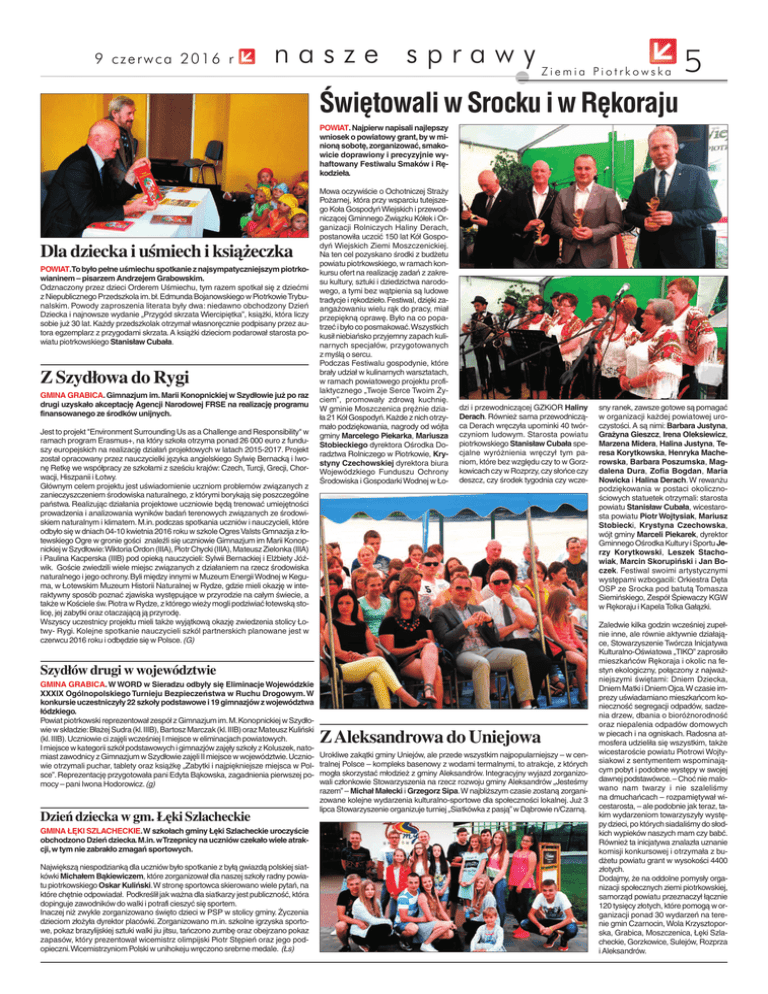 9 czerwca 2016 r nasze sprawy Ziemia Piotrkowska 5 Świętowali w Srocku i w Rękoraju POWIAT. Najpierw napisali najlepszy wniosek o powiatowy grant, by w minioną sobotę, zorganizować, smakowicie doprawiony i precyzyjnie wyhaftowany Festiwalu Smaków i Rękodzieła. Dla dziecka i uśmiech i książeczka POWIAT.To było pełne uśmiechu spotkanie z najsympatyczniejszym piotrkowianinem – pisarzem Andrzejem Grabowskim. Odznaczony przez dzieci Orderem Uśmiechu, tym razem spotkał się z dziećmi z Niepublicznego Przedszkola im.bł.Edmunda Bojanowskiego w Piotrkowie Trybunalskim. Powody zaproszenia literata były dwa: niedawno obchodzony Dzień Dziecka i najnowsze wydanie „Przygód skrzata Wiercipiętka”, książki, która liczy sobie już 30 lat. Każdy przedszkolak otrzymał własnoręcznie podpisany przez autora egzemplarz z przygodami skrzata. A książki dzieciom podarował starosta powiatu piotrkowskiego Stanisław Cubała. Z Szydłowa do Rygi GMINA GRABICA. Gimnazjum im. Marii Konopnickiej w Szydłowie już po raz drugi uzyskało akceptację Agencji Narodowej FRSE na realizację programu finansowanego ze środków unijnych. Jest to projekt "Environment Surrounding Us as a Challenge and Responsibility" w ramach program Erasmus+, na który szkoła otrzyma ponad 26 000 euro z funduszy europejskich na realizację działań projektowych w latach 2015-2017. Projekt został opracowany przez nauczycielki języka angielskiego Sylwię Bernacką i Iwonę Retkę we współpracy ze szkołami z sześciu krajów: Czech, Turcji, Grecji, Chorwacji, Hiszpanii i Łotwy. Głównym celem projektu jest uświadomienie uczniom problemów związanych z zanieczyszczeniem środowiska naturalnego, z którymi borykają się poszczególne państwa. Realizując działania projektowe uczniowie będą trenować umiejętności prowadzenia i analizowania wyników badań terenowych związanych ze środowiskiem naturalnym i klimatem. M.in. podczas spotkania uczniów i nauczycieli, które odbyło się w dniach 04-10 kwietnia 2016 roku w szkole Ogres Valsts Gmnazija z łotewskiego Ogre w gronie gości znaleźli się uczniowie Gimnazjum im Marii Konopnickiej w Szydłowie:Wiktoria Ordon (IIIA), Piotr Chycki (IIIA), Mateusz Zielonka (IIIA) i Paulina Kacperska (IIIB) pod opieką nauczycieli: Sylwii Bernackiej i Elżbiety Jóźwik. Goście zwiedzili wiele miejsc związanych z działaniem na rzecz środowiska naturalnego i jego ochrony. Byli między innymi w Muzeum Energii Wodnej w Keguma, w Łotewskim Muzeum Historii Naturalnej w Rydze, gdzie mieli okazję w interaktywny sposób poznać zjawiska występujące w przyrodzie na całym świecie, a także w Kościele św.Piotra w Rydze, z którego wieży mogli podziwiać łotewską stolicę, jej zabytki oraz otaczającą ją przyrodę. Wszyscy uczestnicy projektu mieli także wyjątkową okazję zwiedzenia stolicy Łotwy- Rygi. Kolejne spotkanie nauczycieli szkól partnerskich planowane jest w czerwcu 2016 roku i odbędzie się w Polsce. (G) Mowa oczywiście o Ochotniczej Straży Pożarnej, która przy wsparciu tutejszego Koła Gospodyń Wiejskich i przewodniczącej Gminnego Związku Kółek i Organizacji Rolniczych Haliny Derach, postanowiła uczcić 150 lat Kół Gospodyń Wiejskich Ziemi Moszczenickiej. Na ten cel pozyskano środki z budżetu powiatu piotrkowskiego, w ramach konkursu ofert na realizację zadań z zakresu kultury, sztuki i dziedzictwa narodowego, a tymi bez wątpienia są ludowe tradycje i rękodzieło. Festiwal, dzięki zaangażowaniu wielu rąk do pracy, miał przepiękną oprawę. Było na co popatrzeć i było co posmakować.Wszystkich kusił niebiańsko przyjemny zapach kulinarnych specjałów, przygotowanych z myślą o sercu. Podczas Festiwalu gospodynie, które brały udział w kulinarnych warsztatach, w ramach powiatowego projektu profilaktycznego „Twoje Serce Twoim Życiem”, promowały zdrową kuchnię. W gminie Moszczenica prężnie działa 21 Kół Gospodyń.Każde z nich otrzymało podziękowania, nagrody od wójta gminy Marcelego Piekarka, Mariusza Stobieckiego dyrektora Ośrodka Doradztwa Rolniczego w Piotrkowie, Krystyny Czechowskiej dyrektora biura Wojewódzkiego Funduszu Ochrony Środowiska i Gospodarki Wodnej w Ło- dzi i przewodniczącej GZKiOR Haliny Derach. Również sama przewodnicząca Derach wręczyła upominki 40 twórczyniom ludowym. Starosta powiatu piotrkowskiego Stanisław Cubała specjalne wyróżnienia wręczył tym paniom, które bez względu czy to w Gorzkowicach czy w Rozprzy, czy słońce czy deszcz, czy środek tygodnia czy wcze- Szydłów drugi w województwie GMINA GRABICA. W WORD w Sieradzu odbyły się Eliminacje Wojewódzkie XXXIX Ogólnopolskiego Turnieju Bezpieczeństwa w Ruchu Drogowym. W konkursie uczestniczyły 22 szkoły podstawowe i 19 gimnazjów z województwa łódzkiego. Powiat piotrkowski reprezentował zespół z Gimnazjum im.M.Konopnickiej w Szydłowie w składzie:Błażej Sudra (kl.IIIB), Bartosz Marczak (kl.IIIB) oraz Mateusz Kuliński (kl. IIIB). Uczniowie ci zajęli wcześniej I miejsce w eliminacjach powiatowych. I miejsce w kategorii szkół podstawowych i gimnazjów zajęły szkoły z Koluszek, natomiast zawodnicy z Gimnazjum w Szydłowie zajęli II miejsce w województwie.Uczniowie otrzymali puchar, tablety oraz książkę „Zabytki i najpiękniejsze miejsca w Polsce”. Reprezentację przygotowała pani Edyta Bąkowska, zagadnienia pierwszej pomocy – pani Iwona Hodorowicz.(g) Dzień dziecka w gm. Łęki Szlacheckie GMINA ŁĘKI SZLACHECKIE.W szkołach gminy Łęki Szlacheckie uroczyście obchodzono Dzień dziecka. M.in. w Trzepnicy na uczniów czekało wiele atrakcji, w tym nie zabrakło zmagań sportowych. Największą niespodzianką dla uczniów było spotkanie z byłą gwiazdą polskiej siatkówki Michałem Bąkiewiczem, które zorganizował dla naszej szkoły radny powiatu piotrkowskiego Oskar Kuliński.W stronę sportowca skierowano wiele pytań, na które chętnie odpowiadał. Po