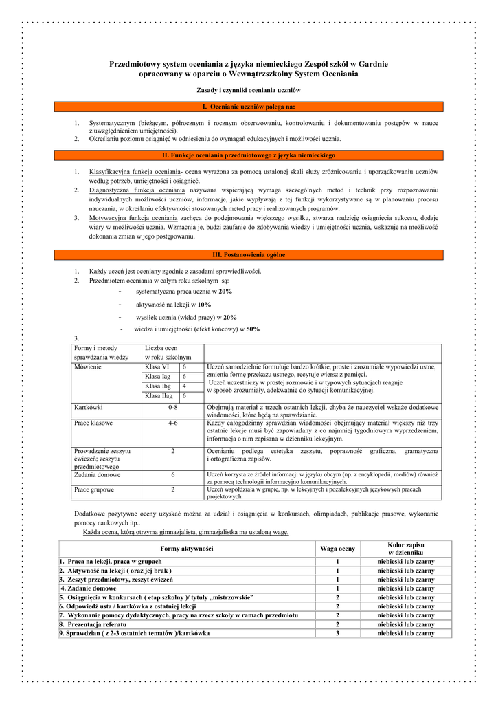 Przedmiotowy system oceniania z języka niemieckiego Zespół szkół w Gardnie opracowany w oparciu o Wewnątrzszkolny System Oceniania Zasady i czynniki oceniania uczniów I. Ocenianie uczniów polega na: 1. 2. Systematycznym (bieżącym, półrocznym i rocznym obserwowaniu, kontrolowaniu i dokumentowaniu postępów w nauce z uwzględnieniem umiejętności). Określaniu poziomu osiągnięć w odniesieniu do wymagań edukacyjnych i możliwości ucznia. II. Funkcje oceniania przedmiotowego z języka niemieckiego 1. 2. 3. Klasyfikacyjna funkcja oceniania- ocena wyrażona za pomocą ustalonej skali służy zróżnicowaniu i uporządkowaniu uczniów według potrzeb, umiejętności i osiągnięć. Diagnostyczna funkcja oceniania nazywana wspierającą wymaga szczególnych metod i technik przy rozpoznawaniu indywidualnych możliwości uczniów, informacje, jakie wypływają z tej funkcji wykorzystywane są w planowaniu procesu nauczania, w określaniu efektywności stosowanych metod pracy i realizowanych programów. Motywacyjna funkcja oceniania zachęca do podejmowania większego wysiłku, stwarza nadzieję osiągnięcia sukcesu, dodaje wiary w możliwości ucznia. Wzmacnia je, budzi zaufanie do zdobywania wiedzy i umiejętności ucznia, wskazuje na możliwość dokonania zmian w jego postępowaniu. III. Postanowienia ogólne 1. 2. Każdy uczeń jest oceniany zgodnie z zasadami sprawiedliwości. Przedmiotem oceniania w całym roku szkolnym są: - systematyczna praca ucznia w 20% - aktywność na lekcji w 10% - wysiłek ucznia (wkład pracy) w 20% wiedza i umiejętności (efekt końcowy) w 50% 3. Formy i metody Liczba ocen sprawdzania wiedzy w roku szkolnym Mówienie Klasa VI 6 Uczeń samodzielnie formułuje bardzo krótkie, proste i zrozumiałe wypowiedzi ustne, zmienia formę przekazu ustnego, recytuje wiersz z pamięci. Klasa Iag 6 Uczeń uczestniczy w prostej rozmowie i w typowych sytuacjach reaguje Klasa Ibg 4 w sposób zrozumiały, adekwatnie do sytuacji komunikacyjnej. Klasa IIag 6 Kartkówki 0-8 Prace klasowe 4-6 Obejmują materiał z trzech ostatnich lekcji, chyba że nauczyciel wskaże dodatkowe wiadomości, które będą na sprawdzianie. Każdy całogodzinny sprawdzian wiadomości obejmujący materiał większy niż trzy ostatnie lekcje musi być zapowiadany z co najmniej tygodniowym wyprzedzeniem, informacja o nim zapisana w dzienniku lekcyjnym. Prowadzenie zeszytu ćwiczeń; zeszytu przedmiotowego Zadania domowe 2 Ocenianiu podlega estetyka i ortograficzna zapisów. zeszytu, poprawność graficzna, gramatyczna 6 Prace grupowe 2 Uczeń korzysta ze źródeł informacji w języku obcym (np. z encyklopedii, mediów) również za pomocą technologii informacyjno komunikacyjnych. Uczeń współdziała w grupie, np. w lekcyjnych i pozalekcyjnych językowych pracach projektowych Dodatkowe pozytywne oceny uzyskać można za udział i osiągnięcia w konkursach, olimpiadach, publikacje prasowe, wykonanie pomocy naukowych itp.. Każda ocena, którą otrzyma gimnazjalista, gimnazjalistka ma ustaloną wagę. Formy aktywności 1. Praca na lekcji, praca w grupach 2. Aktywność na lekcji ( oraz jej brak ) 3. Zeszyt przedmiotowy, zeszyt ćwiczeń 4. Zadanie domowe 5. Osiągnięcia w konkursach ( etap szkolny )/ tytuły „mistrzowskie” 6. Odpowiedź usta / kartkówka z ostatniej lekcji 7. Wykonanie pomocy dydaktycznych, pracy na rzecz szkoły w ramach przedmiotu 8. Prezentacja referatu 9. Sprawdzian ( z 2-3 ostatnich tematów )/kartkówka Waga oceny 1 1 1 1 2 2 2 2 3 Kolor zapisu w dzienniku niebieski lub czarny niebieski lub czarny niebieski lub czarny niebieski lub czarny niebieski lub czarny niebieski lub czarny niebieski lub czarny niebieski lub czarny niebieski lub czarny 10. Osiągnięcia w konkursach ( etap rejonowy ) 3 niebieski lub czarny 11. Odpowiedź ustna z trzech ostatnich lekcji 3 niebieski lub czarny 12. Dyktando 3 niebieski lub czarny 13. Praca klasowa / sprawdzian poprzedzony powtórzeniem wiadomości 5 czerwony 14. Realizacja i prezentacja projektu 5 czerwony 15. Test z całego działu 5 czerwony 16. Test semestralny 5 czerwony 17. Osiągnięcia w konkursach ( etap wojewódzki ) 5 czerwony 18. Samodzielne wypracowanie 5 czerwony W przypadku oceniania innej formy aktywności lub potrzeby wyróżnienia któregoś z działań nauczyciel ustala z klasą sposób oceny oraz jej wagę. IV. Uwagi 1. Uczeń zobowiązany jest mieć na lekcji zeszyt przedmiotowy, podręcznik, ćwiczenia oraz inne materiały, brak przygotowania się do lekcji zostanie oznaczony w dzienniku lekcyjnym znakiem „-”. Uczeń zgłasza nauczycielowi nieprzygotowanie do lekcji przed rozpoczęciem zajęć. Prace klasowe, sprawdziany, kartkówki, odpowiedzi ustne oraz prace domowe są obowiązkowe. 2. W przypadku nieobecności na sprawdzianie uczeń musi zaliczyć sprawdzian w ciągu dwóch tygodni od momentu powrotu do szkoły w terminie uzgodnionym z nauczycielem. 3. Uczeń ma prawo poprawić ocenę niedostateczną i dopuszczającą z pracy klasowej lub sprawdzianu ( w gimnazjum - sprawdziany, testy, prace klasowe wagi 5) najwyżej o dwa stopnie do dwóch tygodni od otrzymania tej oceny (po uprzednim uzgodnieniu z nauczycielem). Stopień uzyskany podczas poprawy prac pisemnych wpisuje się do dziennika lekcyjnego obok pierwszego stopnia np. 2/4. Jeśli uczeń otrzymuje drugą ocenę „1”, to wpisuję się ją obok pierwszej np.: 1/1, ale przy klasyfikacji traktuje się ją jako jedną ocenę niedostateczną. 4. Uczeń ma prawo do jednorazowego poprawienia oceny niedostatecznej z pracy klasowej lub sprawdzianu. 5. Każdy całogodzinny sprawdzian wiadomości obejmujący materiał większy niż trzy ostatnie lekcje musi być zapowiadany z co najmniej tygodniowym wyprzedzeniem, informacja o nim zapisana w dzienniku lekcyjnym. 6.Odpisywanie zadań domowych, korzystanie z niedozwolonych źródeł w czasie prac pisemnych, oddawanie do oceny prac nie napisanych samodzielnie równa się ocenie niedostatecznej. 7. 