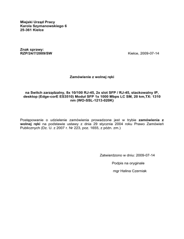Miejski Urząd Pracy Karola Szymanowskiego 6 25-361 Kielce Znak sprawy: RZP/24/7/2009/SW Kielce, 2009-07-14 Zamówienie z wolnej ręki na Switch zarządzalny, 8x 10/100 RJ-45, 2x slot SFP / RJ-45, stackowalny IP, desktop (Edge-corE ES3510) Moduł SFP 1x 1000 Mbps LC SM, 20 km,TX: 1310 nm (WO-SSL-1213-020K) Postępowanie o udzielenie zamówienia prowadzone jest w trybie zamówienia z wolnej ręki na podstawie ustawy z dnia 29 stycznia 2004 roku Prawo Zamówień Publicznych (Dz. U. z 2007 r. Nr 223, poz. 1655, z późn. zm.) Zatwierdzono w dniu: 2009-07-14 Podpis na oryginale mgr Halina Czerniak Istotne Warunki Zamówienia Switch zarzadzalny, 8x 10/100 RJ-45, 2x slot SFP / RJ-45, stackowalny IP, desktop (Edge-corE ES3510) Moduł SFP 1x 1000 Mbps LC SM, 20 km,TX: 1310 nm (WO-SSL-1213-020K) Zamawiający: Miejski Urząd Pracy Karola Szymanowskiego 6 25-361 Kielce Tryb udzielenia zamówienia: Zgodnie z art. 66 ustawy z dnia 29 stycznia 2004 r. Prawo zamówień publicznych (Dz. U. z 2007 r. Nr 223, poz. 1655, z późn. zm.) zamawiający zaprasza do przystąpienia do postępowania w trybie zamówienia z wolnej ręki: Atel Electronics Oleska 121 45-231 Opole Opis przedmiotu zamówienia: 1.1 Przedmiotem zamówienia jest Switch zarzadzalny, 8x 10/100 RJ-45, 2x slot SFP / RJ-45, stackowalny IP, desktop (Edge-corE ES3510) Moduł SFP 1x 1000 Mbps LC SM, 20 km,TX: 1310 nm (WO-SSL-1213-020K). Termin wykonania zamówienia: Zamówienie musi zostać zrealizowane w terminie: 7 dni od daty udzielenia zamówienia Warunki udziału w postępowaniu: 1.2 W postępowaniu może wziąć udział Wykonawca niewykluczony na podstawie art. 24 ustawy z dnia 29 stycznia 2004 roku Prawo Zamówień Publicznych (Dz. U. z 2007 r. Nr 223, poz. 1655, z późn. zm.), spełniający warunki i wymagania określone w Zaproszeniu oraz w art. 22 ustawy Prawo Zamówień Publicznych. Sposób porozumiewania się zamawiającego z wykonawcą: 1.3 Osoby uprawnione do porozumiewania się z Wykonawcą: a: W zakresie proceduralnym osobami upoważnionymi do kontaktu z Wykonawcą są: 1 mgr inż. Waldemar Smulczyński - p.o. Starszy specjalista tel. (041) 3406031 b: W zakresie merytorycznym osobami upoważnionymi do kontaktu z Wykonawcą są: 1 mgr inż. Bohdan Łabęcki - Kierownik Ośrodka Partnerstwa Współpracy i Rozwoju tel. (0-41) 3406066 Istotne postanowienia umowy: 1.4 Istotne postanowienia umowy określa wzór umowy stanowiący załącznik do niniejszego Zaproszenia. Termin składania oferty: 1.5 Siedziba zamawiającego (59), dnia 2009-07-21 o godzinie 11:00 Załącznikami do niniejszego dokumentu są: Nr 1 2 Nazwa dokumentu / wzoru: Wzór oferty na dostawy Wzór do SIWZ(wzór) Strona: 2/2