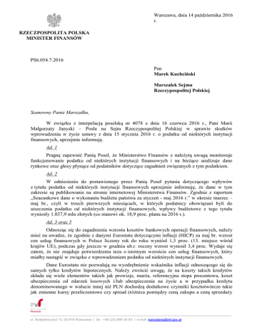 Warszawa, dnia 14 października 2016 r. RZECZPOSPOLITA POLSKA MINISTER FINANSÓW PS6.054.7.2016 Pan Marek Kuchciński Marszałek Sejmu Rzeczypospolitej Polskiej Szanowny Panie Marszałku, W związku z interpelacją poselską nr 4078 z dnia 16 czerwca 2016 r., Pani Marii Małgorzaty Janyski – Posła na Sejm Rzeczypospolitej Polskiej w sprawie skutków wprowadzenia w życie ustawy z dnia 15 stycznia 2016 r. o podatku od niektórych instytucji finansowych, uprzejmie informuję. Ad. 1 Pragnę zapewnić Panią Poseł, że Ministerstwo Finansów z należytą uwagą monitoruje funkcjonowanie podatku od niektórych instytucji finansowych i na bieżąco analizuje dane rynkowe oraz głosy płynące od podatników dotyczące zagadnień związanych z tym podatkiem. Ad. 2 W odniesieniu do postawionego przez Panią Poseł pytania dotyczącego wpływów z tytułu podatku od niektórych instytucji finansowych uprzejmie informuję, że dane w tym zakresie są publikowanie na stronie internetowej Ministerstwa Finansów. Zgodnie z raportem „Szacunkowe dane o wykonaniu budżetu państwa za styczeń - maj 2016 r.” w okresie marzec – maj br., czyli w trzech pierwszych miesiącach, w których podatnicy obowiązani byli do uiszczenia podatku od niektórych instytucji finansowych, wpływy budżetowe z tego tytułu wyniosły 1.037,9 mln złotych (co stanowi ok. 18,9 proc. planu na 2016 r.). Ad. 3 oraz 5 Odnosząc się do zagadnienia wzrostu kosztów bankowych operacji finansowych, należy mieć na uwadze, że zgodnie z danymi Eurostatu dotyczącymi inflacji (HICP) za maj br. wzrost cen usług finansowych w Polsce liczony rok do roku wyniósł 1,3 proc. (13. miejsce wśród krajów UE), podczas gdy jeszcze w grudniu ub.r. roczny wzrost wynosił 3,4 proc. Wydaje się zatem, że nie znajduje potwierdzenia teza o istotnym wzroście cen usług finansowych, który miałby nastąpić w związku z wprowadzeniem podatku od niektórych instytucji finansowych. Dane Eurostatu nie pozwalają na wyodrębnienie wskaźnika inflacji odnoszącego się do samych tylko kredytów hipotecznych. Należy zwrócić uwagę, że na koszty takich kredytów składa się wiele elementów takich jak prowizje, marża, referencyjna stopa procentowa, koszt ubezpieczenia od zdarzeń losowych i/lub ubezpieczenia na życie a w przypadku kredytu denominowanego w walucie innej niż PLN dochodzą dodatkowe czynniki kosztotwórcze takie jak zmienne kursy przeliczeniowe czy spread (różnica pomiędzy ceną zakupu a ceną sprzedaży ul. Świętokrzyska 12, 00-916 Warszawa | tel.: +48 (22) 694 55 55 | e-mail: [email protected] waluty). Wskazać należy także na koszty pozabankowe takie jak ustanowienie hipoteki czy opłaty notarialne. Wysokość tych elementów kosztowych podlega fluktuacji w zależności od wielu czynników, w szczególności od sytuacji rynkowej. W konsekwencji trudno byłoby jednoznacznie przesądzić o istnieniu i zakresie wpływu podatku od niektórych instytucji finansowych na ogólne koszty kredytów hipotecznych. Jednocześnie należy podkreślić, że zgodnie z danymi Głównego Urzędu Statystycznego w I kwartale 2016 r. wartość kredytów udzielonych przez banki wzrosła o 8,6 proc. w przypadku kredytów dla przedsiębiorstw oraz o 4,2 proc. w przypadku kredytów dla gospodarstw domowych. Wobec powyższego trudno bronić twierdzenia o zahamowaniu akcji kredytowej na skutek wprowadzenia podatku od niektórych instytucji finansowych. Ad. 4 Na podstawie informacji uzyskanych z Ministerstwa Rolnictwa i Rozwoju Wsi, uprzejmie wyjaśniam, że ustawą z dnia 14 kwietnia 2016 r. o wstrzymaniu sprzedaży nieruchomości Zasobu Własności Rolnej Skarbu Państwa oraz o zmianie niektórych ustaw wprowadzono zmianę w art. 68 ustawy z dnia 6 lipca 1982 r. o księgach wieczystych i hipotece, polegającą na dodaniu ust. 2a, zgodnie z którym suma hipoteki na nieruchomości rolnej w rozumieniu ustawy z dnia 11 kwietnia 2003 r. o kształtowaniu ustroju rolnego nie może przewyższać wartości rynkowej tej nieruchomości ustalonej na dzień ustanowienia hipoteki. Regulacja ta została wprowadzona w celu ochrony rolników przed nadmiernym zadłużeniem, a także aby uniemożliwić obchodzenie przepisów ustawy o kształtowaniu ustroju rolnego. Obciążenie nieruchomości rolnych hipoteką przekraczającą ich wartość powodowało, że Agencja Nieruchomości Rolnych nie mogła korzystać z prawa pierwokupu tych nieruchomości. W związku z powyższą zmianą niektóre banki zaprzestały udzielania kredytów, których zabezpieczeniem miałyby być nieruchomości rolne. W celu rozwiązania zaistniałego problemu w dniach 8, 14 i 21 czerwca 2016 r. w Ministerstwie Rolnictwa i Rozwoju Wsi odbyły się spotkania przedstawicieli Ministerstwa Rolnictwa i Rozwoju Wsi, Ministerstwa Sprawiedliwości, Ministerstwa Infrastruktury i Budownictwa oraz Agencji Nieruchomości Rolnych z przedstawicielami Związku Banków Polskich, Krajowej Rady Notarialnej oraz Polskiej Federacji Stowarzyszeń Rzeczoznawców Majątkowych. Podczas spotkań omówiono problemy powstałe w związku ze wstrzymaniem przez niektóre banki udzielania kredytów. Efektem przeprowadzonych rozmów jest wypracowanie rozwiązań, które – nie naruszając podstawowych celów ustawy z dnia 14 kwietnia 2016 r. o wstrzymaniu sprzedaży nieruchomości Zasobu Własności Rolnej Skarbu Państwa oraz o zmianie niektórych ustaw – ułatwią udzielanie rolnikom i właścicielom nieruchomości rolnych o niewielkim obszarze kredytów i pożyczek, których zabezpieczeniem będzie hipoteka na nieruchomości rolnej. W wyniku tych spotkań ustalono, że podjęte zostaną prace legislacyjne mające na celu rozwiązanie zaistniałego problemu. Przewidywany termin rozpoczęcia prac w Sejmie RP to początek lipca 2016 r. Odnosząc się zaś do pytania o liczbę wstrzymanych kredytów hipotecznych, uprzejmie informuję, że Ministerstwo Finansów nie dysponuje danymi w tym zakresie. 2 Z upoważnieni