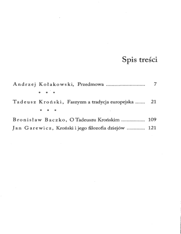 Spis tresci Andrzej Kolakowski, Przedmowa ............................ 7 * * * Tadeusz Kronski, Faszyzm a tradycja europejska ....... 21 * * * Bronislaw Baczko, o Tadeuszu Kronskim ................. 109 Jan Gar e wi c z, Kronski i jego filozofia dziej6w ............. 121