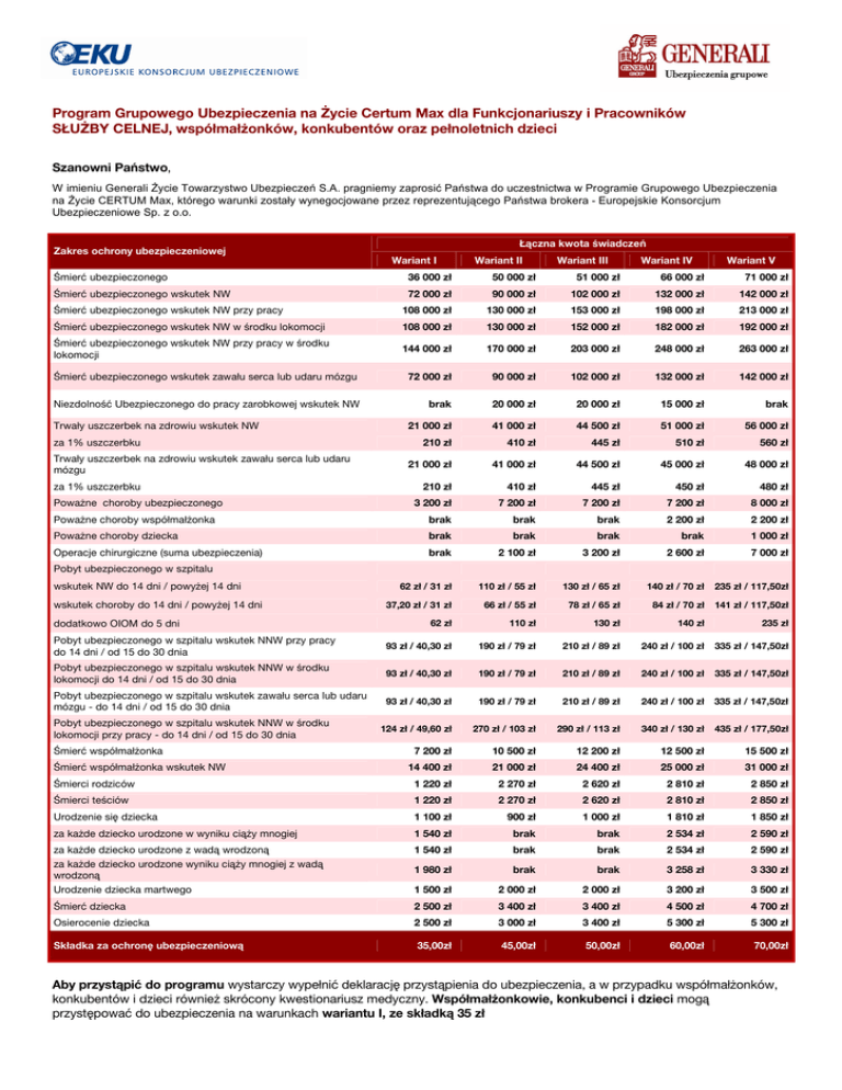 Program Grupowego Ubezpieczenia na Życie Certum Max dla Funkcjonariuszy i Pracowników SŁUŻBY CELNEJ, współmałżonków, konkubentów oraz pełnoletnich dzieci Szanowni Państwo, W imieniu Generali Życie Towarzystwo Ubezpieczeń S.A. pragniemy zaprosić Państwa do uczestnictwa w Programie Grupowego Ubezpieczenia na Życie CERTUM Max, którego warunki zostały wynegocjowane przez reprezentującego Państwa brokera - Europejskie Konsorcjum Ubezpieczeniowe Sp. z o.o. Zakres ochrony ubezpieczeniowej Łączna kwota świadczeń Wariant I Wariant II Wariant III Wariant IV Wariant V Śmierć ubezpieczonego 36 000 zł 50 000 zł 51 000 zł 66 000 zł 71 000 zł Śmierć ubezpieczonego wskutek NW 72 000 zł 90 000 zł 102 000 zł 132 000 zł 142 000 zł Śmierć ubezpieczonego wskutek NW przy pracy 108 000 zł 130 000 zł 153 000 zł 198 000 zł 213 000 zł Śmierć ubezpieczonego wskutek NW w środku lokomocji 108 000 zł 130 000 zł 152 000 zł 182 000 zł 192 000 zł Śmierć ubezpieczonego wskutek NW przy pracy w środku lokomocji 144 000 zł 170 000 zł 203 000 zł 248 000 zł 263 000 zł Śmierć ubezpieczonego wskutek zawału serca lub udaru mózgu 72 000 zł 90 000 zł 102 000 zł 132 000 zł 142 000 zł Niezdolność Ubezpieczonego do pracy zarobkowej wskutek NW brak 20 000 zł 20 000 zł 15 000 zł brak 21 000 zł 41 000 zł 44 500 zł 51 000 zł 56 000 zł 210 zł 410 zł 445 zł 510 zł 560 zł 21 000 zł 41 000 zł 44 500 zł 45 000 zł 48 000 zł Trwały uszczerbek na zdrowiu wskutek NW za 1% uszczerbku Trwały uszczerbek na zdrowiu wskutek zawału serca lub udaru mózgu za 1% uszczerbku 210 zł 410 zł 445 zł 450 zł 480 zł 3 200 zł 7 200 zł 7 200 zł 7 200 zł 8 000 zł Poważne choroby współmałżonka brak brak brak 2 200 zł 2 200 zł Poważne choroby dziecka brak brak brak brak 1 000 zł Operacje chirurgiczne (suma ubezpieczenia) brak 2 100 zł 3 200 zł 2 600 zł 7 000 zł 62 zł / 31 zł 110 zł / 55 zł 130 zł / 65 zł 140 zł / 70 zł 235 zł / 117,50zł 37,20 zł / 31 zł 66 zł / 55 zł 78 zł / 65 zł 84 zł / 70 zł 141 zł / 117,50zł 62 zł 110 zł 130 zł 140 zł 235 zł Pobyt ubezpieczonego w szpitalu wskutek NNW przy pracy do 14 dni / od 15 do 30 dnia 93 zł / 40,30 zł 190 zł / 79 zł 210 zł / 89 zł 240 zł / 100 zł 335 zł / 147,50zł Pobyt ubezpieczonego w szpitalu wskutek NNW w środku lokomocji do 14 dni / od 15 do 30 dnia 93 zł / 40,30 zł 190 zł / 79 zł 210 zł / 89 zł 240 zł / 100 zł 335 zł / 147,50zł Pobyt ubezpieczonego w szpitalu wskutek zawału serca lub udaru mózgu - do 14 dni / od 15 do 30 dnia 93 zł / 40,30 zł 190 zł / 79 zł 210 zł / 89 zł 240 zł / 100 zł 335 zł / 147,50zł 124 zł / 49,60 zł 270 zł / 103 zł 290 zł / 113 zł 340 zł / 130 zł 435 zł / 177,50zł Poważne choroby ubezpieczonego Pobyt ubezpieczonego w szpitalu wskutek NW do 14 dni / powyżej 14 dni wskutek choroby do 14 dni / powyżej 14 dni dodatkowo OIOM do 5 dni Pobyt ubezpieczonego w szpitalu wskutek NNW w środku lokomocji przy pracy - do 14 dni / od 15 do 30 dnia Śmierć współmałżonka 7 200 zł 10 500 zł 12 200 zł 12 500 zł 15 500 zł 14 400 zł 21 000 zł 24 400 zł 25 000 zł 31 000 zł Śmierci rodziców 1 220 zł 2 270 zł 2 620 zł 2 810 zł 2 850 zł Śmierci teściów 1 220 zł 2 270 zł 2 620 zł 2 810 zł 2 850 zł Urodzenie się dziecka 1 100 zł 900 zł 1 000 zł 1 810 zł 1 850 zł za każde dziecko urodzone w wyniku ciąży mnogiej 1 540 zł brak brak 2 534 zł 2 590 zł za każde dziecko urodzone z wadą wrodzoną za każde dziecko urodzone wyniku ciąży mnogiej z wadą wrodzoną Urodzenie dziecka martwego 1 540 zł brak brak 2 534 zł 2 590 zł 1 980 zł brak brak 3 258 zł 3 330 zł 1 500 zł 2 000 zł 2 000 zł 3 200 zł 3 500 zł Śmierć dziecka 2 500 zł 3 400 zł 3 400 zł 4 500 zł 4 700 zł Osierocenie dziecka 2 500 zł 3 000 zł 3 400 zł 5 300 zł 5 300 zł Składka za ochronę ubezpieczeniową 35,00zł 45,00zł 50,00zł 60,00zł 70,00zł Śmierć współmałżonka wskutek NW Aby przystąpić do programu wystarczy wypełnić deklarację przystąpienia do ubezpieczenia, a w przypadku współmałżonków, konkubentów i dzieci również skrócony kwestionariusz medyczny. Współmałżonkowie, konkubenci i dzieci mogą przystępować do ubezpieczenia na warunkach wariantu I, ze składką 35 zł Zalety Programu: ü indywidualna kontynuacja ubezpieczenia po odejściu z grupy; ü wypłata świadczenia w przypadku wystąpienia jednej z 15 wymienionych chorób: zawału serca, udaru mózgu, nowotworu złośliwego, niewydolności nerek, leczenia operacyjnego choroby wieńcowej (by-pass), przeszczepu dużych narządów (serca, płuca, nerki oraz wątroby), utraty wzroku, guzów mózgu, oparzeń, operacji aorty, angioplastyki naczyń wieńcowych, operacji zastawek serca, anemii plastycznej, choroby Creutzfelda – Jakoba, zakażenia wirusem HIV; ü rozszerzenie katalogu poważnych chorób ubezpieczonego o wystąpienie wirusowego zapalenia wątroby typu B lub C; ü katalog 440 operacji chirurgicznych; świadczenie w wysokości 100%, 80%, 60%, 40%, 20% sumy ubezpieczenia w zależności od kategorii operacji; ü dzienne świadczenie szpitalne za każdy dzień pobytu w szpitalu na terenie Polski i krajów Unii Europejskiej; ü świadczenie za pobyt w szpitalu spowodowany ciążą; ü dodatkowe świadczenie za każdy dzień pobytu na OIOM-ie; ü odpowiedzialność Towarzystwa w przypadku pobytu w szpitalu do 180 dni w ciągu roku; ü rozszerzenie odpowiedzialności o urodzenie dziecka w wyniku ciąży mnogiej oraz o urodzenie dziecka z wadą wrodzoną; ü ochrona ubezpieczeniowa przez 24 godziny na całym świecie; ü sprawna likwidacja szkód; ü możliwość zmiany wybranego wariantu ubezpieczenia w rocznicę polisy. Dodatkowe korzyści to: ü 10% zniżki przy zakupie Ubezpieczeń Mieszkań i Budynków Mieszkalnych „Lew Domownik” i Ubezpieczeń Budynków „Lew Budowniczy”; ü 5% zniżki przy zakupie ubezpieczeń kom