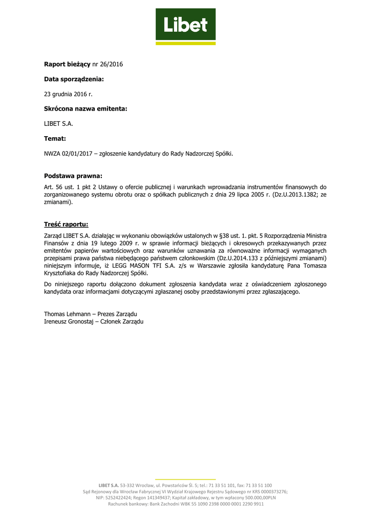 Raport bieżący nr 26/2016 Data sporządzenia: 23 grudnia 2016 r. Skrócona nazwa emitenta: LIBET S.A. Temat: NWZA 02/01/2017 – zgłoszenie kandydatury do Rady Nadzorczej Spółki. Podstawa prawna: Art. 56 ust. 1 pkt 2 Ustawy o ofercie publicznej i warunkach wprowadzania instrumentów finansowych do zorganizowanego systemu obrotu oraz o spółkach publicznych z dnia 29 lipca 2005 r. (Dz.U.2013.1382; ze zmianami). Treść raportu: Zarząd LIBET S.A. działając w wykonaniu obowiązków ustalonych w §38 ust. 1. pkt. 5 Rozporządzenia Ministra Finansów z dnia 19 lutego 2009 r. w sprawie informacji bieżących i okresowych przekazywanych przez emitentów papierów wartościowych oraz warunków uznawania za równoważne informacji wymaganych przepisami prawa państwa niebędącego państwem członkowskim (Dz.U.2014.133 z późniejszymi zmianami) niniejszym informuje, iż LEGG MASON TFI S.A. z/s w Warszawie zgłosiła kandydaturę Pana Tomasza Krysztofiaka do Rady Nadzorczej Spółki. Do niniejszego raportu dołączono dokument zgłoszenia kandydata wraz z oświadczeniem zgłoszonego kandydata oraz informacjami dotyczącymi zgłaszanej osoby przedstawionymi przez zgłaszającego. Thomas Lehmann – Prezes Zarządu Ireneusz Gronostaj – Członek Zarządu LIBET S.A. 53-332 Wrocław, ul. Powstańców Śl. 5; tel.: 71 33 51 101, fax: 71 33 51 100 Sąd Rejonowy dla Wrocław Fabrycznej VI Wydział Krajowego Rejestru Sądowego nr KRS 0000373276; NIP: 5252422424; Regon 141349437; Kapitał zakładowy, w tym wpłacony 500.000,00PLN Rachunek bankowy: Bank Zachodni WBK 55 1090 2398 0000 0001 2290 9911
