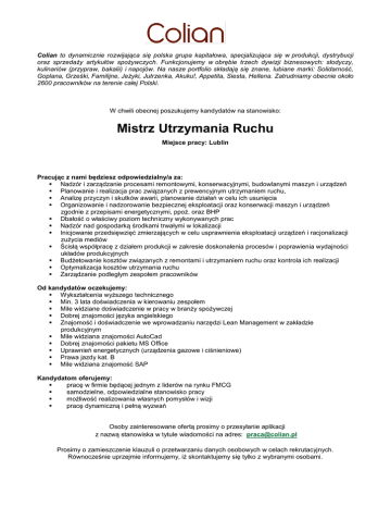 Colian to dynamicznie rozwijająca się polska grupa kapitałowa, specjalizująca się w produkcji, dystrybucji oraz sprzedaży artykułów spożywczych. Funkcjonujemy w obrębie trzech dywizji biznesowych: słodyczy, kulinariów (przypraw, bakalii) i napojów. Na nasze portfolio składają się znane, lubiane marki: Solidarność, Goplana, Grześki, Familijne, Jeżyki, Jutrzenka, Akuku!, Appetita, Siesta, Hellena. Zatrudniamy obecnie około 2600 pracowników na terenie całej Polski. W chwili obecnej poszukujemy kandydatów na stanowisko: Mistrz Utrzymania Ruchu Miejsce pracy: Lublin Pracując z nami będziesz odpowiedzialny/a za: Nadzór i zarządzanie procesami remontowymi, konserwacyjnymi, budowlanymi maszyn i urządzeń Planowanie i realizacja prac związanych z prewencyjnym utrzymaniem ruchu, Analizę przyczyn i skutków awarii, planowanie działań w celu ich usunięcia Organizowanie i nadzorowanie bezpiecznej eksploatacji oraz konserwacji maszyn i urządzeń zgodnie z przepisami energetycznymi, ppoż. oraz BHP Dbałość o właściwy poziom techniczny wykonywanych prac Nadzór nad gospodarką środkami trwałymi w lokalizacji Inicjowanie przedsięwzięć zmierzających w celu usprawnienia eksploatacji urządzeń i racjonalizacji zużycia mediów Ścisłą współpracę z działem produkcji w zakresie doskonalenia procesów i poprawienia wydajności układów produkcyjnych Budżetowanie kosztów związanych z remontami i utrzymaniem ruchu oraz kontrola ich realizacji Optymalizacja kosztów utrzymania ruchu Zarządzanie podległym zespołem pracowników Od kandydatów oczekujemy: Wykształcenia wyższego technicznego Min. 3 lata doświadczenia w kierowaniu zespołem Mile widziane doświadczenie w pracy w branży spożywczej Dobrej znajomości języka angielskiego Znajomość i doświadczenie we wprowadzaniu narzędzi Lean Management w zakładzie produkcyjnym Mile widziana znajomości AutoCad Dobrej znajomości pakietu MS Office Uprawnień energetycznych (urządzenia gazowe i ciśnieniowe) Prawa jazdy kat. B Mile widziana znajomość SAP Kandydatom oferujemy: pracę w firmie będącej jednym z liderów na rynku FMCG samodzielne, odpowiedzialne stanowisko pracy możliwość realizowania własnych pomysłów i wizji pracę dynamiczną i pełną wyzwań Osoby zainteresowane ofertą prosimy o przesyłanie aplikacji z nazwą stanowiska w tytule wiadomości na adres: [email protected] Prosimy o zamieszczenie klauzuli o przetwarzaniu danych osobowych w celach rekrutacyjnych. Równocześnie uprzejmie informujemy, iż skontaktujemy się tylko z wybranymi osobami.
