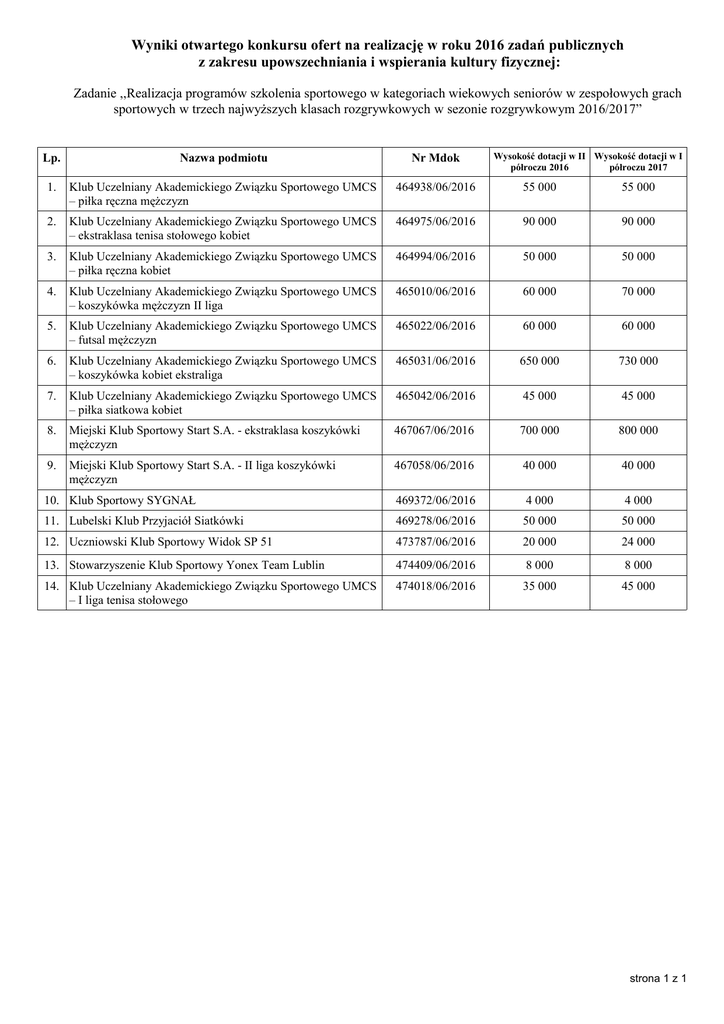 Wyniki otwartego konkursu ofert na realizację w roku 2016 zadań publicznych z zakresu upowszechniania i wspierania kultury fizycznej: Zadanie ,,Realizacja programów szkolenia sportowego w kategoriach wiekowych seniorów w zespołowych grach sportowych w trzech najwyższych klasach rozgrywkowych w sezonie rozgrywkowym 2016/2017” Wysokość dotacji w II Wysokość dotacji w I półroczu 2016 półroczu 2017 Lp. Nazwa podmiotu Nr Mdok 1. Klub Uczelniany Akademickiego Związku Sportowego UMCS – piłka ręczna mężczyzn 464938/06/2016 55 000 55 000 2. Klub Uczelniany Akademickiego Związku Sportowego UMCS – ekstraklasa tenisa stołowego kobiet 464975/06/2016 90 000 90 000 3. Klub Uczelniany Akademickiego Związku Sportowego UMCS – piłka ręczna kobiet 464994/06/2016 50 000 50 000 4. Klub Uczelniany Akademickiego Związku Sportowego UMCS – koszykówka mężczyzn II liga 465010/06/2016 60 000 70 000 5. Klub Uczelniany Akademickiego Związku Sportowego UMCS – futsal mężczyzn 465022/06/2016 60 000 60 000 6. Klub Uczelniany Akademickiego Związku Sportowego UMCS – koszykówka kobiet ekstraliga 465031/06/2016 650 000 730 000 7. Klub Uczelniany Akademickiego Związku Sportowego UMCS – piłka siatkowa kobiet 465042/06/2016 45 000 45 000 8. Miejski Klub Sportowy Start S.A. - ekstraklasa koszykówki mężczyzn 467067/06/2016 700 000 800 000 9. Miejski Klub Sportowy Start S.A. - II liga koszykówki mężczyzn 467058/06/2016 40 000 40 000 10. Klub Sportowy SYGNAŁ 469372/06/2016 4 000 4 000 11. Lubelski Klub Przyjaciół Siatkówki 469278/06/2016 50 000 50 000 12. Uczniowski Klub Sportowy Widok SP 51 473787/06/2016 20 000 24 000 13. Stowarzyszenie Klub Sportowy Yonex Team Lublin 474409/06/2016 8 000 8 000 14. Klub Uczelniany Akademickiego Związku Sportowego UMCS – I liga tenisa stołowego 474018/06/2016 35 000 45 000 strona 1 z 1