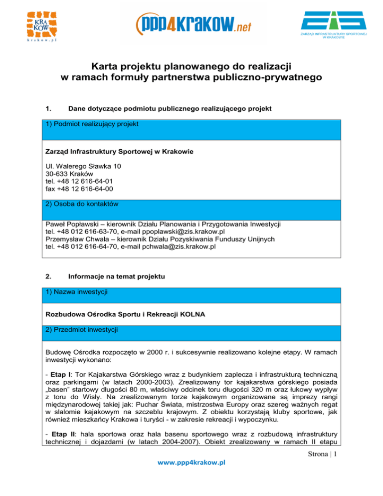 Karta projektu planowanego do realizacji w ramach formuły partnerstwa publiczno-prywatnego 1. Dane dotyczące podmiotu publicznego realizującego projekt 1) Podmiot realizujący projekt Zarząd Infrastruktury Sportowej w Krakowie Ul. Walerego Sławka 10 30-633 Kraków tel. +48 12 616-64-01 fax +48 12 616-64-00 2) Osoba do kontaktów Paweł Popławski – kierownik Działu Planowania i Przygotowania Inwestycji tel. +48 012 616-63-70, e-mail [email protected] Przemysław Chwała – kierownik Działu Pozyskiwania Funduszy Unijnych tel. +48 012 616-64-70, e-mail [email protected] 2. Informacje na temat projektu 1) Nazwa inwestycji Rozbudowa Ośrodka Sportu i Rekreacji KOLNA 2) Przedmiot inwestycji Budowę Ośrodka rozpoczęto w 2000 r. i sukcesywnie realizowano kolejne etapy. W ramach inwestycji wykonano: - Etap I: Tor Kajakarstwa Górskiego wraz z budynkiem zaplecza i infrastrukturą techniczną oraz parkingami (w latach 2000-2003). Zrealizowany tor kajakarstwa górskiego posiada „basen” startowy długości 80 m, właściwy odcinek toru długości 320 m oraz łukowy wypływ z toru do Wisły. Na zrealizowanym torze kajakowym organizowane są imprezy rangi międzynarodowej takiej jak: Puchar Świata, mistrzostwa Europy oraz szereg waŜnych regat w slalomie kajakowym na szczeblu krajowym. Z obiektu korzystają kluby sportowe, jak równieŜ mieszkańcy Krakowa i turyści - w zakresie rekreacji i wypoczynku. - Etap II: hala sportowa oraz hala basenu sportowego wraz z rozbudową infrastruktury technicznej i dojazdami (w latach 2004-2007). Obiekt zrealizowany w ramach II etapu Strona | 1 www.ppp4krakow.pl inwestycji zawiera trzy podstawowe bloki funkcjonalne: halę basenu wraz z zapleczem technicznym i trybunami dla widzów, halę sportową z trybunami oraz zespół szatniowy z salami do ćwiczeń i siłownią. - Etap III: budynek internatu sportowego (o funkcji hotelowej) w standardzie 4 gwiazdkowym z uzupełnieniem infrastruktury technicznej (w latach 2008-2010). Jest to budynek o trzech kondygnacjach naziemnych i jednej podziemnej. W piwnicach jest parking podziemny (40 miejsc postojowych) oraz zaplecze techniczne i socjalne. Parter ma charakter komunikacyjny - m.in. sale konferencyjne, szkoleniowe, kawiarnia, restauracja. Pozostałe kondygnacje (piętro i poddasze) to łącznie 52 pokoje hotelowe. Budynek zrealizowany w III etapie stanowi integralną część zabudowy ośrodka. Planowany do realizacji jest Etap IV rozbudowy kompleksu, obejmujący budowę infrastruktury umoŜliwiającej uprawianie i organizację rozgrywek tenisa ziemnego, która będzie obejmować: - lekką halę wraz z widownią i kortami tenisowymi, boksami do gry w squasha oraz niezbędnym zapleczem; - korty tenisowe na otwartym powietrzu; - zagospodarowanie otaczającego terenu. Planowana inwestycja ma spełniać wszelkie przepisy umoŜliwiające organizację międzynarodowych zawodów tenisa ziemnego. Hala wyposaŜona w trybuny posłuŜy za miejsce rozgrywek turniejów tenisowych. W okresie letnim hala byłaby częściowo otwierana, przez co turnieje tenisa ziemnego będą bardziej widowiskowe. W ramach przedsięwzięcia w formule PPP znajdą się następujące elementy: - budowa hali do gry w tenisa ziemnego i squasha oraz kortów zewnętrznych; - zarządzanie obiektami sportowymi powstałymi w ramach realizacji partnerstwa; - prowadzenie kampanii promocyjnych i marketingowych. W dalszej perspektywie strona publiczna przewiduje kolejny etap rozbudowy kompleksu OSIR KOLNA o dwa boiska treningowe do piłki noŜnej o wymiarach 105 x 68m, bieŜnię lekkoatletyczną oraz zadaszone trybuny dla około 100 widzów z budynkiem zaplecza socjalno-technicznego. 3) Miejsce realizacji inwestycji Gmina Miejska Kraków, Województwo Małopolskie, Miasto Kraków, Dzielnica VIII Dębniki, ul. Kolna 2. Usytuowany malowniczo na prawym brzegu Wisły ośrodek znajduje się na terenie BielańskoTynieckiego Parku Krajobrazowego w niewielkiej odległości od Klasztoru Kamedułów na Bielanach oraz Opactwa Benedyktynów w Tyńcu. Lokalizacja obiektu zapewnia bezpośredni dostęp do sieci dróg publicznych, niewielką odległość od Portu Lotniczego Kraków-Balice, sąsiedztwo autostrady A-4, łatwy dojazd z centrum miasta. Przystanek autobusowy w odległości ok. 1 km. Dogodny dojazd moŜliwy alternatywnymi środkami transportu, takimi jak krakowski tramwaj wodny i ścieŜka pieszo– rowerowa (rower, rolki itp.). 4) Etap realizacji projektu a) pomysł (nieokreślony termin realizacji); Strona | 2 www.ppp4krakow.pl b) planowana lub wybrana firma doradcza; c) analizy przedrealizacyjne; d) wszczęte postępowanie; e) wybrany partner prywatny; f) budowa obiektu; g) eksploatacja obiektu. 5) Planowany podział zadań pomiędzy stroną publiczną a partnerem prywatnym Obowiązki partnera prywatnego: a) wniesienie wiedzy i doświadczenia (know-how) w zakresie zarządzania obiektami sportowymi i ich zapleczem; b) wkład finansowy w budowę hali sportowej do tenisa ziemnego i squasha wraz z kortami i zapleczem; c) przygotowanie dokumentacji projektowej; d) zarządzanie obiektami powstałymi w ramach realizacji przedsięwzięcia; e) promocja i marketing obiektu. Obowiązki Gminy Miejskiej Kraków: a) przekazanie gruntów pod inwestycję; b) wsparcie podczas opracowywania planów budowlanych i uzyskiwania stosownych pozwoleń; c) współpraca przy promocji projektu oraz organizacji imprez mających na celu animację kompleksu; d) wykup brakującej części terenu pod inwestycję; e) ewentualny udział w finansowaniu przedsięwzięcia w zakresie uzgodnionym w toku dialogu/ negocjacji. 6) Preferowana forma współpracy pomiędzy stroną publiczną i prywatną Inwestycja planowana jest do realizacji w formule Partnerstwa Publiczno-Prywatnego lub Koncesji. Preferowany model współpracy w ramach PPP to DBO (buduj, zarządzaj, przekaŜ) lub BFOMT (buduj, finansuj, zarządzaj, utrzymuj, przekaŜ). 3. Finansowanie i szacunkowa wartość inwestycji 1) Szacunk