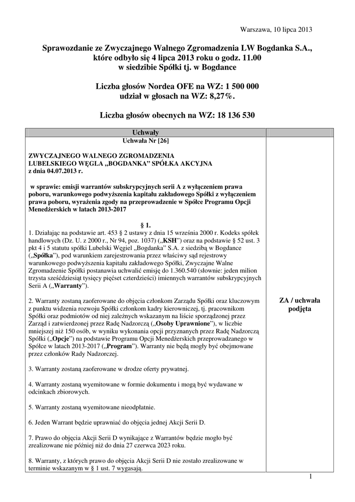 Warszawa, 10 lipca 2013 Sprawozdanie ze Zwyczajnego Walnego Zgromadzenia LW Bogdanka S.A., które odbyło się 4 lipca 2013 roku o godz. 11.00 w siedzibie Spółki tj. w Bogdance Liczba głosów Nordea OFE na WZ: 1 500 000 udział w głosach na WZ: 8,27%. Liczba głosów obecnych na WZ: 18 136 530 Uchwały Uchwała Nr [26] ZWYCZAJNEGO WALNEGO ZGROMADZENIA LUBELSKIEGO WĘGLA „BOGDANKA” SPÓŁKA AKCYJNA z dnia 04.07.2013 r. w sprawie: emisji warrantów subskrypcyjnych serii A z wyłączeniem prawa poboru, warunkowego podwyższenia kapitału zakładowego Spółki z wyłączeniem prawa poboru, wyrażenia zgody na przeprowadzenie w Spółce Programu Opcji Menedżerskich w latach 2013-2017 § 1. 1. Działając na podstawie art. 453 § 2 ustawy z dnia 15 września 2000 r. Kodeks spółek handlowych (Dz. U. z 2000 r., Nr 94, poz. 1037) („KSH”) oraz na podstawie § 52 ust. 3 pkt 4 i 5 statutu spółki Lubelski Węgiel „Bogdanka” S.A. z siedzibą w Bogdance („Spółka”), pod warunkiem zarejestrowania przez właściwy sąd rejestrowy warunkowego podwyższenia kapitału zakładowego Spółki, Zwyczajne Walne Zgromadzenie Spółki postanawia uchwalić emisję do 1.360.540 (słownie: jeden milion trzysta sześćdziesiąt tysięcy pięćset czterdzieści) imiennych warrantów subskrypcyjnych Serii A („Warranty”). 2. Warranty zostaną zaoferowane do objęcia członkom Zarządu Spółki oraz kluczowym z punktu widzenia rozwoju Spółki członkom kadry kierowniczej, tj. pracownikom Spółki oraz podmiotów od niej zależnych wskazanym na liście sporządzonej przez Zarząd i zatwierdzonej przez Radę Nadzorczą („Osoby Uprawnione”), w liczbie mniejszej niż 150 osób, w wyniku wykonania opcji przyznanych przez Radę Nadzorczą Spółki („Opcje”) na podstawie Programu Opcji Menedżerskich przeprowadzanego w Spółce w latach 2013-2017 („Program”). Warranty nie będą mogły być obejmowane przez członków Rady Nadzorczej. ZA / uchwała podjęta 3. Warranty zostaną zaoferowane w drodze oferty prywatnej. 4. Warranty zostaną wyemitowane w formie dokumentu i mogą być wydawane w odcinkach zbiorowych. 5. Warranty zostaną wyemitowane nieodpłatnie. 6. Jeden Warrant będzie uprawniać do objęcia jednej Akcji Serii D. 7. Prawo do objęcia Akcji Serii D wynikające z Warrantów będzie mogło być zrealizowane nie później niż do dnia 27 czerwca 2023 roku. 8. Warranty, z których prawo do objęcia Akcji Serii D nie zostało zrealizowane w terminie wskazanym w § 1 ust. 7 wygasają. 1 9. Objęcie Warrantów przez Osoby Uprawnione może nastąpić na warunkach określonych w Programie i tylko w celu wykonania praw z Opcji. 10. Warranty są niezbywalne. 11. Warranty podlegają dziedziczeniu. 12. Zwyczajne Walne Zgromadzenie upoważnia Zarząd do: (a) podjęcia wszelkich działań związanych z emisją i przydziałem Warrantów, w tym określenia treści dokumentu Warrantu oraz dokumentu odcinka zbiorowego Warrantów, a także (b) podejmowania wszelkich działań związanych z wydaniem Warrantów na rzecz Osób Uprawnionych na zasadach określonych w niniejszej Uchwale oraz w Programie, z wyjątkiem czynności zastrzeżonych w niniejszej Uchwale dla Rady Nadzorczej, w szczególności do określenia terminów wydawania Warrantów, a także do zawarcia umowy z wybraną instytucją finansową, na podstawie której ta instytucja będzie wykonywać wybrane czynności związane z przechowywaniem Warrantów. § 2. Zwyczajne Walne Zgromadzenie Spółki doceniając znaczenie motywacyjne możliwości objęcia akcji Spółki przez Osoby Uprawnione wyraża zgodę na przeprowadzenie w Spółce Programu oraz upoważnia Radę Nadzorczą do określenia szczegółowych warunków Programu, z zachowaniem postanowień poniższych: 1. Spółka może przyznać do 1.360.540 (słownie: jeden milion trzysta sześćdziesiąt tysięcy pięćset czterdzieści) Opcji uprawniających Osoby Uprawnione do nieodpłatnego objęcia Warrantów, w podziale na 5 lat. 2. Liczba Opcji przysługujących wszystkim Osobom Uprawnionym za każdy rok obowiązywania Programu będzie nie większa niż 272.108 (słownie: dwieście siedemdziesiąt dwa tysiące sto osiem). 3. Każda przyznana Opcja będzie uprawniać do objęcia Warrantów w liczbie równej ilorazowi wartości wewnętrznej Opcji oraz ceny rynkowej akcji Spółki ustalonych na dzień wykonania Opcji. 4. Wartość wewnętrzna jednej Opcji będzie równa różnicy między ceną rynkową akcji Spółki z dnia wykonania Opcji i ceną wykonania Opcji. 5. Cena rynkowa akcji Spółki będzie równa kursowi zamknięcia jej akcji z dnia wykonania Opcji lub następnego dnia notowań akcji Spółki następującego bezpośrednio po dniu wykonania Opcji, jeżeli w dacie wykonania Opcji nie odbywa się sesja giełdowa na Giełdzie Papierów Wartościowych w Warszawie S.A. 6. Cena wykonania każdej Opcji będzie równa cenie bazowej pomniejszonej o wypłacaną przez Spółkę skumulowaną dywidendę: (i) do dnia wykonania Opcji, w przeliczeniu na jedną akcję, począwszy od dywidendy za 2012 rok – w odniesieniu do Opcji przyznanych w dacie przyjęcia przez Radę Nadzorczą szczegółowych warunków Programu, (ii) od daty przyznania Opcji do dnia wykonania Opcji, w przeliczeniu na jedną akcję – w pozostałych przypadkach. Cena bazowa w dniu przyznania Opcji będzie równa średniej z notowań akcji Spółki z okresu 3 miesięcy poprzedzających: (i) dzień podjęcia przez Walne Zgromadzenie niniejszej Uchwały – w odniesieniu do Opcji przyznanych w dacie przyjęcia przez Radę Nadzorczą szczegółowych warunków Programu oraz (ii) datę przyznania Opcji – w pozostałych przypadkach. W każdym kolejnym miesiącu kalendarzowym cena bazowa będzie waloryzowana o 0,35%. Średnia z notowań akcji Spółki wyliczona zostanie w oparciu o kursy zamknięcia notowań akcji 2 Spółki. 7. Opcje będą przyznawane przez Radę Nadzorczą, przy czym w odniesieniu do Osób Uprawnion