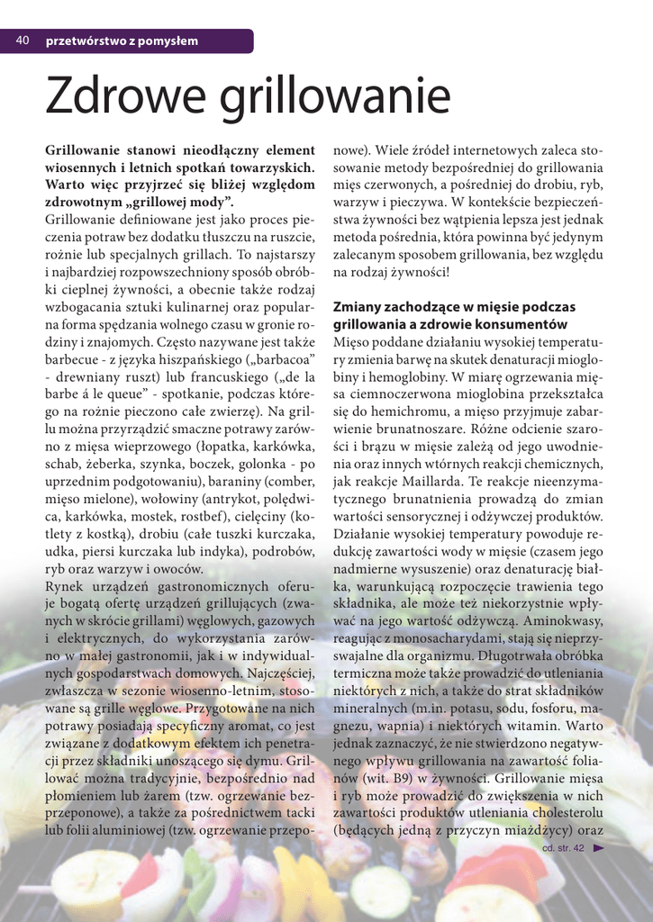 40 przetwórstwo z pomysłem Zdrowe grillowanie Grillowanie stanowi nieodłączny element wiosennych i letnich spotkań towarzyskich. Warto więc przyjrzeć się bliżej względom zdrowotnym „grillowej mody”. Grillowanie definiowane jest jako proces pieczenia potraw bez dodatku tłuszczu na ruszcie, rożnie lub specjalnych grillach. To najstarszy i najbardziej rozpowszechniony sposób obróbki cieplnej żywności, a obecnie także rodzaj wzbogacania sztuki kulinarnej oraz popularna forma spędzania wolnego czasu w gronie rodziny i znajomych. Często nazywane jest także barbecue - z języka hiszpańskiego („barbacoa” - drewniany ruszt) lub francuskiego („de la barbe á le queue” - spotkanie, podczas którego na rożnie pieczono całe zwierzę). Na grillu można przyrządzić smaczne potrawy zarówno z mięsa wieprzowego (łopatka, karkówka, schab, żeberka, szynka, boczek, golonka - po uprzednim podgotowaniu), baraniny (comber, mięso mielone), wołowiny (antrykot, polędwica, karkówka, mostek, rostbef), cielęciny (kotlety z kostką), drobiu (całe tuszki kurczaka, udka, piersi kurczaka lub indyka), podrobów, ryb oraz warzyw i owoców. Rynek urządzeń gastronomicznych oferuje bogatą ofertę urządzeń grillujących (zwanych w skrócie grillami) węglowych, gazowych i elektrycznych, do wykorzystania zarówno w małej gastronomii, jak i w indywidualnych gospodarstwach domowych. Najczęściej, zwłaszcza w sezonie wiosenno-letnim, stosowane są grille węglowe. Przygotowane na nich potrawy posiadają specyficzny aromat, co jest związane z dodatkowym efektem ich penetracji przez składniki unoszącego się dymu. Grillować można tradycyjnie, bezpośrednio nad płomieniem lub żarem (tzw. ogrzewanie bezprzeponowe), a także za pośrednictwem tacki lub folii aluminiowej (tzw. ogrzewanie przepo- nowe). Wiele źródeł internetowych zaleca stosowanie metody bezpośredniej do grillowania mięs czerwonych, a pośredniej do drobiu, ryb, warzyw i pieczywa. W kontekście bezpieczeństwa żywności bez wątpienia lepsza jest jednak metoda pośrednia, która powinna być jedynym zalecanym sposobem grillowania, bez względu na rodzaj żywności! Zmiany zachodzące w mięsie podczas grillowania a zdrowie konsumentów Mięso poddane działaniu wysokiej temperatury zmienia barwę na skutek denaturacji mioglobiny i hemoglobiny. W miarę ogrzewania mięsa ciemnoczerwona mioglobina przekształca się do hemichromu, a mięso przyjmuje zabarwienie brunatnoszare. Różne odcienie szarości i brązu w mięsie zależą od jego uwodnienia oraz innych wtórnych reakcji chemicznych, jak reakcje Maillarda. Te reakcje nieenzymatycznego brunatnienia prowadzą do zmian wartości sensorycznej i odżywczej produktów. Działanie wysokiej temperatury powoduje redukcję zawartości wody w mięsie (czasem jego nadmierne wysuszenie) oraz denaturację białka, warunkującą rozpoczęcie trawienia tego składnika, ale może też niekorzystnie wpływać na jego wartość odżywczą. Aminokwasy, reagując z monosacharydami, stają się nieprzyswajalne dla organizmu. Długotrwała obróbka termiczna może także prowadzić do utleniania niektórych z nich, a także do strat składników mineralnych (m.in. potasu, sodu, fosforu, magnezu, wapnia) i niektórych witamin. Warto jednak zaznaczyć, że nie stwierdzono negatywnego wpływu grillowania na zawartość folianów (wit. B9) w żywności. Grillowanie mięsa i ryb może prowadzić do zwiększenia w nich zawartości produktów utleniania cholesterolu (będących jedną z przyczyn miażdżycy) oraz cd. str. 42 42 przetwórstwo z pomysłem znacznych strat masy (zależnie od produktu i temperatury nawet do 45%). W trakcie grillowania mięsa i produktów mięsnych w wyniku wytopu zmniejsza się pierwotna zawartość tłuszczu, w surowcu i w gotowych potrawach może być o ok. 5 - 20% mniej tego składnika. Powszechnie uważa się więc, że potrawy grillowane są dietetyczne. Niestety, mimo utraty tłuszczu podczas obróbki cieplnej, potrawy mięsne z grilla są najczęściej wysokokaloryczne, ponieważ do grillowania wybiera się zazwyczaj tłuste elementy mięsa wieprzowego (jak karkówka, boczek, żeberka) oraz kiełbasy, a dodatkowo dla wielu osób niezbędnym dodatkiem do grillowanych potraw są majonez i sosy przyrządzane na jego bazie. Potrawy grillowane kuszą niepowtarzalnym smakiem i aromatem, ale należy pamiętać, że ten rodzaj obróbki termicznej, zwłaszcza nieumiejętnie przeprowadzony, może prowadzić do powstania związków o charakterze kancerogennym, mutagennym czy genotoksycznym, do których zalicza się: heterocykliczne aminy aromatyczne (HCA), wielopierścieniowe węglowodory aromatyczne (WWA), nadtlenki lipidowe i wolne rodniki. W odniesieniu do mięsnych potraw grillowanych metodą bezpośrednią największe znaczenie mają HCA i WWA. Mutagenne HCA powstają w mięsie pod wpływem temperatury powyżej 125˚C, w której aminokwasy budujące białka łatwiej reagują z występującymi w mięśniach kreatyną i sacharydami. Związki te powstają głównie na powierzchni mięsa pieczonego nad otwartym ogniem, a im wyższa temp. i dłuższy czas obróbki termicznej, tym ich stężenie jest wyższe. Niebezpieczne WWA są ubocznymi produktami reakcji zachodzących podczas procesów niepełnego spalania materii organicznej w szerokim zakresie temp. (250 - 920˚C). Podczas grillowania głównym ich źródłem jest wytapiany z mięsa tłuszcz skapujący w żarzące się węgle, w mniejszym stopniu piroliza zachodząca na powierzchni mięsa w trakcie zbyt długiego lub intensywnego ogrzewania. W 2008 r. EFSA zaproponowała, aby wskaźnik obecności kancerogennych WWA w żywności stanowiła suma zawartości 4 związków: benzo(a)antracenu, benzo(b)fluorentenu, benzo(a)pirenu B(a)P i chryzenu (tzw. 4 WWA). Potrawy grillowane mogą zawierać skrajnie wysokie stężenia WWA. Jednak jeżeli będą przez nas spożywane jedynie sezonowo, nie będą stanow
