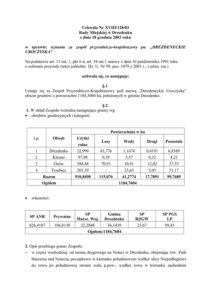 Uchwała Nr XVIII/128/03 Rady Miejskiej w Drezdenku z dnia 18 grudnia 2003 roku w sprawie: uznania za zespół przyrodniczo-krajobrazowy pn. „DREZDENECKIE UROCZYSKA” Na podstawie art. 13 ust. 1, pkt 6 d, art. 34 ust.1 ustawy z dnia 16 października 1991 roku o ochronie przyrody (tekst jednolity Dz. U. Nr 99, poz. 1079 z 2001 r., z późn. zm.) uchwala się, co następuje: §.1. Uznaje się za Zespół Przyrodniczo-Krajobrazowy pod nazwą „Drezdeneckie Uroczyska” obszar gruntów o powierzchni 1184,3004 ha, położonych w gminie Drezdenko. §.2. 1. W skład Zespołu wchodzą następujące grunty wg: obrębów geodezyjnych i kategorii: Powierzchnia w ha Lp. Obręb 1 2 3 4 Lasy Wody Drogi Pozostałe Drezdenko Klesno Użytki rolne 22,999 97,98 43,776 0,39 1,1674 5,57 0,4191 0,32 6,8389 4,23 Osów Trzebicz 588,48 201,39 70,91 – 10,91 23,63 12,02 5,03 37,53 51,17 910,8490 115,076 41,2774 17,7891 99,7689 Razem Ogółem 1184,7604 własności: SP ANR Prywatne 826,4187 186,8130 SP Gmina Marsz. Woj. Drezdenko 22,2848 36,1439 Ogółem:1184,7604 SP RZGW 23,67 SP PGS LP 89,43 2. Opis przebiegu granic Zespołu: – w części wschodniej: od mostu drogowego na Noteci w Drezdenku, obejmując tzw. Park Harcerza nad Notecią, początkowo w kierunku południowym wzdłuż ulicy Niepodległości do rowu po południowej stronie wału p.pow.; wzdłuż rowu w kierunku zachodnim do granicy z terenami użytkowanymi przez zakład przemysłowy (Polkast); stąd w kierunku południowym wzdłuż zachodniej granicy zakładu Polkast i terenów Gminnej Spóldzielni do cieku stanowiącego dopływ Starej Noteci; wzdłuż tego cieku w kierunku zachodnim do brzegów Starej Noteci; wzdłuż zachodniego brzegu Starej Noteci w kierunku południowym; ok. 100 m przed mostem na wysokości Oczyszczalni Ścieków w kierunku zachodnim wzdłuż północnej, a następnie w kierunku południowym wzdłuż zachodniej granicy ogródków działkowych i planowanego terenu osiedla do skraju Lasu Miejskiego; wzdłuż granicy polno-leśnej Lasu Miejskiego w kierunku wschodnim do ulicy Mickiewicza; brzegiem Lasu Miejskiego do terenu OSiR-u; w kierunku zachodnim północną granicą terenu OSiR-u i następnie wzdłuż północnej i zachodniej granicy prywatnej posesji p. L. Jurkiewicza (basenu), do południowej granicy terenu OSiR-u (boiska treningowego); okrążając boisko treningowe najpierw w kierunku zachodnim, póxniej południowym i następnie wschodnim do drogi stanowiącej przedłużenie ulicy Milickiej; wzdłuż tej drogi w kierunku wschodnim do terenu dawnego Zespołu Szkół im. S. Żeromskiego; wzdłuż zachodniej granicy terenu ZS im. S. Żeromskiego do drogi stanowiącej przedłużenie ul. 11 Listopada; wzdłuż tej drogi w kierunku wschodnim do skraju lasu; – w części południowej: granicą polno-leśną w kier. południowym, następnie zachodnim do punktu położonego w odl. ok. 200 m. w kier. pn od koty wysokościowej 26,9 m. (do punktu granicy polno-leśnej leżącego na wysokości zmiany kierunku rzeki Rudawy z północno-zachodniego na południowo-zachodni); granicą działek w kierunku południowym do rzeki Rudawy do punktu, w którym rzeka zmienia swój kierunek z północno-zachodniego na południowo-zachodni; wzdłuż północnych brzegów Rudawy w kierunku zachodnim do ujścia Rudawy do Noteci; wzdłuż południowego brzegu Noteci do mostu drogowego we wsi Trzebicz; – w części zachodniej: od mostu w Trzebiczu w kierunku północnym wzdłuż wschodniego skraju drogi Trzebicz-Przynotecko; zachodnią (w kierunku północnym) a potem północną granicą (w kierunku wschodnim) działek 125, 124 i 123 do wału przeciwpowodziowego; wschodnim brzegiem wału w kierunku północnym do punktu odejścia w kierunku wschodnim granicy między gminami Drezdenko i Stare Kurowo; granicą międzygminną w kierunku wschodnim do przekroczenia przez nią koryta Noteci; dalej w kierunku północnym granicą międzygminną: początkowo wschodnim brzegiem Noteci, następnie przez tereny łąkowe ponownie do brzegów Noteci; – w części północnej: wzdłuż południowej linii brzegowej Noteci do mostu w Drezdenku. §.3. Celem ochrony zespołu przyrodniczo-krajobrazowego „Drezdeneckie Uroczyska” jest zachowanie cennych fragmentów krajobrazu naturalnego i kulturowego na terenach bezpośrednio przylegających do zachodnich granic wraz z florą i fauną – dla potrzeb edukacyjnych, naukowych, turystycznych i wypoczynkowych. §.4. Na terenie zespołu przyrodniczo-krajobrazowego „Drezdeneckie Uroczyska” zabrania się: 1) wysypywanie, zakopywania i wylewania odpadów lub innych nieczystości, 2) zaśmiecania obiektu i terenu wokół niego, §.5. Wykonanie uchwały powierza się Burmistrzowi Miasta i Gminy w Drezdenku. §.6. Uchwała wchodzi w życie z dniem podjęcia. Przewodniczący Rady Miejskiej /-/ Jerzy Skrzypczyński Uzasadnienie: Powołanie Zespołu Przyrodniczo-Krajobrazowego „Drezdeneckie Uroczyska” pozwoli objąć ochroną w bezpośrednim sąsiedztwie miasta Drezdenka wartościowe walory przyrodnicze wynikające z położenia w jednym z najważniejszych korytarzy ekologicznych o znaczeniu ponadlokalnym i ponadregionalnym włączonym do „sieci obiektów” Natura 2000. Są to przede wszystkim bogate w gatunki, zbliżone do naturalnych zbiorowiska łąkowe, łęgowe, zaroślowe, bagienne i inne. Stanowią one miejsce bytowania wielu interesujących i rzadkich ptaków lęgowych i migrujących. W granicach Zespołu znajduje się stanowisko archeologiczne, którego rozpoznanie powinno wnieść nowe dane dotyczące rozwoju kultury materialnej na tym terenie. Na terenie Zespołu, głównie we współpracy z Nadleśnictwem Karwin, będą wyznaczone i urządzone ścieżki edukacyjne (ścieżka ogólnoprzyrodnicza i ścieżka gospodarki leśnej) oraz ścieżka zdrowia. Poprzez właściwe, oparte na wynikach inwentaryzacji przyrodniczej, wprowadzenie niekolidującej z podstawowymi zasadami ochrony przyrody ożywionej 