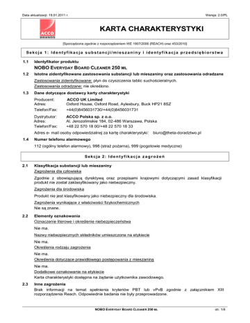 Data aktualizacji: 19.01.2011 r. Wersja: 2.0/PL KARTA CHARAKTERYSTYKI [Sporządzona zgodnie z rozporządzeniem WE 1907/2006 (REACH) oraz 453/2010] Sekcja 1: Identyfikacja substancji/mieszaniny i identyfikacja przedsiębiorstwa 1.1 Identyfikator produktu NOBO EVERYDAY BOARD CLEANER 250 ML 1.2 Istotne zidentyfikowane zastosowania substancji lub mieszaniny oraz zastosowania odradzane Zastosowania zidentyfikowane: płyn do czyszczenia tablic suchościeralnych. Zastosowania odradzane: nie określono. 1.3 Dane dotyczące dostawcy karty charakterystyki Producent: Adres: Telefon/Fax: ACCO UK Limited Oxford House, Oxford Road, Aylesbury, Buck HP21 8SZ +44(0)8456031730/+44(0)8456031731 Dystrybutor: Adres: Telefon/Fax: ACCO Polska sp. z o.o. Al. Jerozolimskie 184, 02-486 Warszawa, Polska +48 22 570 18 00/+48 22 570 18 33 Adres e- mail osoby odpowiedzialnej za kartę charakterystyki: 1.4 [email protected] Numer telefonu alarmowego 112 (ogólny telefon alarmowy), 998 (straż pożarna), 999 (pogotowie medyczne) S ek cj a 2 : I d e n t y f i k a c j a z a g r o ż e ń 2.1 Klasyfikacja substancji lub mieszaniny Zagrożenia dla człowieka Zgodnie z obowiązującą dyrektywą oraz przepisami krajowymi dotyczącymi zasad klasyfikacji produkt nie został zaklasyfikowany jako niebezpieczny. Zagrożenia dla środowiska Produkt nie jest klasyfikowany jako niebezpieczny dla środowiska. Zagrożenia wynikające z właściwości fizykochemicznych Nie są znane. 2.2 Elementy oznakowania Oznaczenie literowe i określenie niebezpieczeństwa Nie ma. Nazwy niebezpiecznych składników umieszczone na etykiecie Nie ma. Określenia rodzaju zagrożenia Nie ma. Określenia dotyczące prawidłowego postępowania z mieszaniną Nie ma. Dodatkowe oznakowanie na etykiecie Karta charakterystyki dostępna na żądanie użytkownika zawodowego. 2.3 Inne zagrożenia Brak informacji na temat spełnienia kryteriów PBT lub vPvB zgodnie z załącznikiem XIII rozporządzenia Reach. Odpowiednie badania nie były przeprowadzone. NOBO EVERYDAY BOARD CLEANER 250 ML str. 1/8 Data aktualizacji: 19.01.2011 r. Wersja: 2.0/PL KARTA CHARAKTERYSTYKI Sekcja 3: 3.1 Substancje Nie dotyczy. 3.2 Mieszaniny propan-2-ol Zakres stężeń: Numer CAS: Numer WE: Numer rejestracji właściwej: Skład/informacja o składnikach 5-10% 67-63-0 200-661-7 substancja podlega przepisom okresu przejściowego Klasyfikacja wg 67/548/EWG: F R: 11 Xi R: 36, R: 67 Klasyfikacja wg 1272/2008/WE: Flam. Liq. 2 H225, Eye Irrit. 2 H319, STOT SE 3 H336 Dla substancji określono lokalne wartości najwyższych dopuszczanych stężeń w środowisku pracy. Pełen tekst zwrotów R i H przytoczony został w 16 sekcji karty. Sekcja 4: Środki pierwszej pomocy 4.1 Opis środków pierwszej pomocy W kontakcie ze skórą: zdjąć zanieczyszczoną odzież. Narażone partie skóry płukać dokładnie bieżącą wodą. Skonsultować się z lekarzem w razie wystąpienia podrażnienia. W kontakcie z oczami: zanieczyszczone oczy przepłukiwać dokładnie wodą przez 10-15 min. Unikać silnego strumienia wody - ryzyko uszkodzenia rogówki. Chronić niepodrażnione oko, wyjąć szkła kontaktowe. Skonsultować się z lekarzem w razie wystąpienia podrażnienia. W przypadku spożycia: nie wywoływać wymiotów! W przypadku połknięcia cieczy przepłukać usta wodą i popić dużą ilością wody. Nie podawać nic do ust osobie nieprzytomnej. W przypadku wystąpienia niepokojących objawów skonsultować się z lekarzem. Po narażeniu drogą oddechową: wyprowadzić poszkodowanego na świeże powietrze, zapewnić ciepło i spokój. W razie złego samopoczucia skonsultować się z lekarzem. 4.2 Najważniejsze ostre i opóźnione objawy oraz skutki narażenia W kontakcie ze skórą – może wywołać podrażnienie u szczególnie wrażliwych osób, długotrwały kontakt ze skórą może prowadzić do wysuszenia i zapalenia skóry. W kontakcie z oczami - może wywołać podrażnienie u szczególnie wrażliwych osób. Po inhalacji – może powodować podrażnienie układu oddechowego, odurzenie narkotyczne i łagodne podrażnienie błon śluzowych. Po połknięciu – może powodować podrażnienie błon śluzowych, ból brzucha, nudności i wymioty. Wskazania dotyczące wszelkiej natychmiastowej pomocy lekarskiej i szczególnego postępowania z poszkodowanym 4.3 Decyzję o sposobie postępowania ratunkowego podejmuje lekarz po dokładnej ocenie stanu poszkodowanego. Sekcja 5: 5.1 5.2 Postępowanie w przypadku pożaru Środki gaśnicze Odpowiednie środki gaśnicze: CO2, rozpylony strumień wody, piana odporna na działanie alkoholu, proszki gaśnicze. Środek gaśniczy dostosować do materiałów znajdujących się w pobliżu. Niewłaściwe środki gaśnicze: zwarty strumień wody – ryzyko rozprzestrzenienia pożaru. Szczególne zagrożenia związane z substancją lub mieszaniną Podczas spalania może uwalniać się toksyczne gazy zawierające tlenki węgla. Unikać wdychania produktów spalania, mogą stwarzać zagrożenie dla zdrowia. NOBO EVERYDAY BOARD CLEANER 250 ML str. 2/8 Data aktualizacji: 19.01.2011 r. Wersja: 2.0/PL KARTA CHARAKTERYSTYKI 5.3 Informacje dla straży pożarnej Stosować środki ochrony ogólnej typowe w przypadku pożaru. Nie należy przebywać w zagrożonej ogniem strefie bez odpowiedniego ubrania odpornego na chemikalia i aparatu do oddychania z niezależnym obiegiem powietrza. Zagrożone ogniem pojemniki polewać rozpylonym strumieniem wody. Należy nie dopuścić do przedostania się wody gaśniczej do kanalizacji, wód powierzchniowych i gruntowych. S ek cj a 6: P o s t ę p o w a n i e w p r z y p a d k u n i e z a m i e r z o n e g o u w o l n i e n i a d o ś r o d o w i s k a 6.1 Indywidualne środki ostrożności, wyposażenie ochronne i procedury w sytuacjach awaryjnych Ograniczyć dostęp osób postronnych do obszaru awarii do czasu zakończenia odpowiednich operacji oczyszczania. W przypadku dużych wycieków odizolować zagrożony obszar. Stosować środki oc