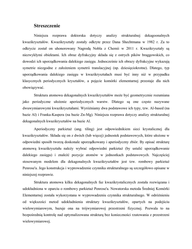 Streszczenie Niniejsza rozprawa doktorska dotyczy analizy strukturalnej dekagoonalnych kwazikryształów. Kwazikryształy zostały odkryte przez Dana Shechtmana w 1982 r. Za to odkrycie został on uhonorowany Nagrodą Nobla z Chemii w 2011 r. Kwazikryształy są niezwykłymi obiektami. Ich obraz dyfrakcyjny składa się z ostrych pików braggowskich, co dowodzi ich uporządkowania dalekiego zasięgu. Jednocześnie ich obrazy dyfrakcyjne wykazują symetrie niezgodne z założeniem symetrii translacyjnej (np. dziesięciokrotne). Dlatego, typ uporządkowania dalekiego zasięgu w kwazikryształach musi być inny niż w przypadku klasycznych periodycznych kryształów, a pojęcie komórki elementarnej przestaje dla nich obowiązywać. Struktura atomowa dekagonalnych kwazikryształów może być geometrycznie rozumiana jako periodyczne ułożenie aperiodycznych warstw. Dlatego są one często nazywane dwuwymiarowymi kwazikryształami. Wyróżniamy dwa podstawowe ich typy, tzw. Al-based (na bazie Al) i Franka-Kaspera (na bazie Zn-Mg). Niniejsza rozprawa dotyczy analizy strukturalnej dekagonalnych kwazikryształów na bazie Al. Aperiodyczny parkietaż (ang. tiling) jest odpowiednikiem sieci krystalicznej dla kwazikryształów. Składa się on z dwóch (lub więcej) jednostek podstawowych, które ułożone w odpowiedni sposób tworzą doskonale uporządkowany i aperiodyczny zbiór. By opisać strukturę atomową kwazikryształu należy wybrać odpowiedni parkietaż (by ustalić uporządkowanie dalekiego zasięgu) i znaleźć pozycje atomów w jednostkach podstawowych. Najczęściej stosowanym modelem dla dekagonalnych kwazikryształów jest tzw. rombowy parkietaż Penrose'a. Jego konstrukcja i wyprowadzenie czynnika strukturalnego są szczegółowo opisane w niniejszej rozprawie. Struktura atomowa kilku dekagonalnych faz kwazikrystalicznych została rozwiązana i udokładniona w oparciu o rombowy parkietaż Penrose'a. Nowatorska metoda Średniej Komórki Elementarnej została wykorzystana w wyprowadzeniu czynnika strukturalnego. W odróżnieniu od większości metod udokładnienia struktury kwazikryształów, opartych na podejściu wielowymiarowym, bazuje ona na trójwymiarowej przestrzeni fizycznej. Pozwala to na bezpośrednią kontrolę nad optymalizowana strukturą bez konieczności rzutowania z przestrzeni wielowymiarowej. Najpierw rozwiązane zostały dwie dekagonalne struktury w systemie Al-Ni-Co, tzw. "basic Ni-rich phase" i "Edagawa phase" (nazywana również nadstrukturą typu I). W ten sposób dowiedziona została skuteczność metody. Następnie, po raz pierwszy zostały wyhodowane monokryształy dekagonalnych kwazikryształów w systemach Al-Cu-Rh i Al-Cu-Ir o rozmiarach odpowiednich do eksperymentów dyfrakcji promieniowania rentgenowskiego. Najważniejszym wynikiem pracy jest strukturalna analiza porównawcza całej rodziny dekagonalnych kwazikryształow Al-Cu-Me (Me = Co, Rh, Ir). Podstawową jednostką strukturalną wszystkich trzech faz jest dekagonalny klaster o średnicy ~33 Å. Klaster ten jest centrowany na wierzchołkach pentagonalnego parkietażu Penrose'a. Struktury atomowe faz Al-Cu-Rh i Al-CuIr zostały rozwiązane jako stopy trójskładnikowe ponieważ duża różnica mas atomowych pierwiastków składowych pozwoliła na ich rozróżnienie na podstawie eksperymentów dyfrakcji promieniowania rentgenowskiego. Należy podkreślić, że jest to pierwsze w literaturze udokładnienie struktury dekagonalnych kwazikryształów jako stopów trójskładnikowych.