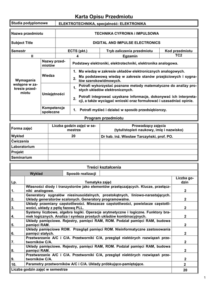 Karta Opisu Przedmiotu Studia podyplomowe ELEKTROTECHNIKA, specjalność: ELEKTRONIKA Nazwa przedmiotu TECHNIKA CYFROWA i IMPULSOWA Subject Title DIGITAL AND IMPULSE ELECTRONICS Semestr ECTS (pkt.) 4 II Nazwy przedmiotów Kod przedmiotu TC2 Podstawy elektroniki, elektrotechniki, elektronika analogowa. 1. Ma wiedzę w zakresie układów elektronicznych analogowych. Ma podstawową wiedzę w zakresie stanów przejściowych i sygna2. łów szerokowidmowych. Potrafi wykorzystać poznane metody matematyczne do analizy pro1. stych układów elektronicznych. Wiedza Wymagania wstępne w zakresie przedmiotu Tryb zaliczenia przedmiotu Egzamin Umiejętności 2. Kompetencje społeczne Potrafi integrować uzyskane informacje, dokonywać ich interpretacji, a także wyciągać wnioski oraz formułować i uzasadniać opinie. 1. Potrafi myśleć i działać w sposób przedsiębiorczy. Program przedmiotu Forma zajęć Liczba godzin zajęć w semestrze Wykład Ćwiczenia Laboratorium Projekt 20 Prowadzący zajęcia (tytuł/stopień naukowy, imię i nazwisko) Dr hab. inż. Wiesław Tarczyński, prof. PO. Seminarium Treści kształcenia Wykład Lp. 1. 2. 3. 4. 5. 6. 7. 8. Sposób realizacji Tematyka zajęć Własności diody i tranzystorów jako elementów przełączających. Klucze, przełączniki analogowe. Generatory sygnałów niesinusoidalnych, prostokątnych, liniowo-narastających. Układy generatorów scalonych. Generatory programowalne. Układy przemiany częstotliwości. Mieszacze częstotliwości, powielacze częstotliwości, układy z pętlą fazową PLL. Systemy liczbowe, algebra logiki. Operacje arytmetyczne i logiczne. Funktory bramek logicznych. Analiza i synteza prostych układów kombinacyjnych. Układy pamięciowe. Rejestry, pamięci RAM, ROM. Podział pamięci RAM, budowa pamięci RAM. Układy pamięciowe ROM. Przegląd pamięci ROM. Nieinformatyczne zastosowania pamięci stałych. Przetwarzanie A/C i C/A. Przetworniki C/A, przegląd niektórych rozwiązań przetworników C/A. Układy pamięciowe. Rejestry, pamięci RAM, ROM. Podział pamięci RAM, budowa pamięci RAM. Przetwarzanie A/C i C/A. Przetworniki C/A, przegląd niektórych rozwiązań przetworników C/A. Parametry przetworników A/C i C/A. Układy próbkująco-pamiętające. 9. 10. Liczba godzin zajęć w semestrze Liczba godzin 2 2 2 2 2 2 2 2 2 2 20 1 Sposoby sprawdzenia zamierzonych efektów kształcenia Zaliczenie w formie egzaminu pisemnego. Zna i rozumie działanie i metodykę projektowania elementów elektronicznych, cyfrowych i impulsowych (W). Zna metody i techniki wykorzystywane w projektowaniu, w 2. tym metody komputerowego wspomagania projektowania układów elektronicznych (W). 3. Zna sposoby pomiaru własności układów cyfrowych i impulsowych (W). 1. Wiedza Efekty kształcenia dla przedmiotu - po zakończonym cyklu kształcenia 4. Wie wiedzę w zakresie oceny niezawodności elementów i układów elektronicznych analogowych i cyfrowych (W). 1. Potrafi tworzyć modele matematyczne i fizyczne elementów elektronicznych (W). Umiejętności Potrafi wykorzystać poznane metody i modele matematycz2. ne elementów w symulacji komputerowej pracy układów elektronicznych analogowych i cyfrowych (W). Kompetencje społeczne 1. Potrafi myśleć i działać w sposób przedsiębiorczy (W). 2. Ma świadomość odpowiedzialności za pracę własną (W). Metody dydaktyczne: Wykład prowadzony przy pomocy prezentacji w formie elektronicznej. Forma i warunki zaliczenia przedmiotu: Zaliczenie w formie egzaminu pisemnego. Literatura podstawowa: [1] PIEŃKOŚ J., TURCZYŃSKI J.: Układy scalone TTL w systemach cyfrowych. WKŁ, 1986. [2] FILIPKOWSKI A.: Układy elektroniczne analogowe i cyfrowe. WNT, 2006. [3] GAJEWSKI P., J. TURCZYŃSKI: Cyfrowe układy scalone MOS. WKŁ, 1990. [4] PRINCE B.: Nowoczesne pamięci półprzewodnikowe. WNT, 1999. [5] BARANOWSKI J., i inni: Układy elektroniczne, cz. III - Układy i systemy cyfrowe. [6] BARANOWSKI J. i inni: Układy elektroniczne, cz. II - Układy analogowe nieliniowe i impulsowe. Literatura uzupełniająca: [1] KALISZ J.: Podstawy elektroniki cyfrowej. WKŁ, 2007. [2] HALKIAS G., J. MILLMAN: Układy scalone analogowe i cyfrowe. [3] POCHOPIEŃ B.: Podstawy techniki cyfrowej w zadaniach. WSzB. 2005. [4] HOLDSWORTH B.: Digital logic design. Oxford, 2006. [5] ODON F.: Zasilanie układów elektronicznych. Zasilacze impulsowe. WNT, 1989. ______________ * niewłaściwe przekreślić ………………………………………………….. ………………………………………………………. (kierownik jednostki organizacyjnej/bezpośredni przełożony: (Dziekan Wydziału pieczęć/podpis pieczęć/podpis) 2 3