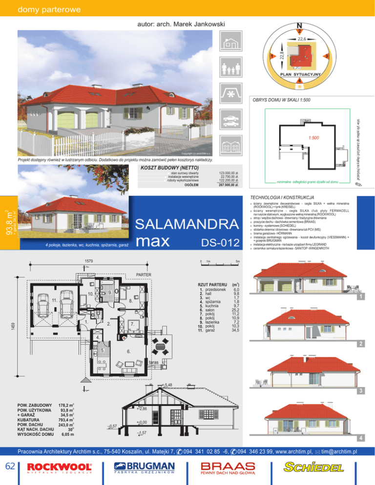 domy parterowe autor: arch. Marek Jankowski N 2 1 22,8 22,6 3 PLAN SYTUACYJNY 4 1:500 Copyright (c) archTIM s.c. Projekt dostêpny równie¿ w lustrzanym odbiciu. Dodatkowo do projektu mo¿na zamówiæ pe³en kosztorys nak³adczy. KOSZT BUDOWY (NETTO) stan surowy otwarty instalacje wewnêtrzne roboty wykoñczeniowe OGÓ£EM 123.000,00 z³. 22.700,00 z³. 122.200,00 z³. 267.900,00 z³. minimalne odleg³oœci granic dzia³ki od domu przerysuj na kalkê i przymierz do mapki syt.-wys. OBRYS DOMU W SKALI 1:500 2 93,8 m2 + garaz 34,5 m TECHNOLOGIA I KONSTRUKCJA SALAMANDRA max 4 pokoje, ³azienka, wc, kuchnia, spi¿arnia, gara¿ 1579 DS-012 0 1m œciany zewnêtrzne dwuwarstwowe - ceg³a SILKA + we³na mineralna (ROCKWOOL) + tynk (KREISEL) œciany wewnêtrzne - ceg³a SILKA i/lub p³yty FERMACELL na ruszcie stalowym, wyg³uszone we³n¹ mineraln¹ (ROCKWOOL) strop / wiêŸba dachowa - drewniany / tradycyjna drewniana poszycie dachu - dachówka cementowa (BRAAS) kominy - systemowe (SCHIEDEL) stolarka okienna i drzwiowa - drewniana lub PCV (MS) brama gara¿owa - HÖ RMANN instalacja centralnego ogrzewania - kocio³ dwufunkcyjny (VIESSMANN) + + grzejniki BRUGMAN instalacja elektryczna - na bazie urz¹dzeñ firmy LEGRAND ceramika i armatura ³azienkowa - SANITOP -WINGENROTH 5m PARTER 11. 1459 9. 10. 1. RZUT PARTERU 1. przedsionek 2. hall 3. wc 4. spi¿arnia 5. kuchnia 6. salon 7. pokój 8. pokój 9. ³azienka 10. pokój 11. gara¿ 8. 3. 2. 7. (m2) 6,0 9,8 1,7 1,8 9,7 25,2 11,2 10,9 7,2 10,3 34,5 1 4. 2 5. 6. taras + 5,48 2 POW. ZABUDOWY 178,2 m 2 POW. U¯YTKOWA 93,8 m + GARA¯ 34,5 m2 3 KUBATURA 793,4 m POW. DACHU 243,0 m2 O K¥T NACH. DACHU 30 WYSOKOŒÆ DOMU 6,05 m + 2,86 - 0,57 + 0,00 - 1,57 Pracownia Architektury Archtim s.c., 75-540 Koszalin, ul. Matejki 7, 62 3 4 094 341 02 85 -6, 094 346 23 99, www.archtim.pl, [email protected]