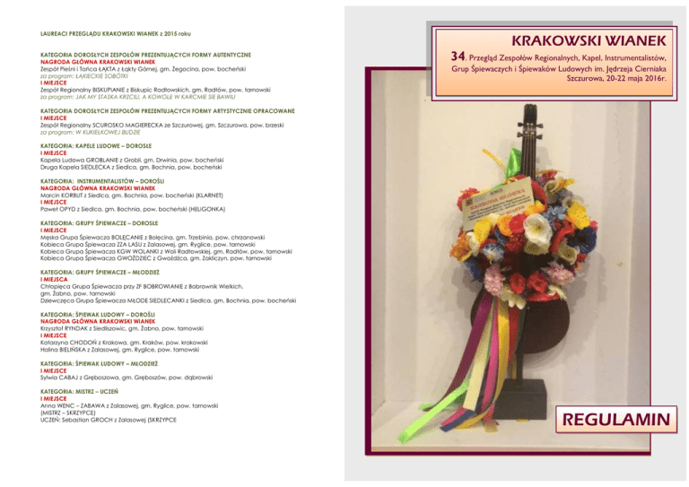 LAUREACI PRZEGLĄDU KRAKOWSKI WIANEK z 2015 roku KATEGORIA DOROSŁYCH ZESPOŁÓW PREZENTUJĄCYCH FORMY AUTENTYCZNE NAGRODA GŁÓWNA KRAKOWSKI WIANEK Zespół Pieśni i Tańca ŁĄKTA z Łąkty Górnej, gm. Żegocina, pow. bocheński za program: ŁĄKIECKIE SOBÓTKI I MIEJSCE Zespół Regionalny BISKUPIANIE z Biskupic Radłowskich, gm. Radłów, pow. tarnowski za program: JAK MY STASKA KRZCILI, A KOWOLE W KARCMIE SIE BAWILI KRAKOWSKI WIANEK 34. Przegląd Zespołów Regionalnych, Kapel, Instrumentalistów, Grup Śpiewaczych i Śpiewaków Ludowych im. Jędrzeja Cierniaka Szczurowa, 20-22 maja 2016r. KATEGORIA DOROSŁYCH ZESPOŁÓW PREZENTUJĄCYCH FORMY ARTYSTYCZNIE OPRACOWANE I MIEJSCE Zespół Regionalny SCUROSKO MAGIERECKA ze Szczurowej, gm. Szczurowa, pow. brzeski za program: W KUKIEŁKOWEJ BUDZIE KATEGORIA: KAPELE LUDOWE – DOROSŁE I MIEJSCE Kapela Ludowa GROBLANIE z Grobli, gm. Drwinia, pow. bocheński Druga Kapela SIEDLECKA z Siedlca, gm. Bochnia, pow. bocheński KATEGORIA: INSTRUMENTALISTÓW – DOROŚLI NAGRODA GŁÓWNA KRAKOWSKI WIANEK Marcin KORBUT z Siedlca, gm. Bochnia, pow. bocheński (KLARNET) I MIEJSCE Paweł OPYD z Siedlca, gm. Bochnia, pow. bocheński (HELIGONKA) KATEGORIA: GRUPY ŚPIEWACZE – DOROSŁE I MIEJSCE Męska Grupa Śpiewacza BOLĘCANIE z Bolęcina, gm. Trzebinia, pow. chrzanowski Kobieca Grupa Śpiewacza ZZA LASU z Zalasowej, gm. Ryglice, pow. tarnowski Kobieca Grupa Śpiewacza KGW WOLANKI z Woli Radłowskiej, gm. Radłów, pow. tarnowski Kobieca Grupa Śpiewacza GWOŹDZIEC z Gwoźdźca, gm. Zakliczyn, pow. tarnowski KATEGORIA: GRUPY ŚPIEWACZE – MŁODZIEŻ I MIEJSCA Chłopięca Grupa Śpiewacza przy ZF BOBROWIANIE z Bobrownik Wielkich, gm. Żabno, pow. tarnowski Dziewczęca Grupa Śpiewacza MŁODE SIEDLECANKI z Siedlca, gm. Bochnia, pow. bocheński KATEGORIA: ŚPIEWAK LUDOWY – DOROŚLI NAGRODA GŁÓWNA KRAKOWSKI WIANEK Krzysztof RYNDAK z Siedliszowic, gm. Żabno, pow. tarnowski I MIEJSCE Katarzyna CHODOŃ z Krakowa, gm. Kraków, pow. krakowski Halina BIELIŃSKA z Zalasowej, gm. Ryglice, pow. tarnowski KATEGORIA: ŚPIEWAK LUDOWY – MŁODZIEŻ I MIEJSCE Sylwia CABAJ z Gręboszowa, gm. Gręboszów, pow. dąbrowski KATEGORIA: MISTRZ – UCZEŃ I MIEJSCE Anna WENC – ZABAWA z Zalasowej, gm. Ryglice, pow. tarnowski (MISTRZ – SKRZYPCE) UCZEŃ: Sebastian GROCH z Zalasowej (SKRZYPCE REGULAMIN I. 1. 2. 3. 4. 5. II. CELE IMPREZY Ochrona, popularyzacja i dokumentacja folkloru regionu Krakowiaków Wschodnich, Zachodnich oraz Pogórza Ciężkowickiego. Doskonalenie warsztatu merytorycznego instruktorów ruchu regionalnego. Konfrontacja i ocena dorobku artystycznego zespołów regionalnych, kapel ludowych, instrumentalistów, grup śpiewaczych i regionalnych, śpiewaków ludowych oraz mistrzów i ich uczniów. Wzbogacenie oferty kulturalnej Małopolski. Kwalifikacja najlepszych wykonawców na Ogólnopolski Konkurs Gawędziarzy, Instrumentalistów, Śpiewaków, Drużbów i Starostów Weselnych SABAŁOWE BAJANIA w Bukowinie Tatrzańskiej, Małopolski Przegląd Obrzędów, Obyczajów i Zwyczajów Ludowych POGÓRZAŃSKIE GODY w Łużnej oraz na Ogólnopolski Festiwal Kapel i Śpiewaków Ludowych w Kazimierzy Dolnym nad Wisłą. UCZESTNICY 1. Przegląd ma charakter konkursu, w którym uczestniczą wykonawcy z województwa małopolskiego, prezentując wyłącznie folklor regionu Krakowiaków Wschodnich, Zachodnich i Pogórza Ciężkowickiego. 2. Kategorie wiekowe uczestników: 3. 4. Dopuszcza się udział dzieci i młodzieży w kategorii mistrz - uczeń. Uczestnicy oceniani będą w następujących kategoriach: zespołów prezentujących folklor w formie autentycznej, zespołów prezentujących folklor w formie artystycznie opracowanej, grup regionalnych (nie będących systematycznie działającymi zespołami folklorystycznymi), kapel ludowych, instrumentalistów ludowych, grup śpiewaczych, solistów – śpiewaków, mistrza i ucznia III. 14 – 17 lat - młodzieżowa od 18 lat wzwyż - dorosła ORGANIZATORZY: Małopolskie Centrum Kultury SOKÓŁ w Nowym Sączu Biuro Organizacyjne w Tarnowie Rynek 16, 33-100 Tarnów tel. 18/53 40 685 e-mail:[email protected], [email protected] www.mcksokol.pl Gminne Centrum Kultury, Czytelnictwa i Sportu Rynek 4, 32-820 Szczurowa tel. 14/671 44 46 e-mail: [email protected] www.gck-szczurow.pl KRYTERIA OCENY POSZCZEGÓLNYCH KATEGORII Jury powołane przez Małopolskie Centrum Kultury SOKÓŁ w Nowym Sączu będzie brało pod uwagę następujące kategorie i kryteria oceny: zespół w formie autentycznej zespół prezentuje folkloru własnego regionu etnograficznego, przebieg programu zgodny z ludową obyczajowością i prawami sceny, obowiązuje tradycyjny strój i ubiór ludowy względnie wykonany według dawnych wzorów, dotyczy to również uczesania i rekwizytów, przestrzeganie regulaminowego czasu prezentacji, ogólny wyraz artystyczny, muzyka, instrumenty ludowe i tańce winny być prezentowane zgodnie z tradycją regionu (zespołowi towarzyszy „żywa muzyka", nie dopuszcza się stosowania instrumentów mechanicznych). użycie niezgodnych z tradycją instrumentów (akordeonu itp.) eliminuje zespół w ubieganiu się o nagrodę główną KRAKOWSKI WIANEK i PIERWSZE miejsce. Bardziej oczekiwaną i właściwszą formą prezentacji przy ocenie zespołów będą programy ukazujące zwyczaje i obrzędy, ale nie przekraczające czasowo 1/3 całości programu. Czas występu do 30 minut Uwaga!! LAUREACI nagrody głównej KRAKOWSKIEGO WIANKA oraz pierwszych miejsc z 2015 nie mogą wziąć udziału w Konkursie w 2016 roku. fot. Mateusz Rompała opracowanie graficzne: Beata Rompała Urząd Gminy Szczurowa ul. Lwowska 2, 32-820 Szczurowa tel.14/671 44 55, 671 40 44; fax. 14/671 45 05 e-mail: [email protected] www.szczurowa.pl V. zespół w formie artystycznie opracowanej PRZEPISY OGÓLNE 1. Wszystkie prezentacje konkursowe omówione zostaną z instruktorami na zorganizowanych w tym celu spotkaniach warsztatowych. O terminie i godzinie spotkan
